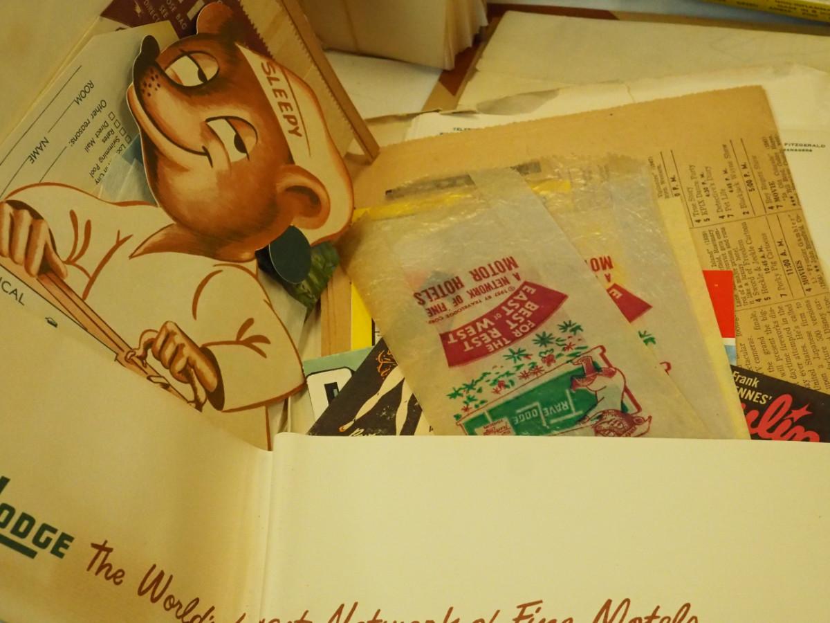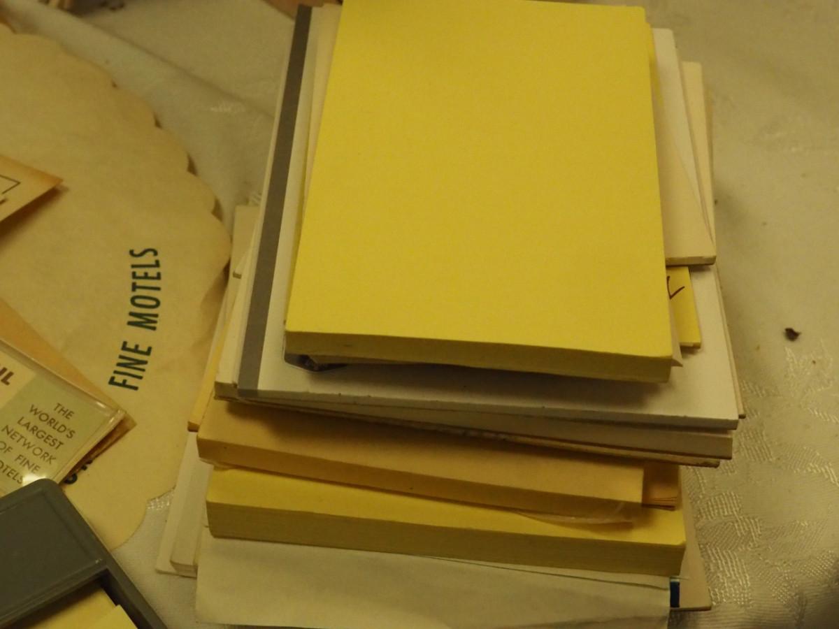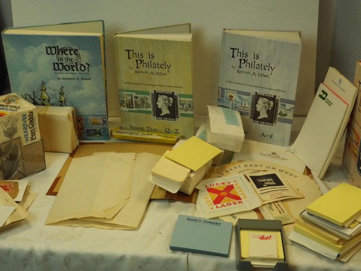 Lot 140- stamps, encyclopedia books, vintage memo pads, Travel ephemera. Hotel fliers, 1950s 60s hotel memorabilia,