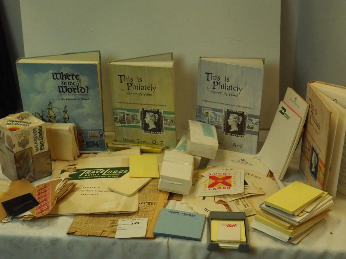 Lot 140- stamps, encyclopedia books, vintage memo pads, Travel ephemera