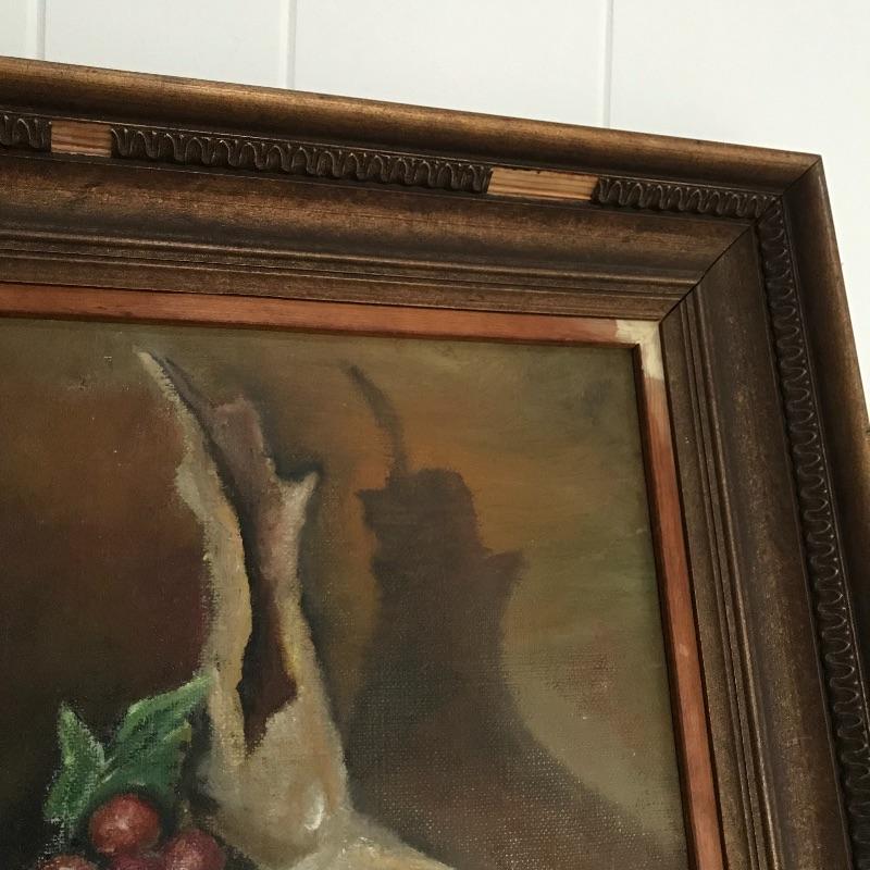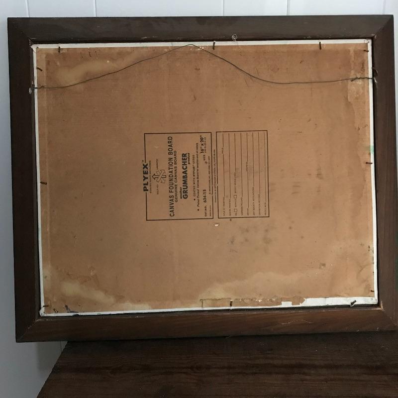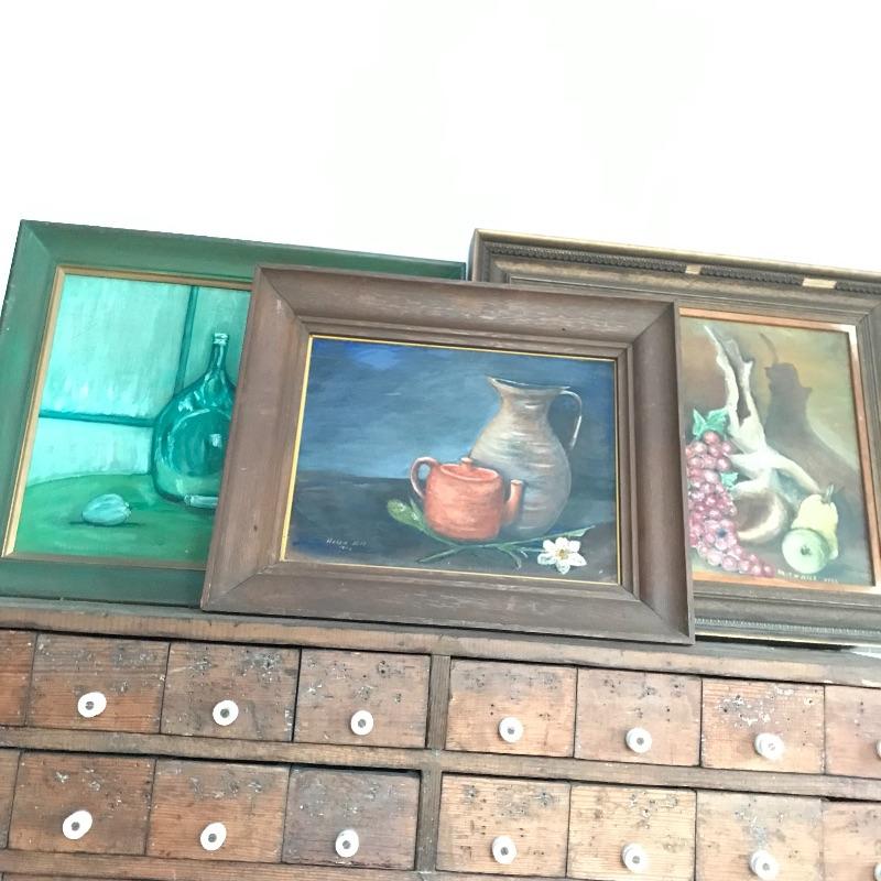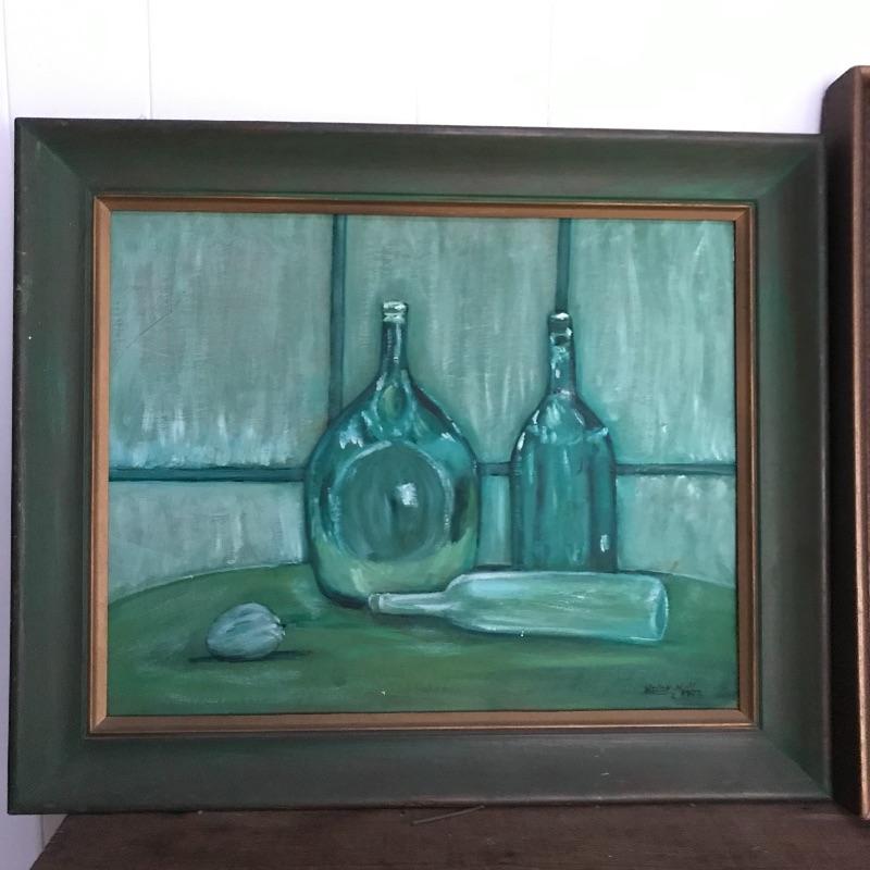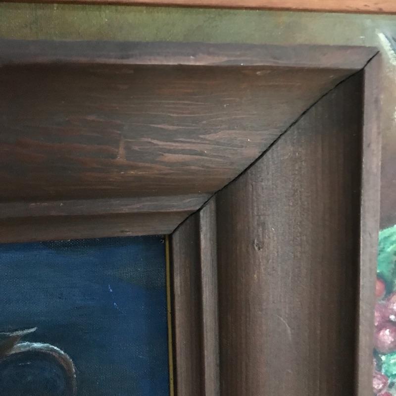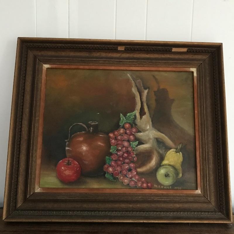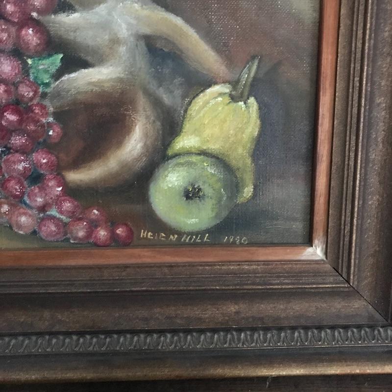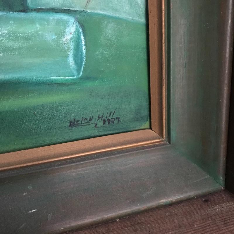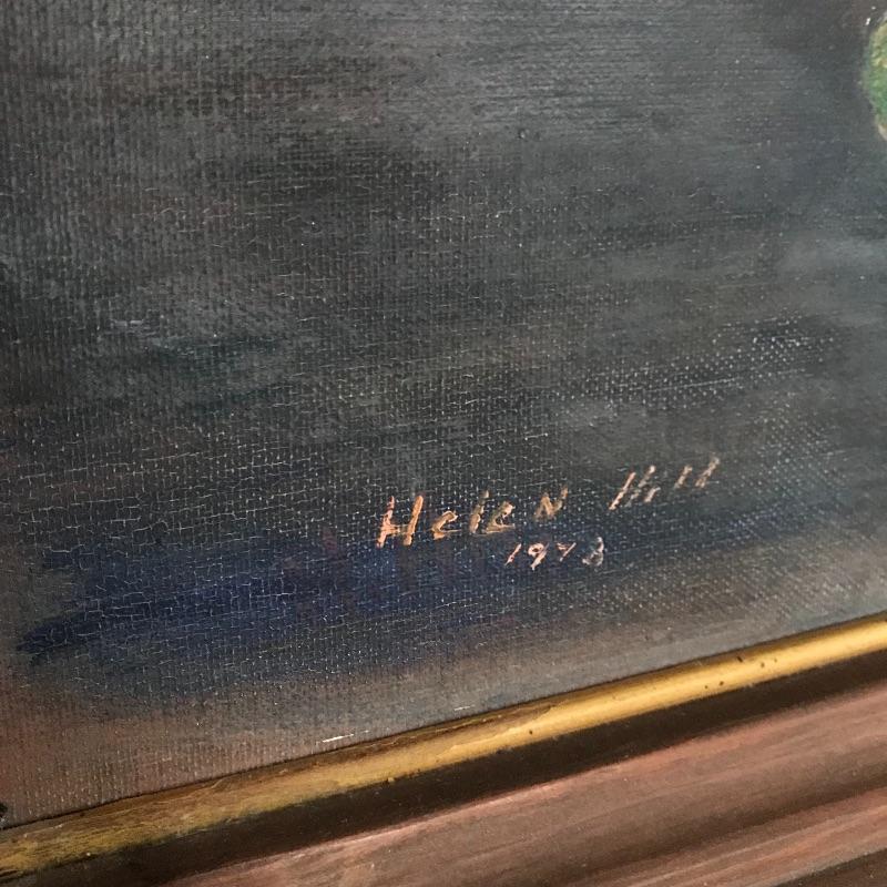 Three signed and dated paintings by Mrs. Helen Hill. All three are beautiful and appear to have been painted on canvas. The two smallest ones have very similar frames, one has been washed with green paint. The largest frame measures approximately 25.5” x 21.5” and has some blemishes on the frame, see photos. No shipping.