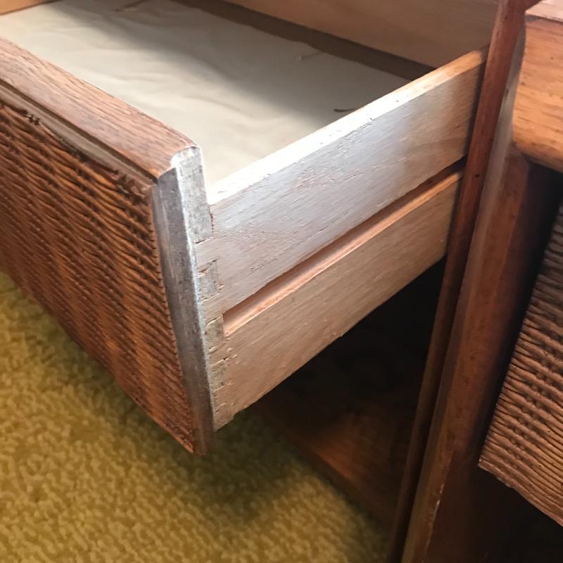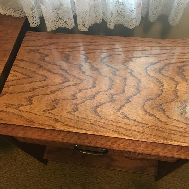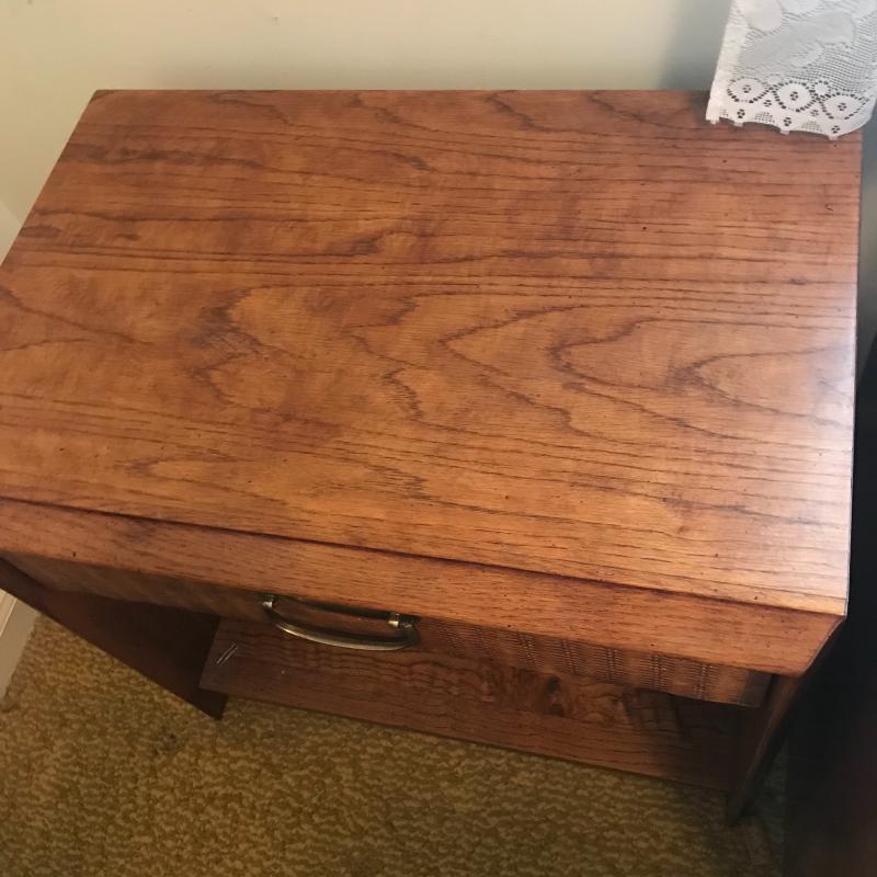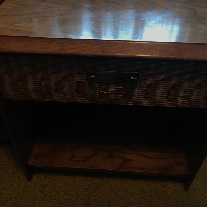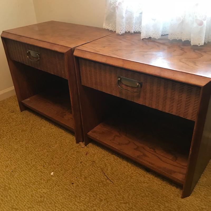 Manufactured wood but solid pieces with wicker accent on front of drawers. Each measures 24” x16” x22”. Local pick up only.
