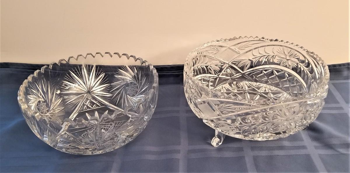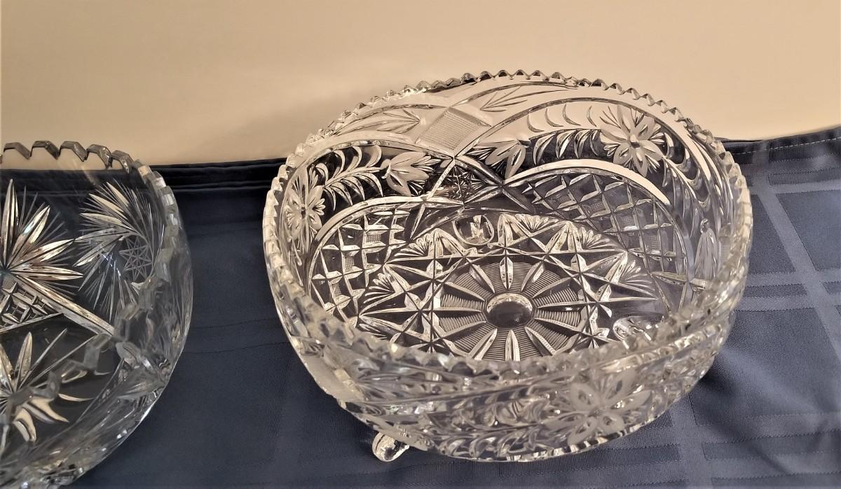 Two nice lead crystal bowls here - both in good condition and very pretty. The one on feet is 8.25" across and 4.5" tall - the other is 8" across and 3.5" tall.