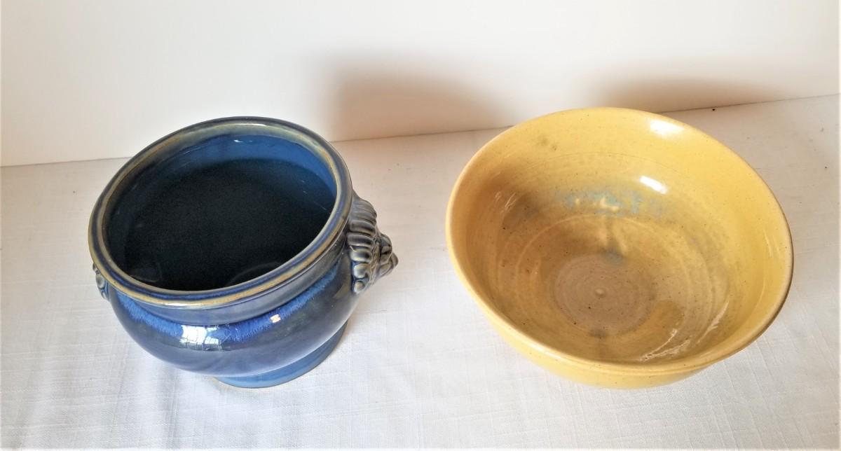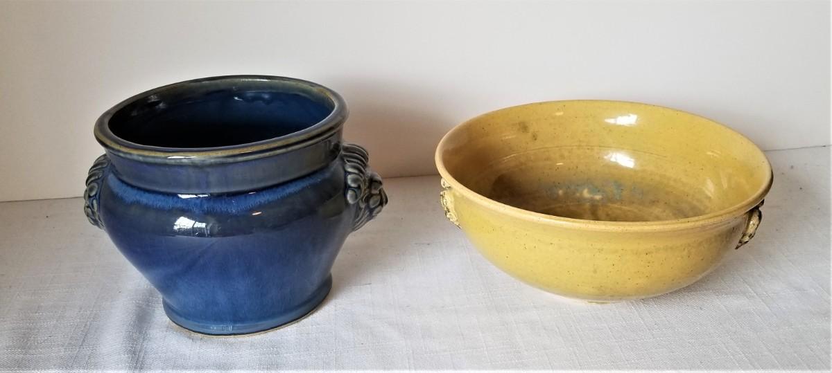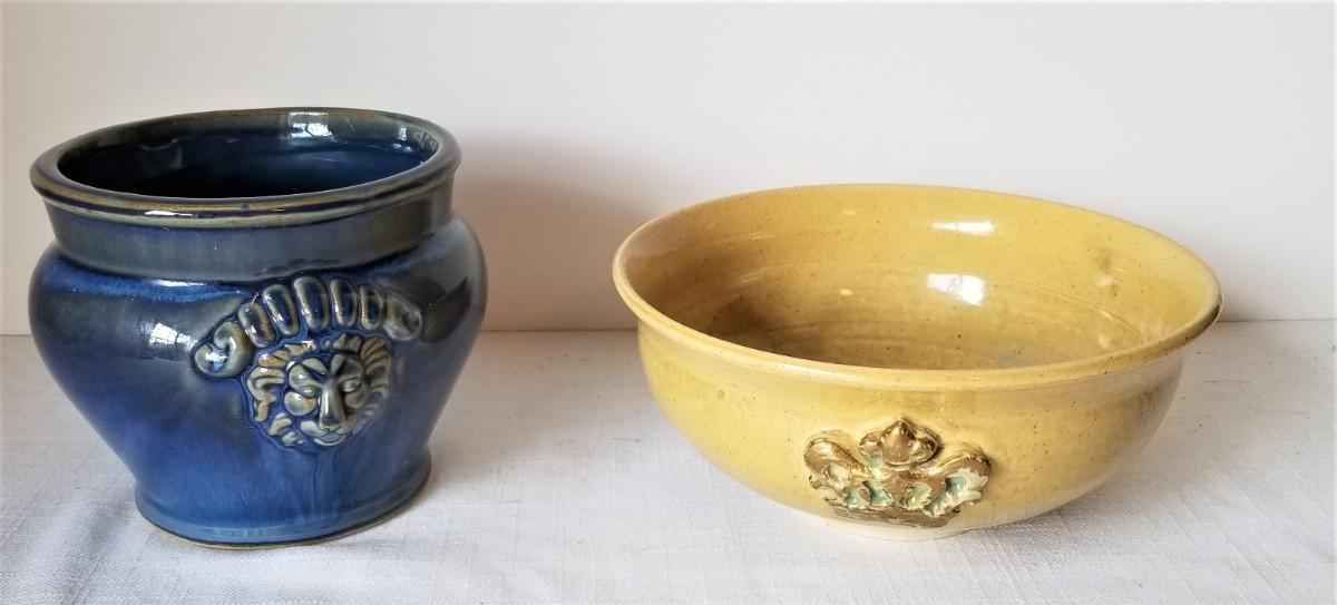 Two very nice pieces of studio pottery. Yellow bowl has a crown design - 6.75" across and 3" tall. Blue bowl sports a Lion's head and is 4.5" tall. Both in good condition.