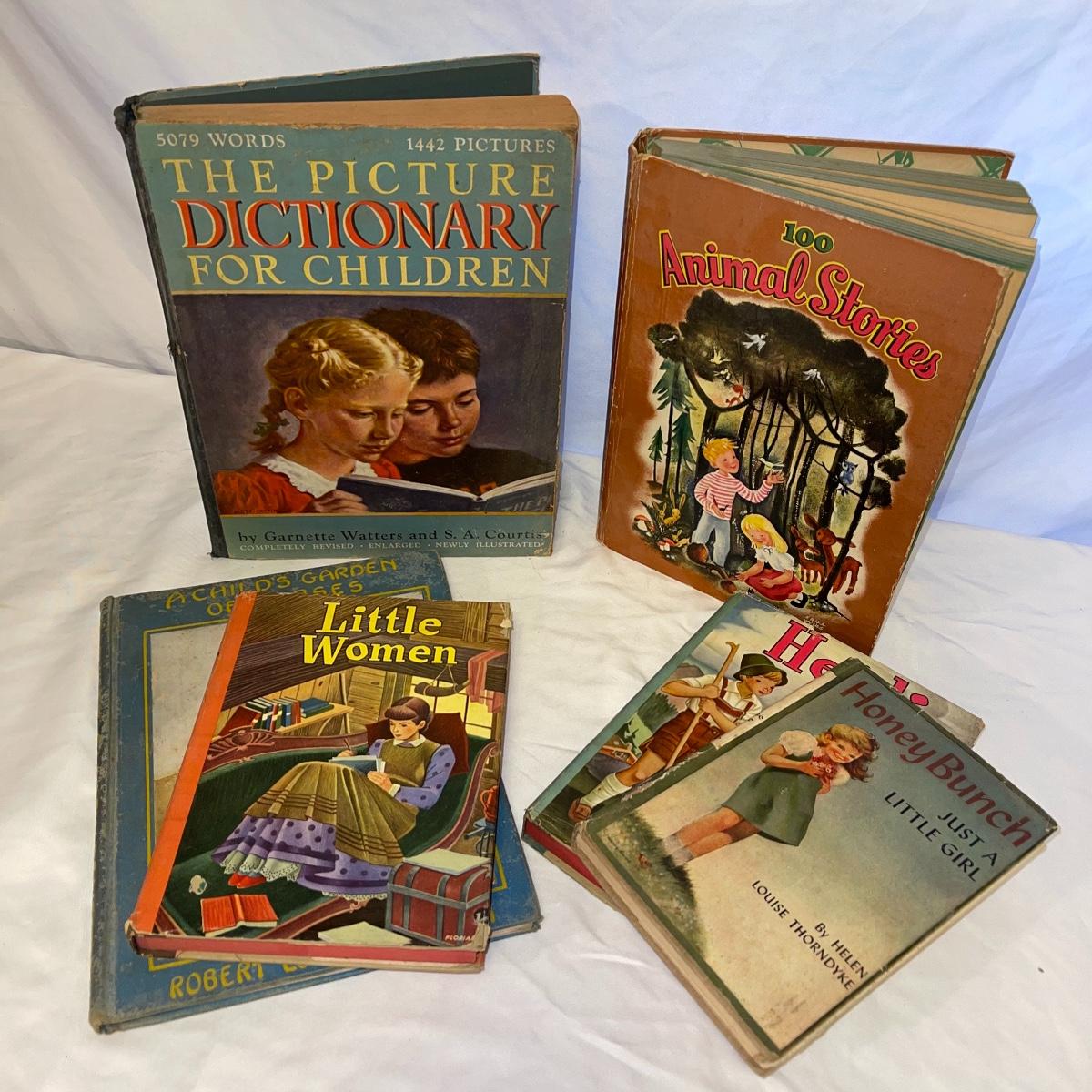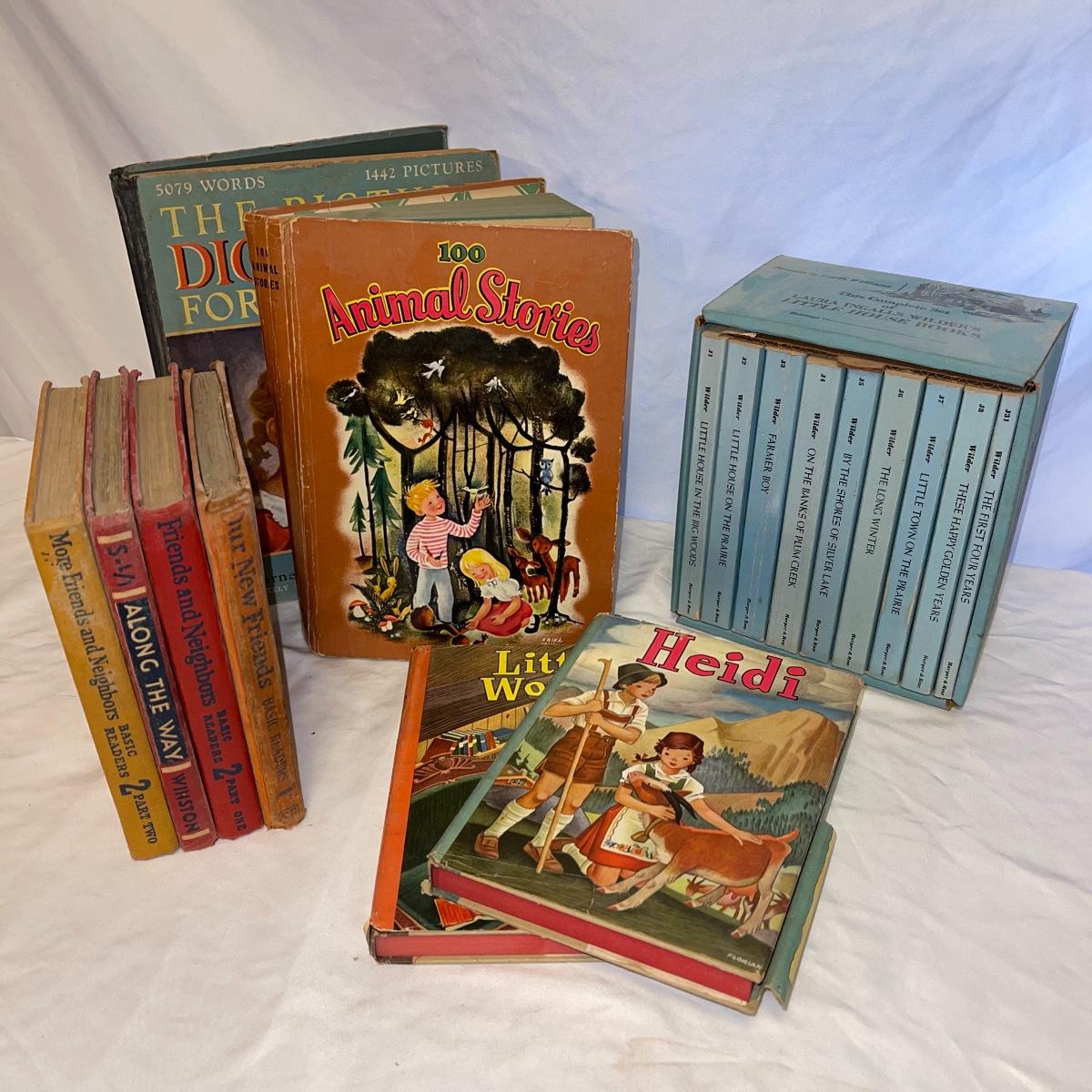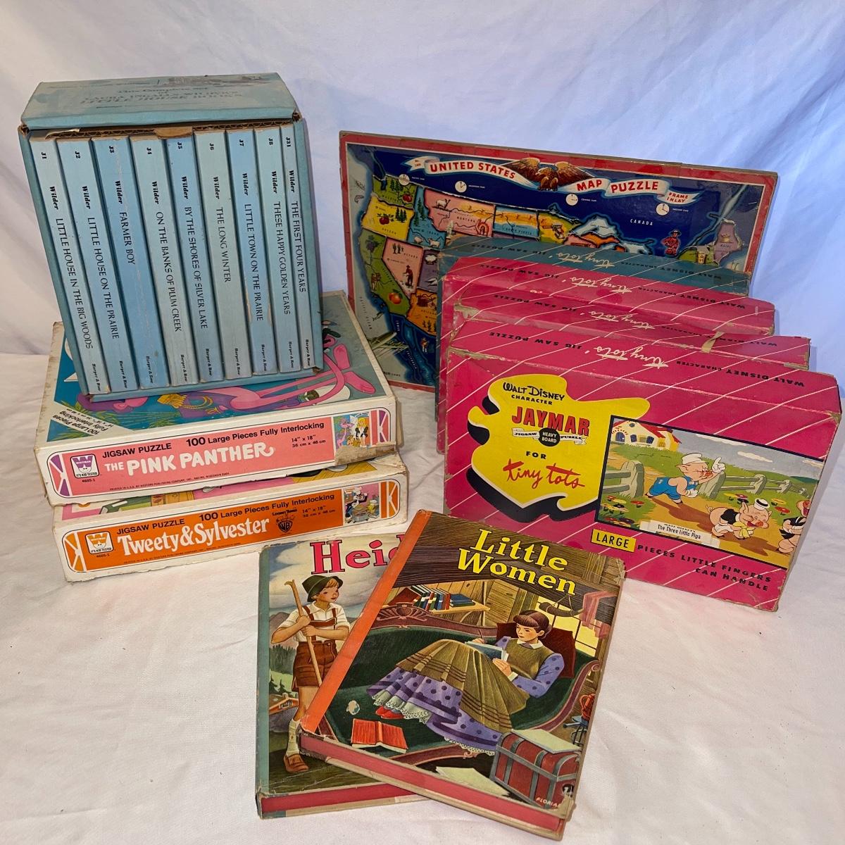 Group of various puzzles and vintage children’s book, both learning and classic books. Titles include “Little Women”, “Heidi”, and a “Little House on the Prairie” box set of nine books. There are five flat puzzles, three of which are Whitman puzzles. Two other boxed Whitman puzzles are also in this lot, with the themes of Pink Panther and Tweety and Sylvester. There are four Walt Disney Jaymar boxed puzzles as well. Clearly we can't guarantee all puzzle pieces are in the boxes. Local pick up.