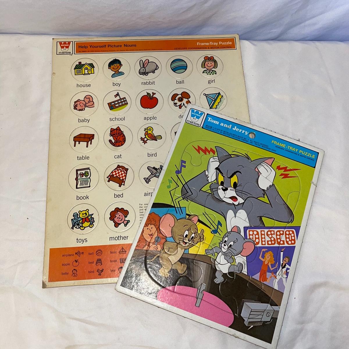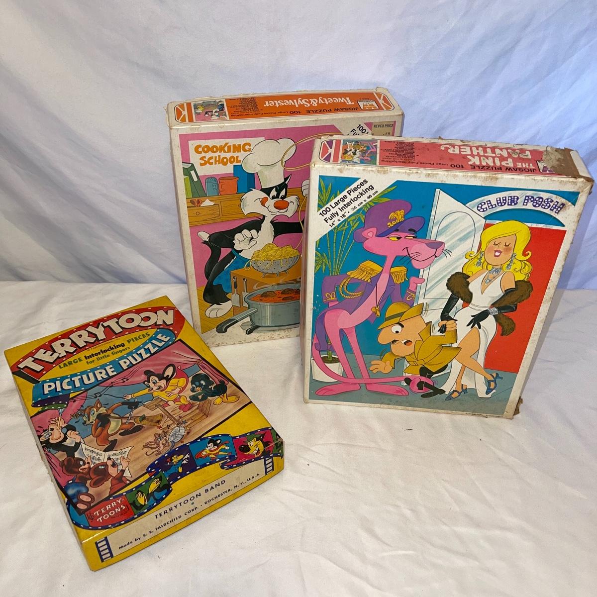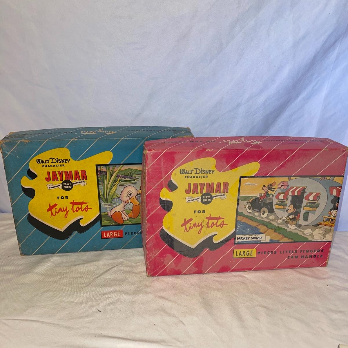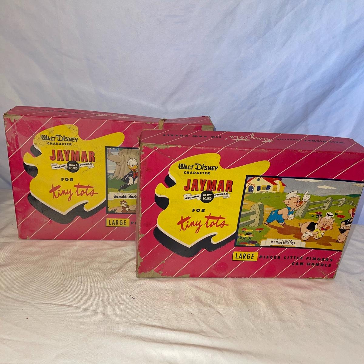 Group of various puzzles and vintage children’s book, both learning and classic books. Titles include “Little Women”, “Heidi”, and a “Little House on the Prairie” box set of nine books. There are five flat puzzles, three of which are Whitman puzzles. Two other boxed Whitman puzzles are also in this lot, with the themes of Pink Panther and Tweety and Sylvester. There are four Walt Disney Jaymar boxed puzzles as well. Clearly we can't guarantee all puzzle pieces are in the boxes. Local pick up.