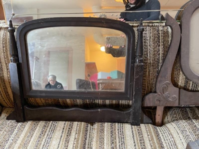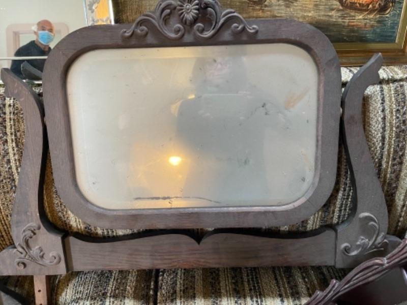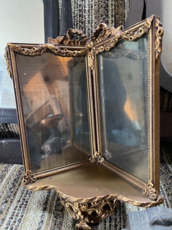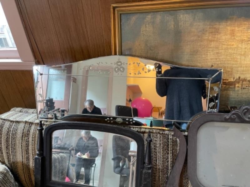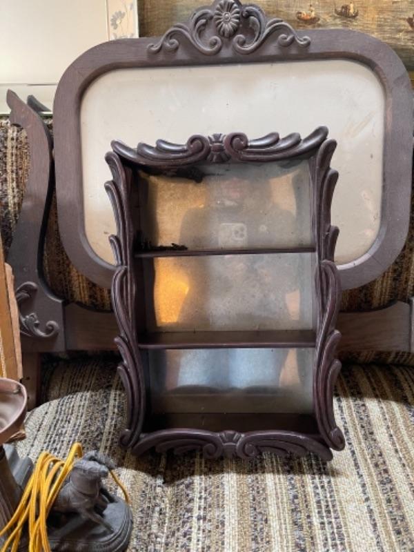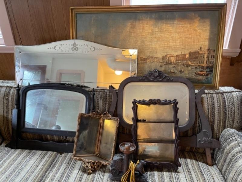 Lot 140. Vintage horse and carriage lamp, vintage shelf, dresser mirrors, art (42” x 22.5”), vanity mirror (36’ x 16”)--$50