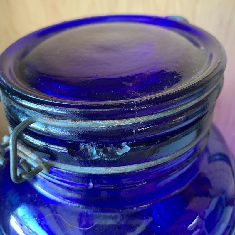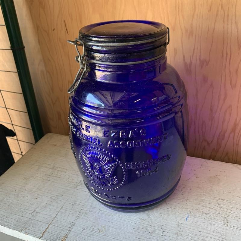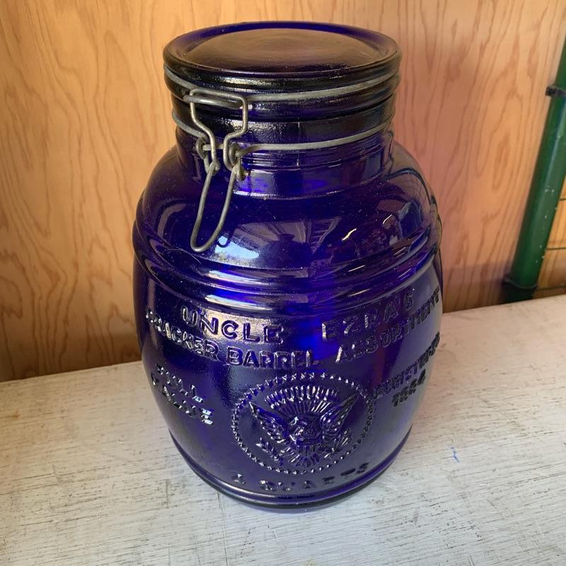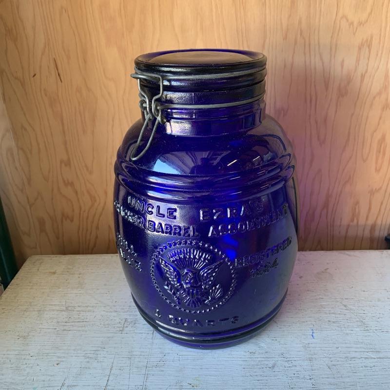 Vintage Uncle Ezras Cracker Barrel 4 Quart Cobalt Blue Cookie Jar (see photo 5 for small chip)
