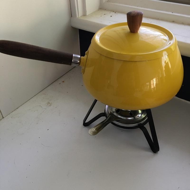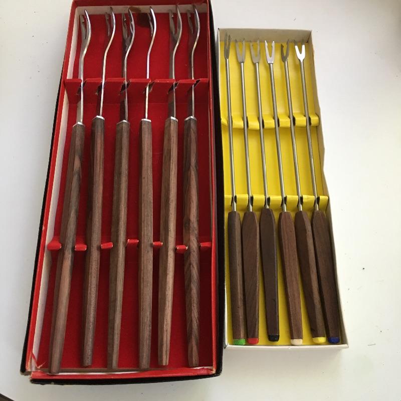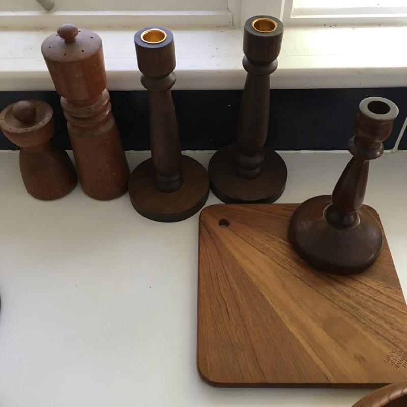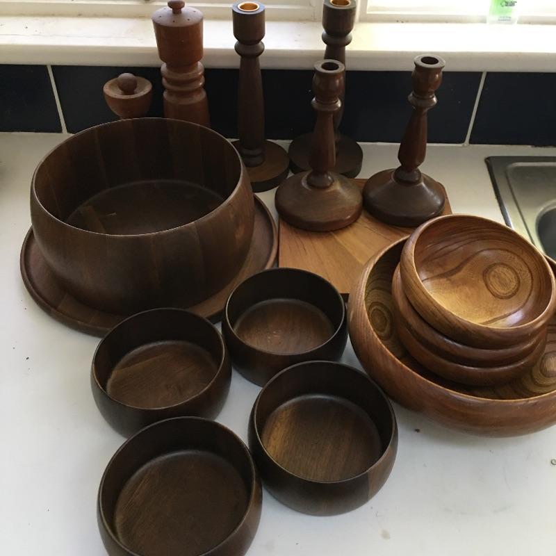 Walnut salad set and more. Lot includes walnut salad set that has four small bowls and large salad bowl, walnut tray, two pairs of candle stick holders, Dansk cutting board, salt and pepper grinders, fondue forks with fondue pot and three small bowls with larger bowl. Shipping available.