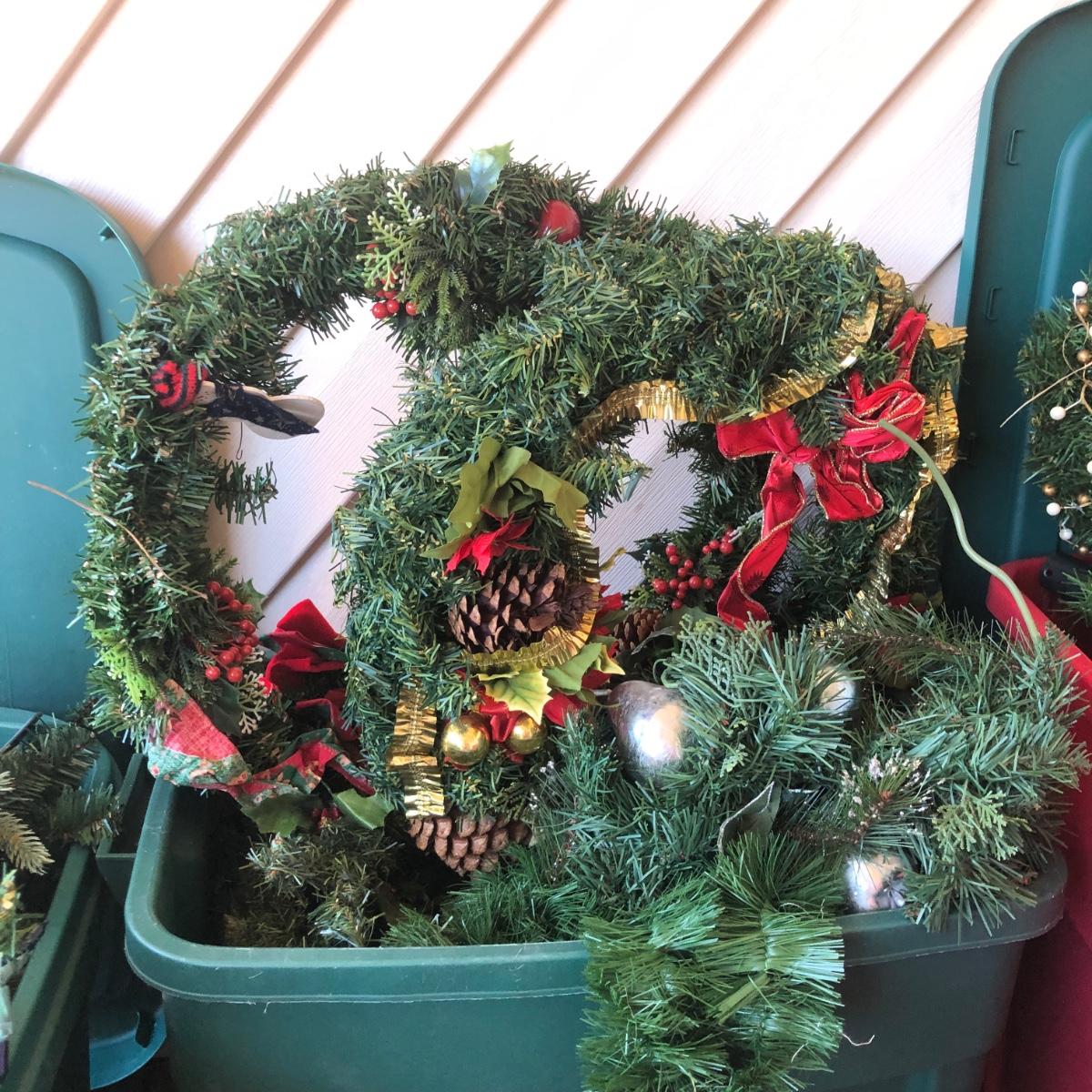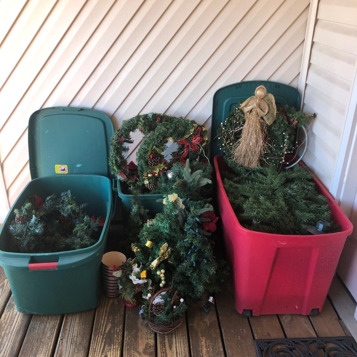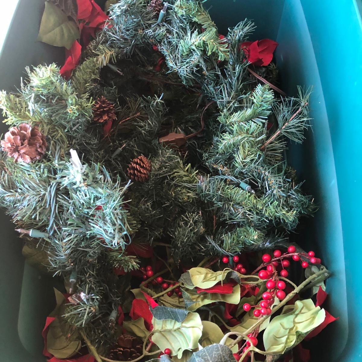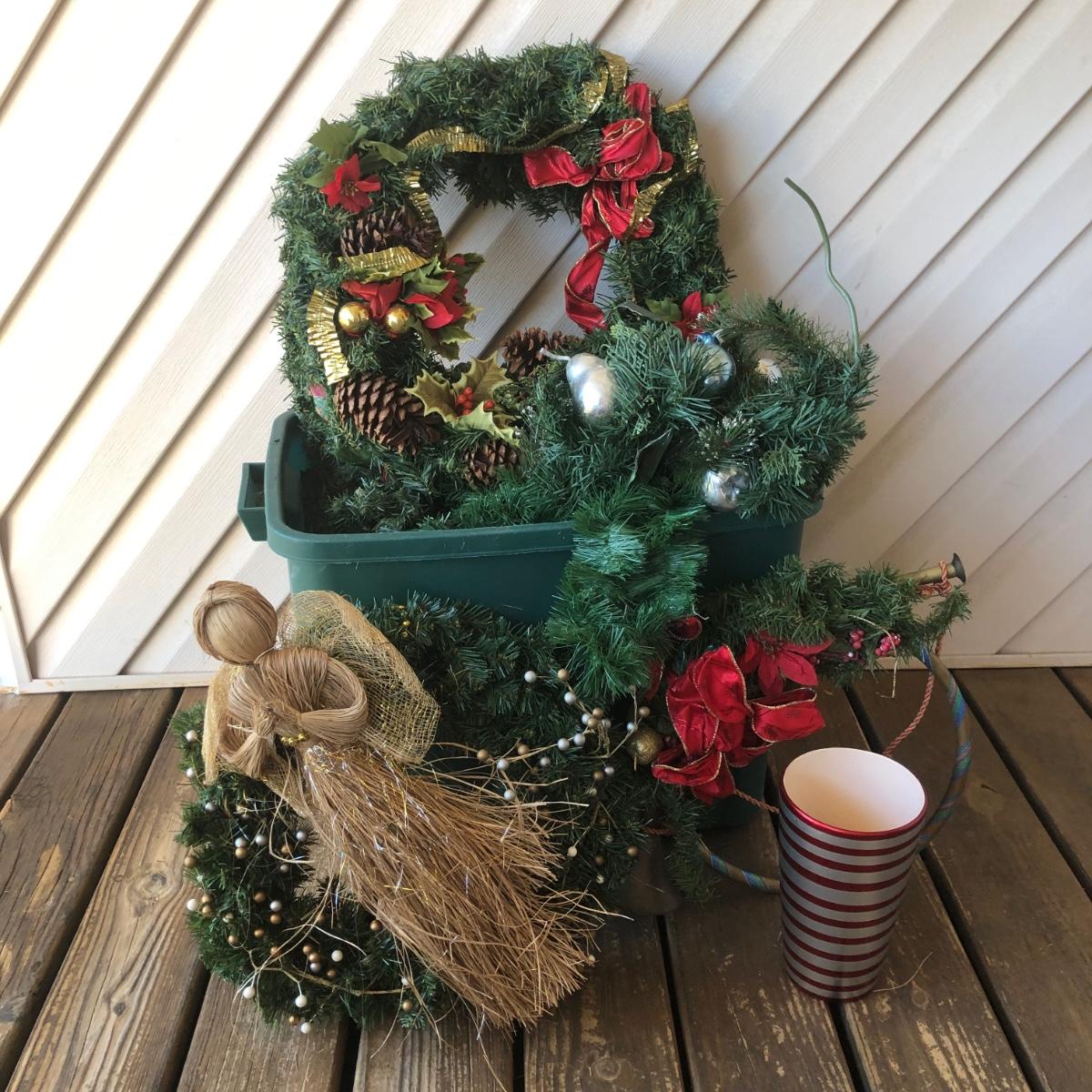 LOT 140M: Christmas Decor Collection - 8' Artificial Tree, Smaller Trees, Various Wreaths & Garland, Nativity Set