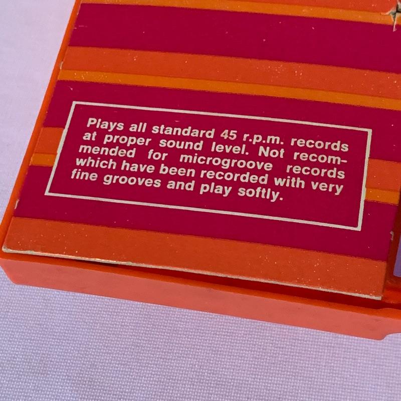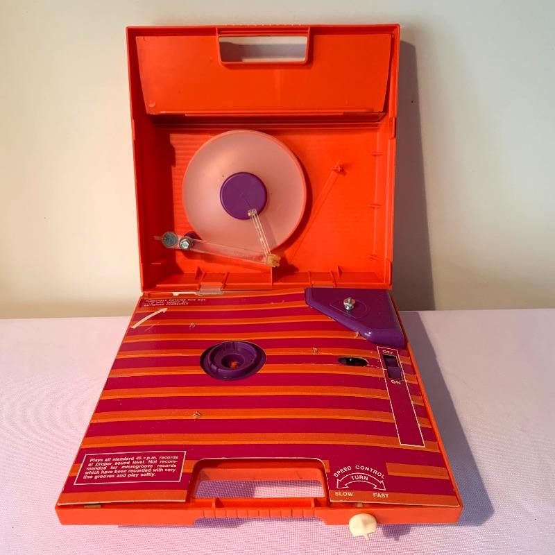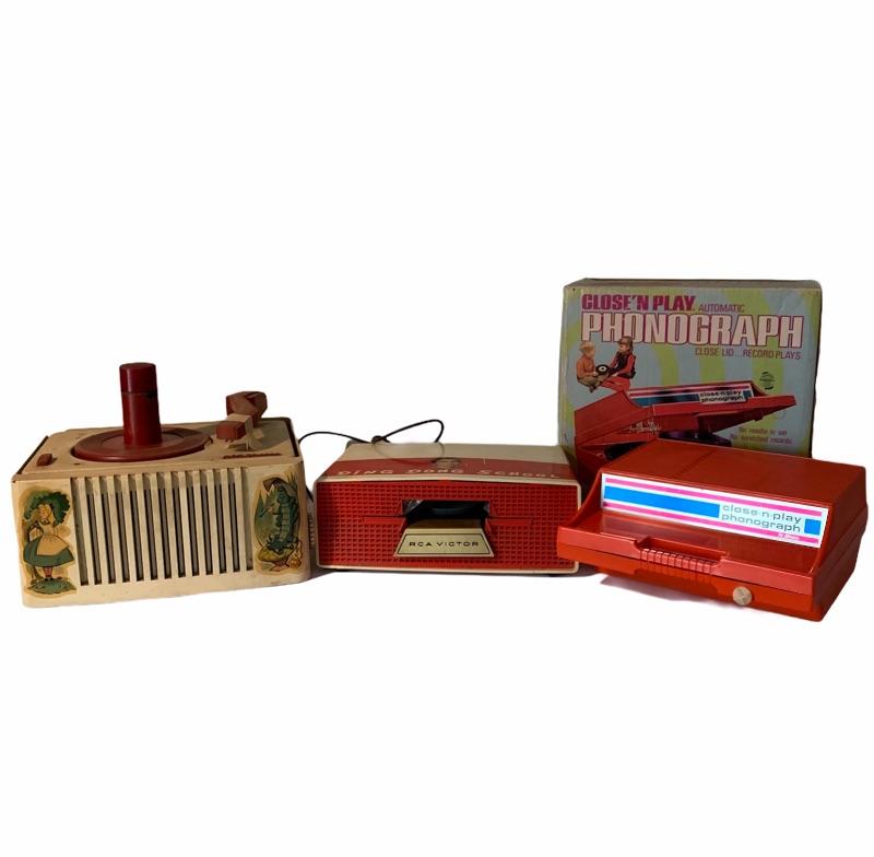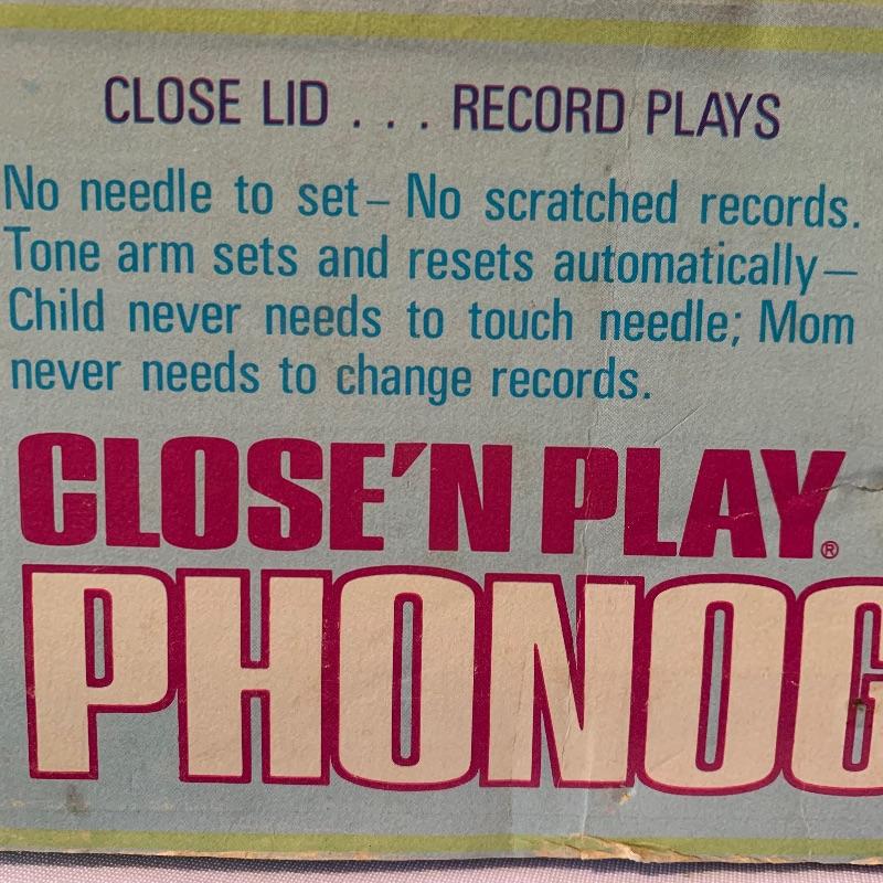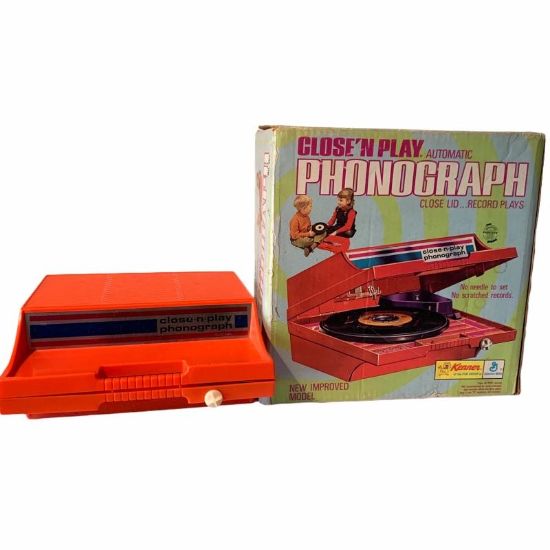 This lot comes with three neat vintage kids’ record players. 1) One is a Kenner/General Mills brand Close’N Play Automatic Phonograph from 1971 that comes in the original box. Model no. 867. It is battery operated and appears to be in excellent condition.