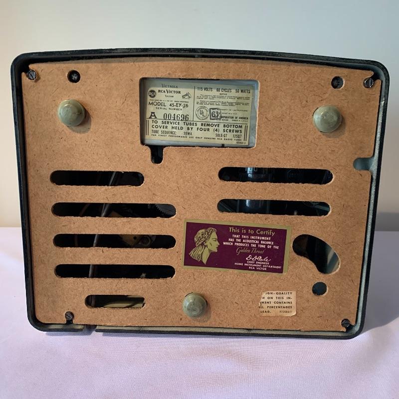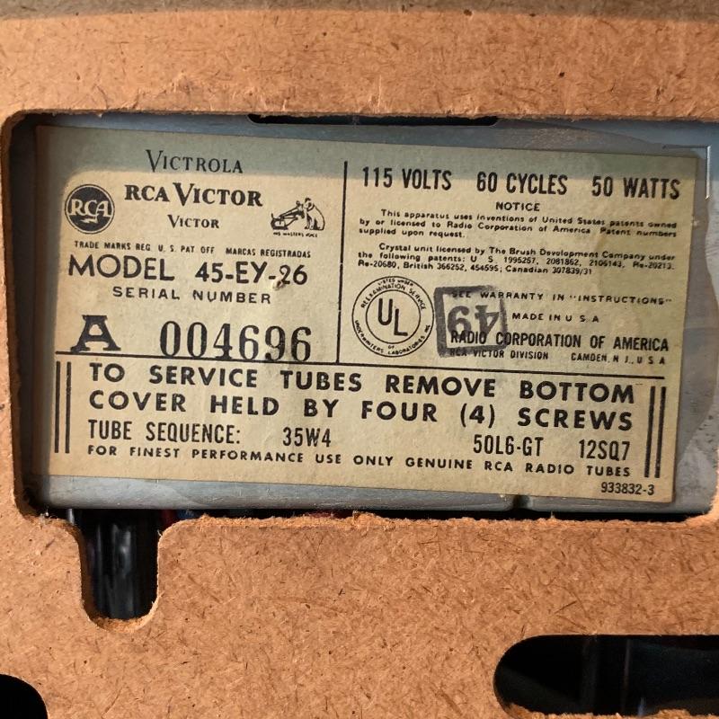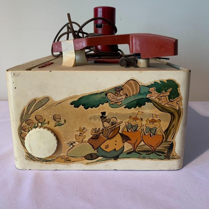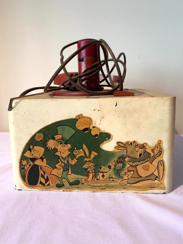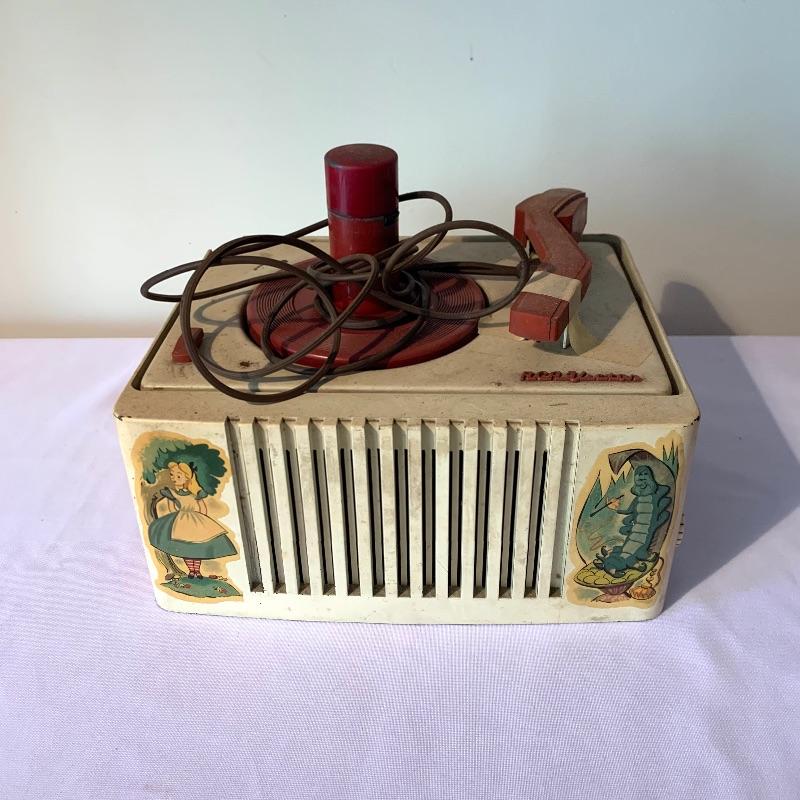 2) The next one is a Victrola RCA Victor Children’s Record Player decorated with Alice in Wonderland images. The label shows Model no. 45-EY-26 and that it is made in the USA. It has an electric plug and powers on when plugged in. According to the label, it has radio tubes.