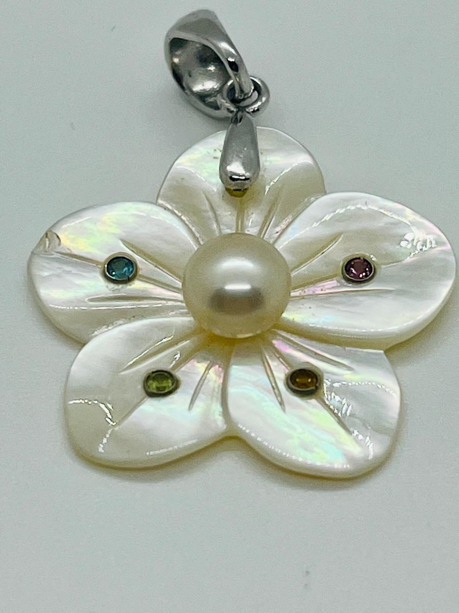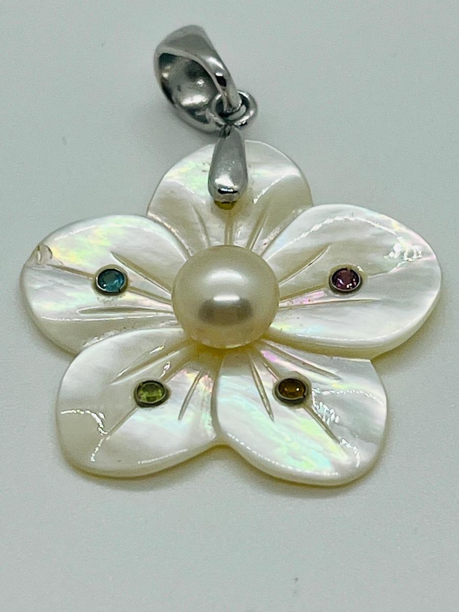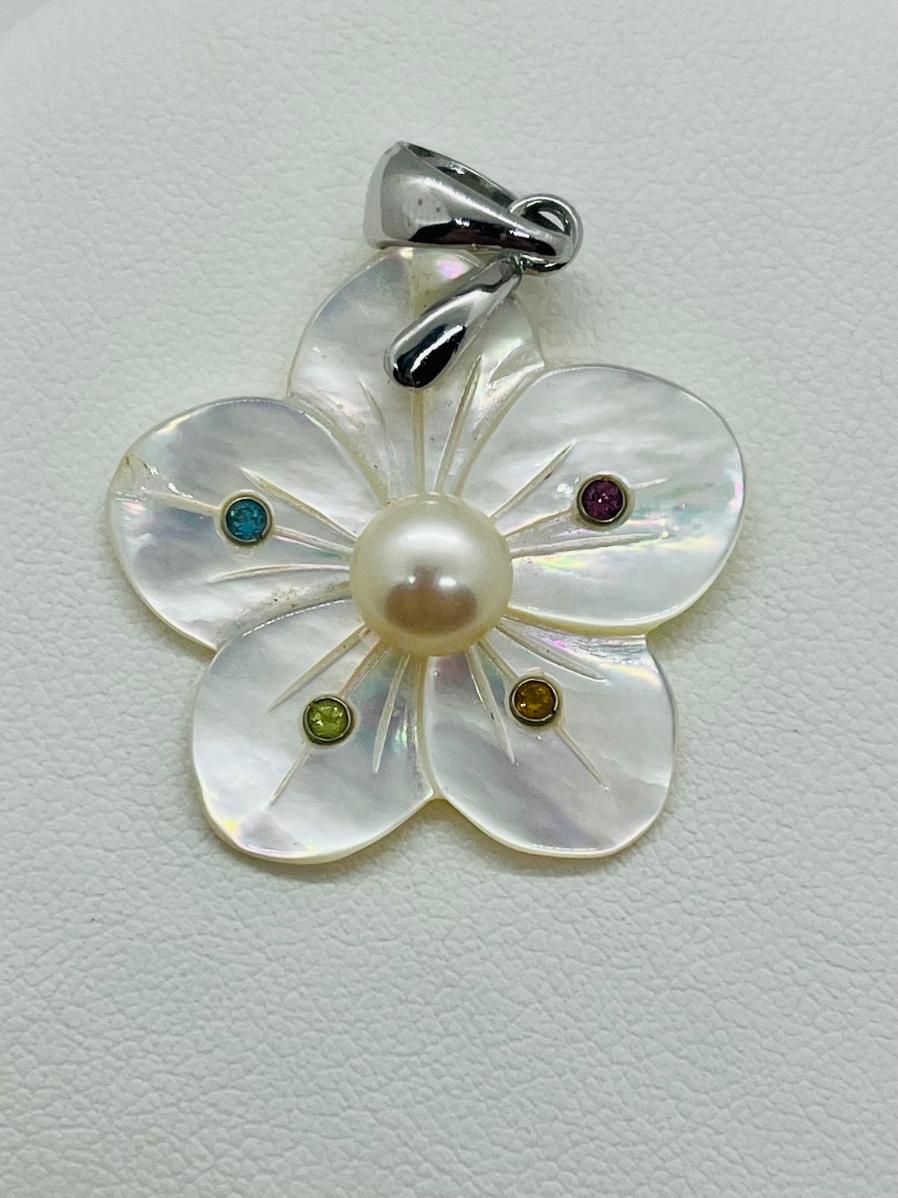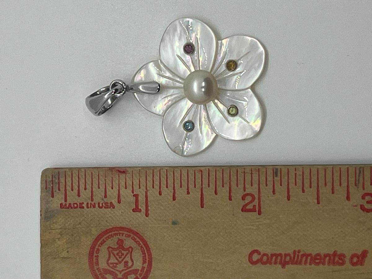 Lot 141: Mother of Pearl Flower with Cultured Pearl Center, Inset Gemstones, & Sterling Bail