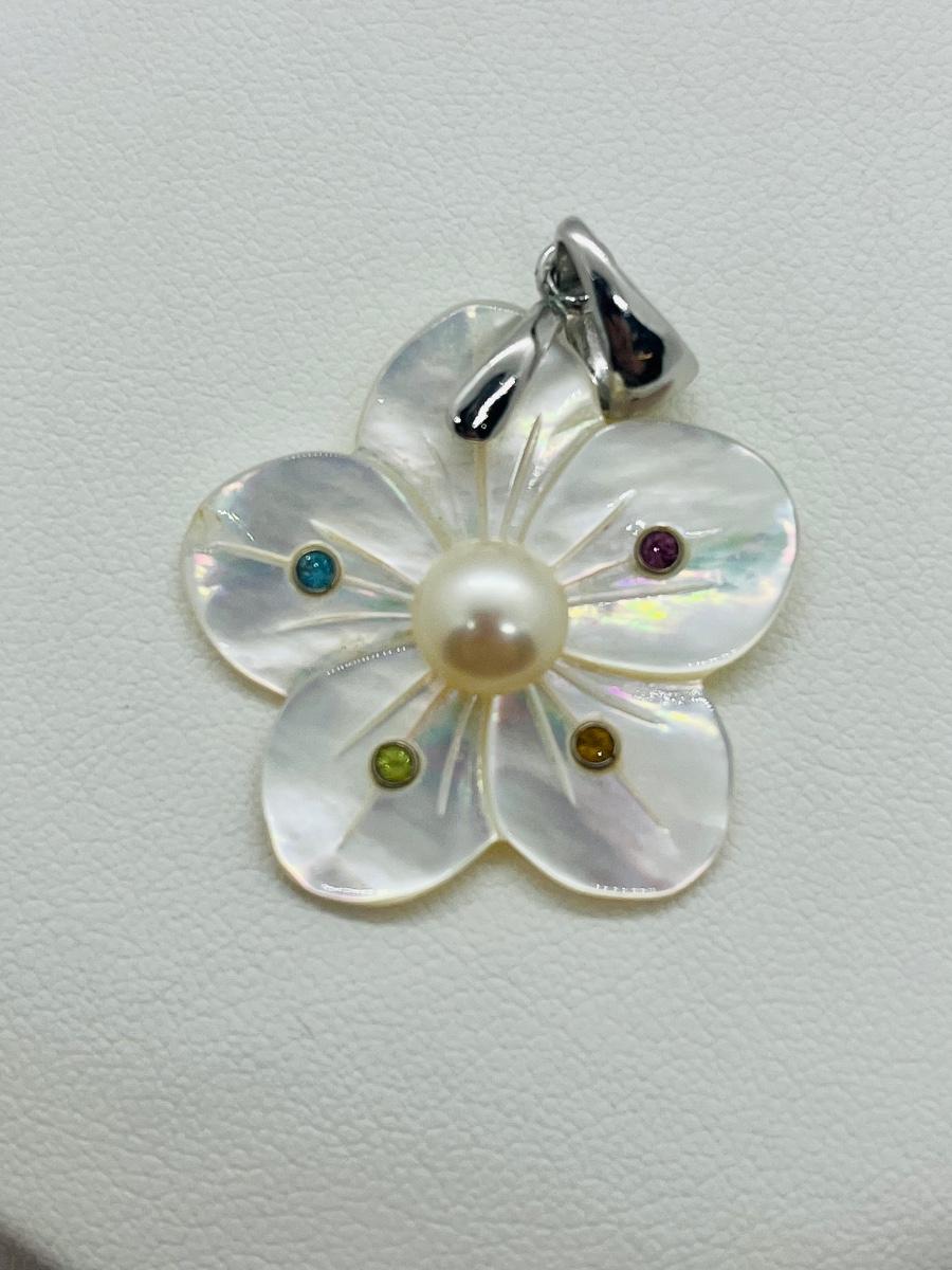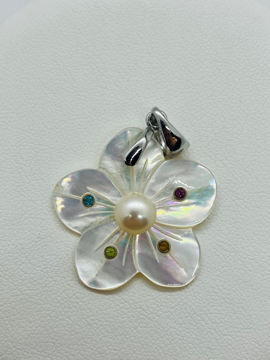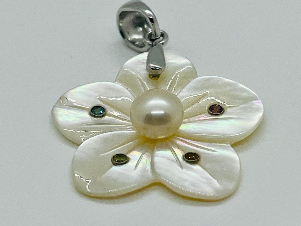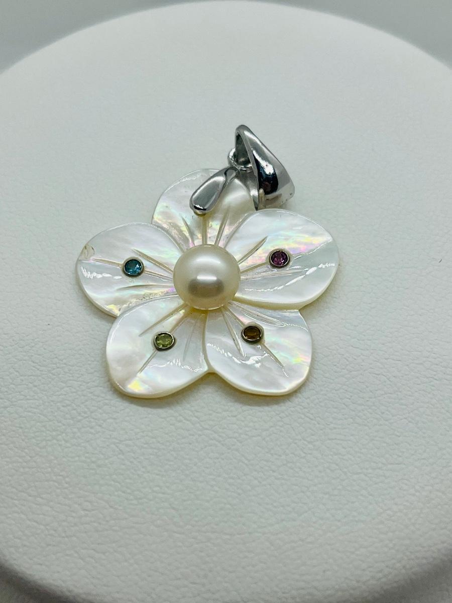 Lot 141: Mother of Pearl Flower with Cultured Pearl Center, Inset Gemstones, & Sterling Bail