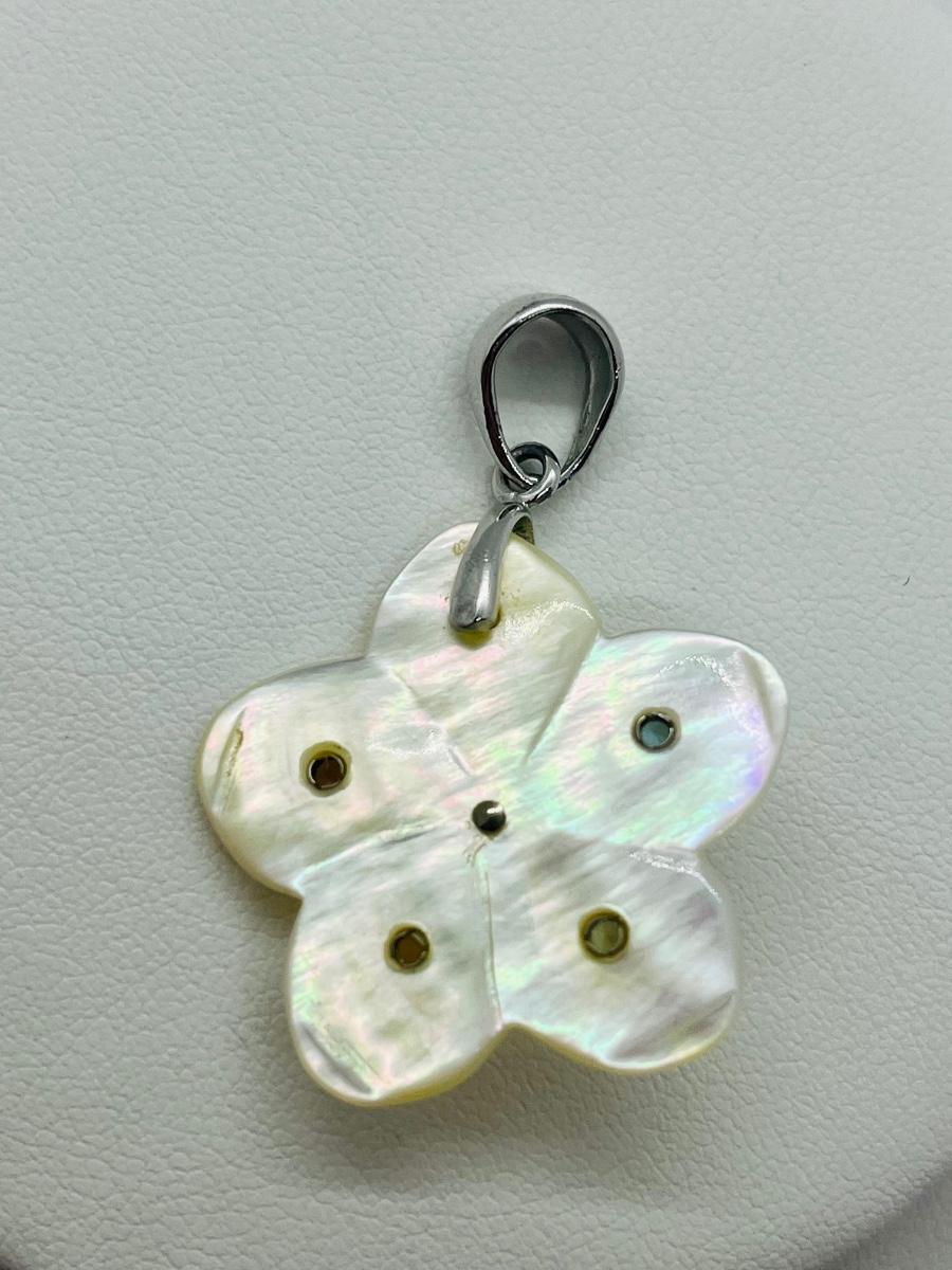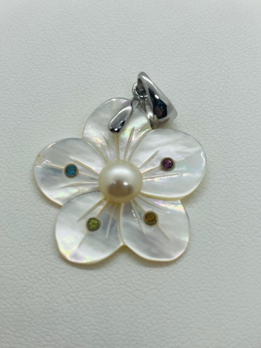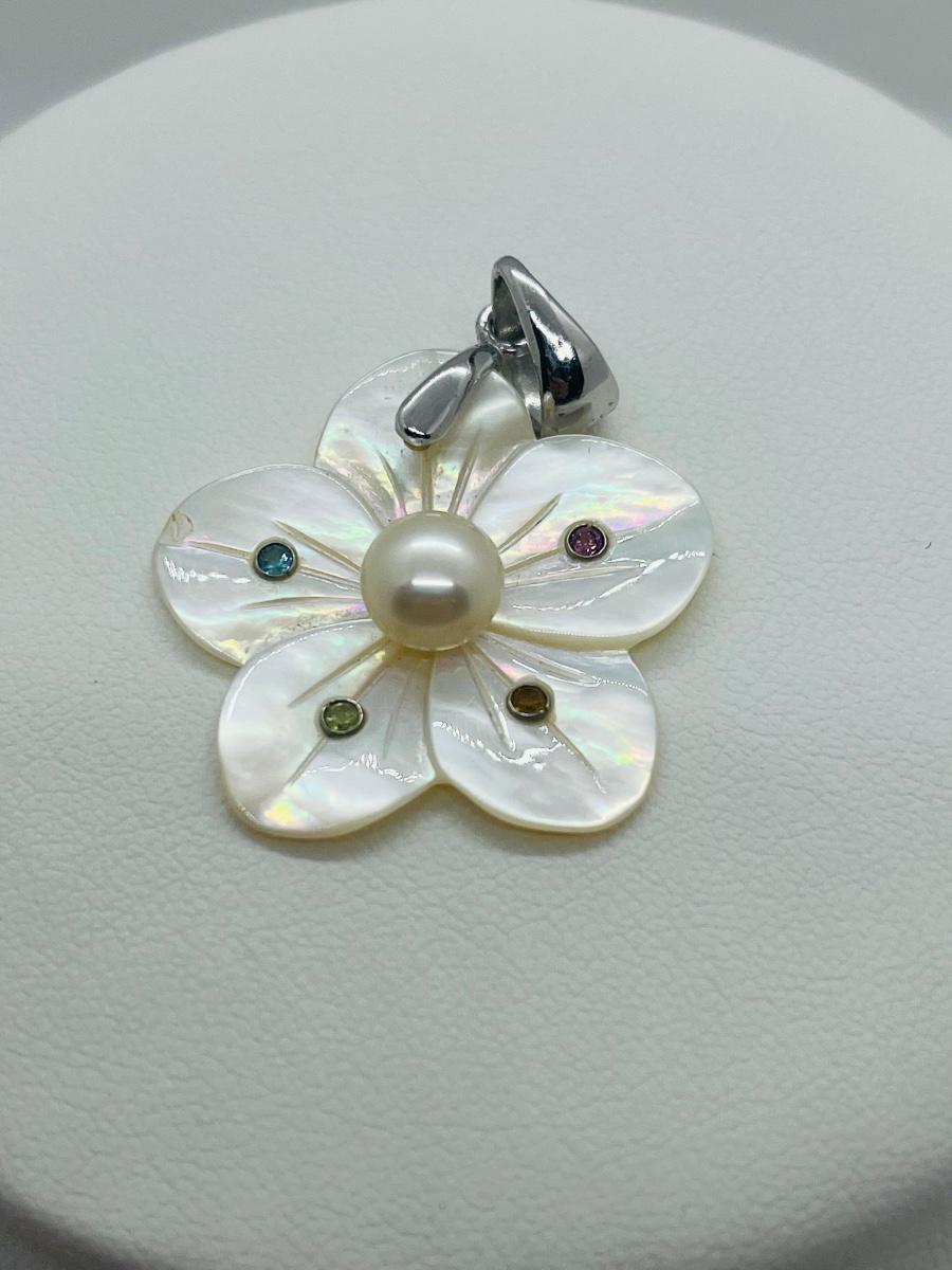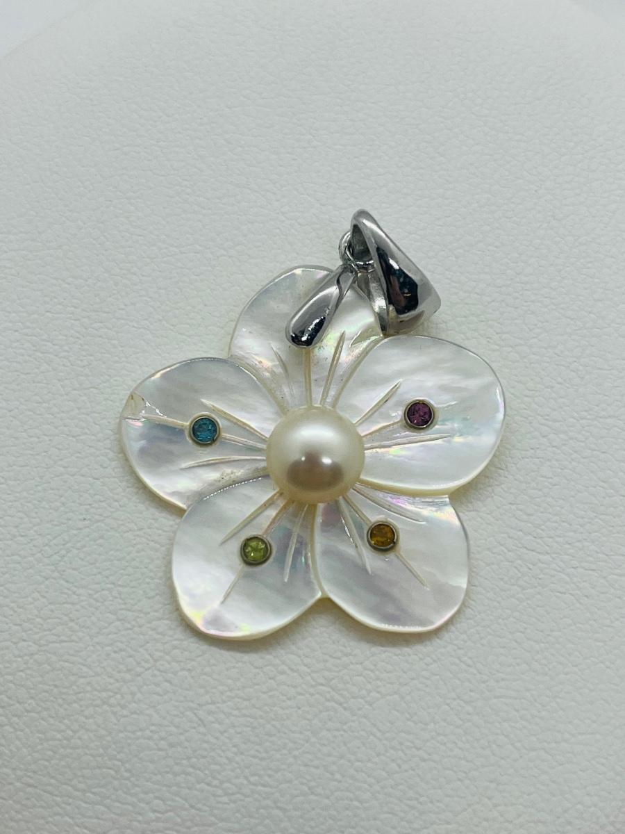 Lot 141: Mother of Pearl Flower with Cultured Pearl Center, Inset Gemstones, & Sterling Bail