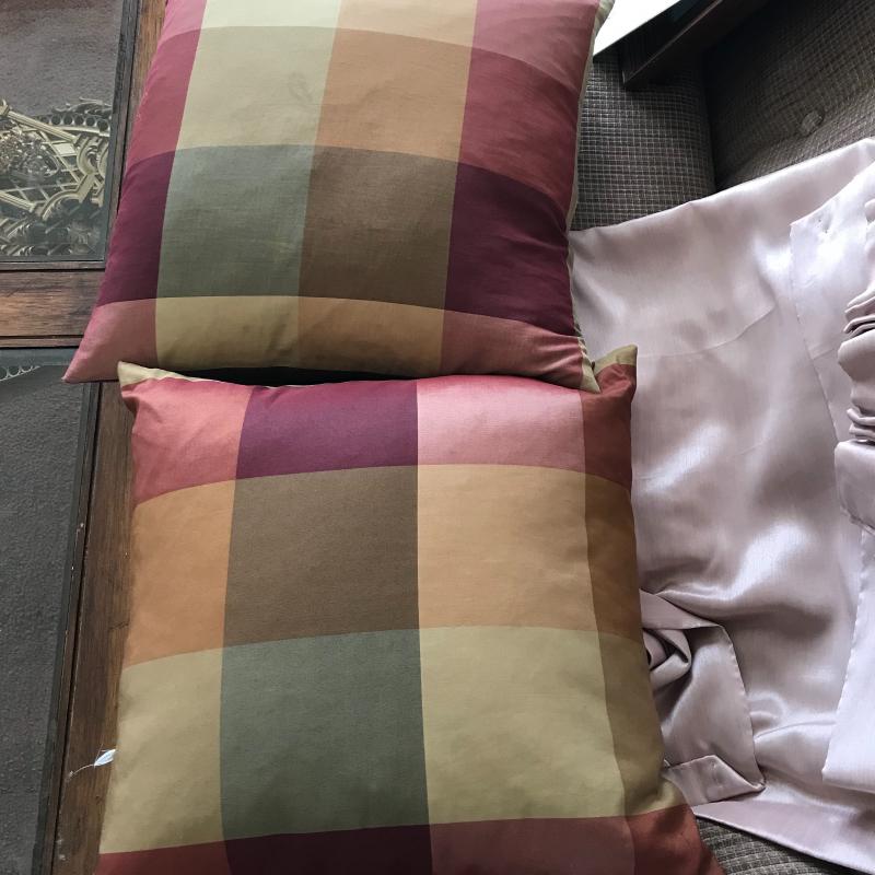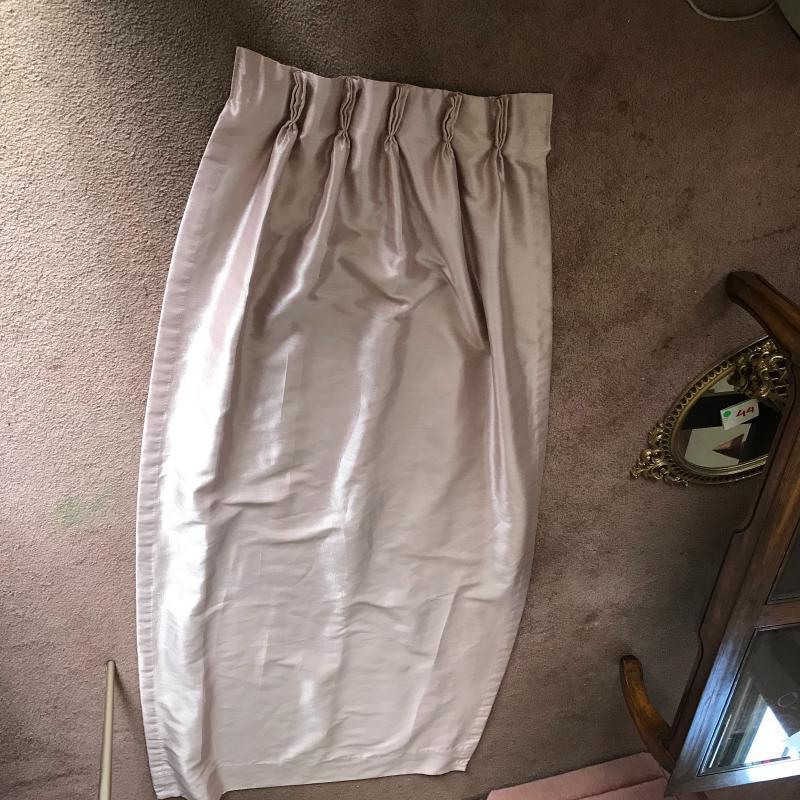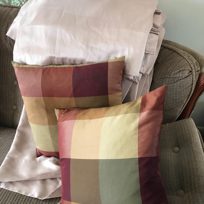 8 panels of a mauve/pink curtains (silk like) each measures aprox 80” x28”. Two down stuffed pillows. Lot available for local pick up in Asheville, NC only.