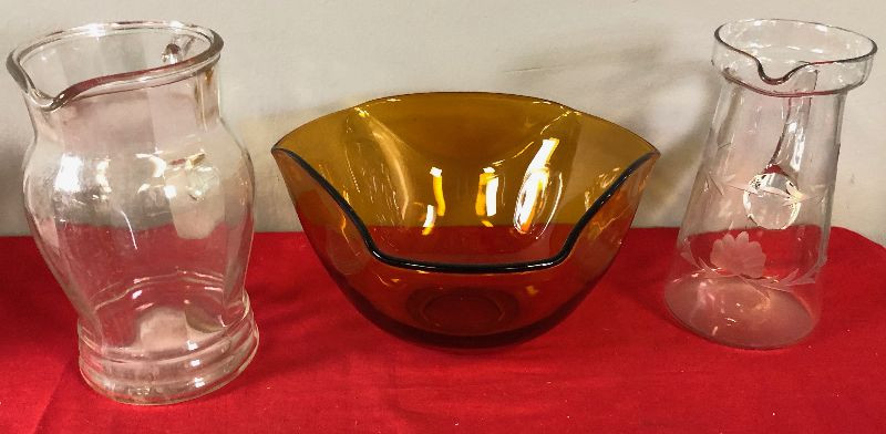 Lot 141 Amber bowl and 2 glass clear pitchers