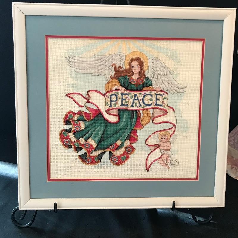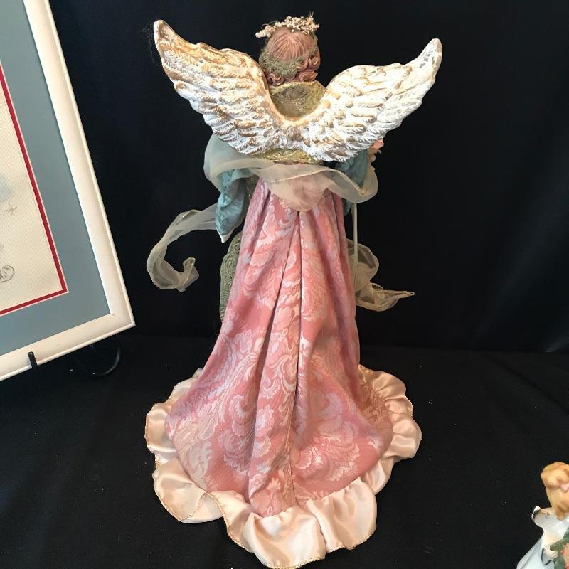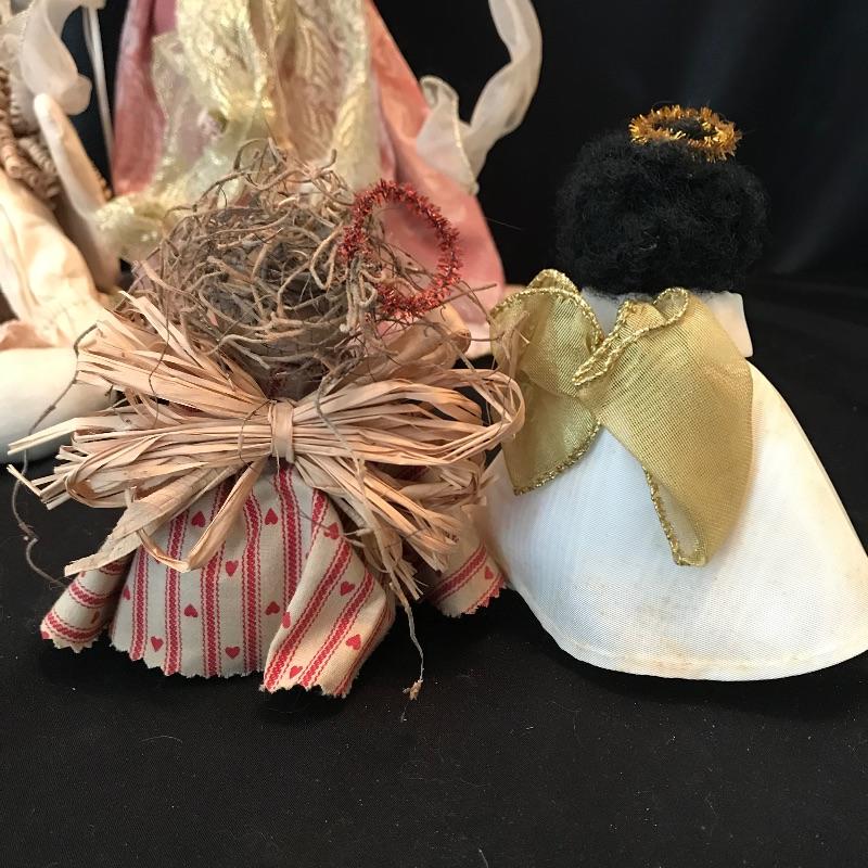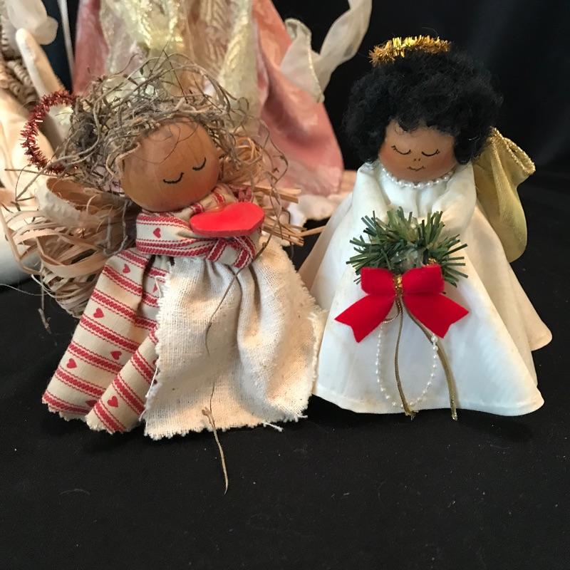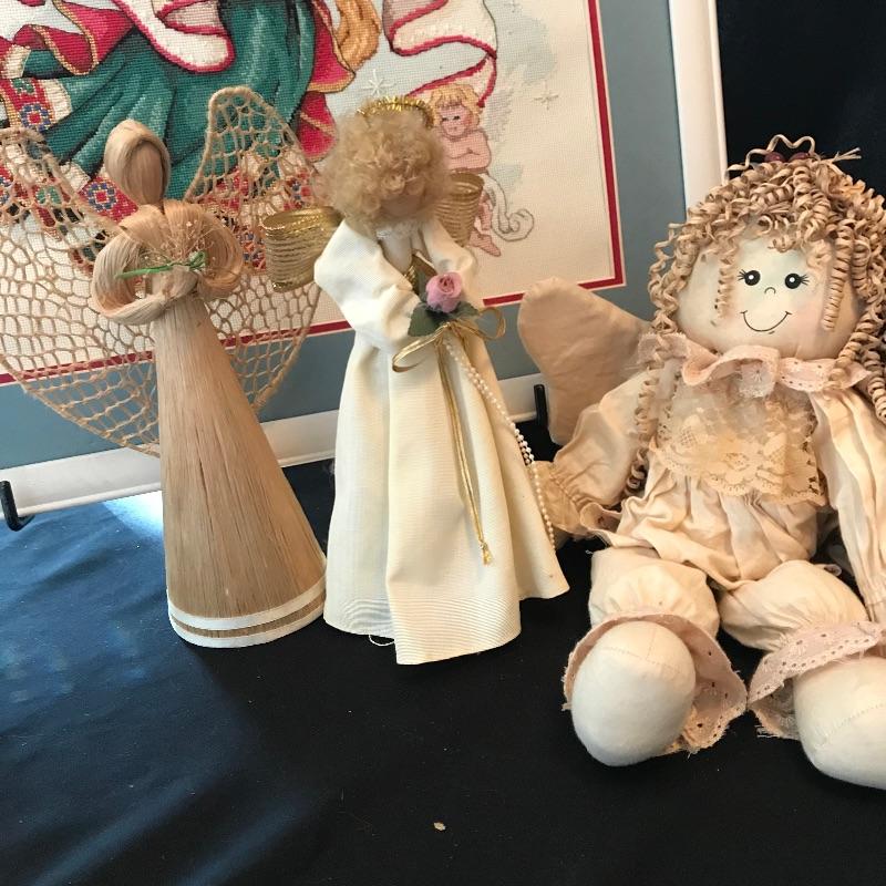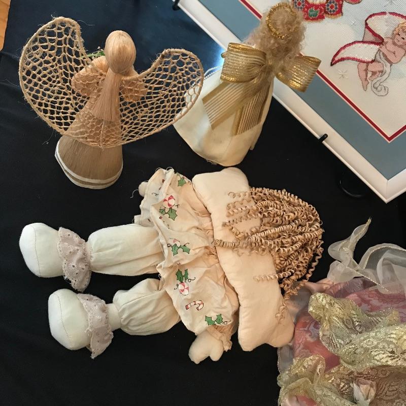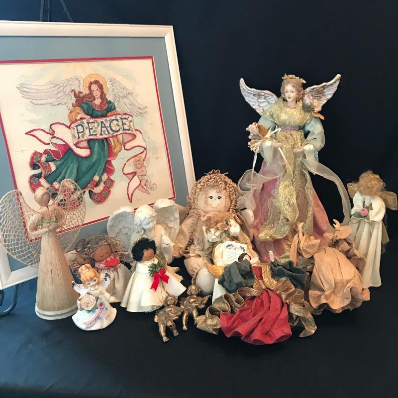 Plethora of angelic figurines and ornaments. Angels from multiple kinds of materials- like cloth, husks, porcelain and even a Birthday Angel from Lefton China. The largest angel is 17” and is adorned with real dried flowers. She has a small chip in her hair, it blends in well with her hair, see photos. Lot also has a lovely needlepoint angel-cherub Christmas art in a white wooden frame. Frame measures 19.5” x 18.5”. No shipping.