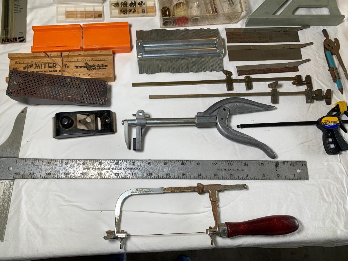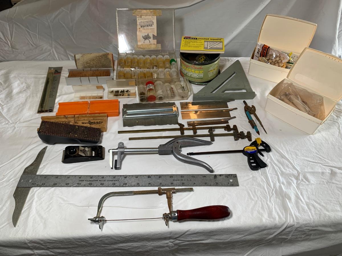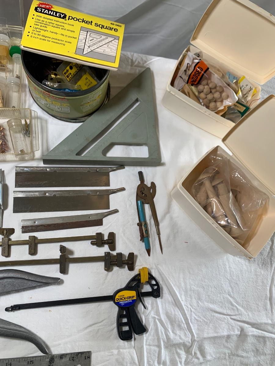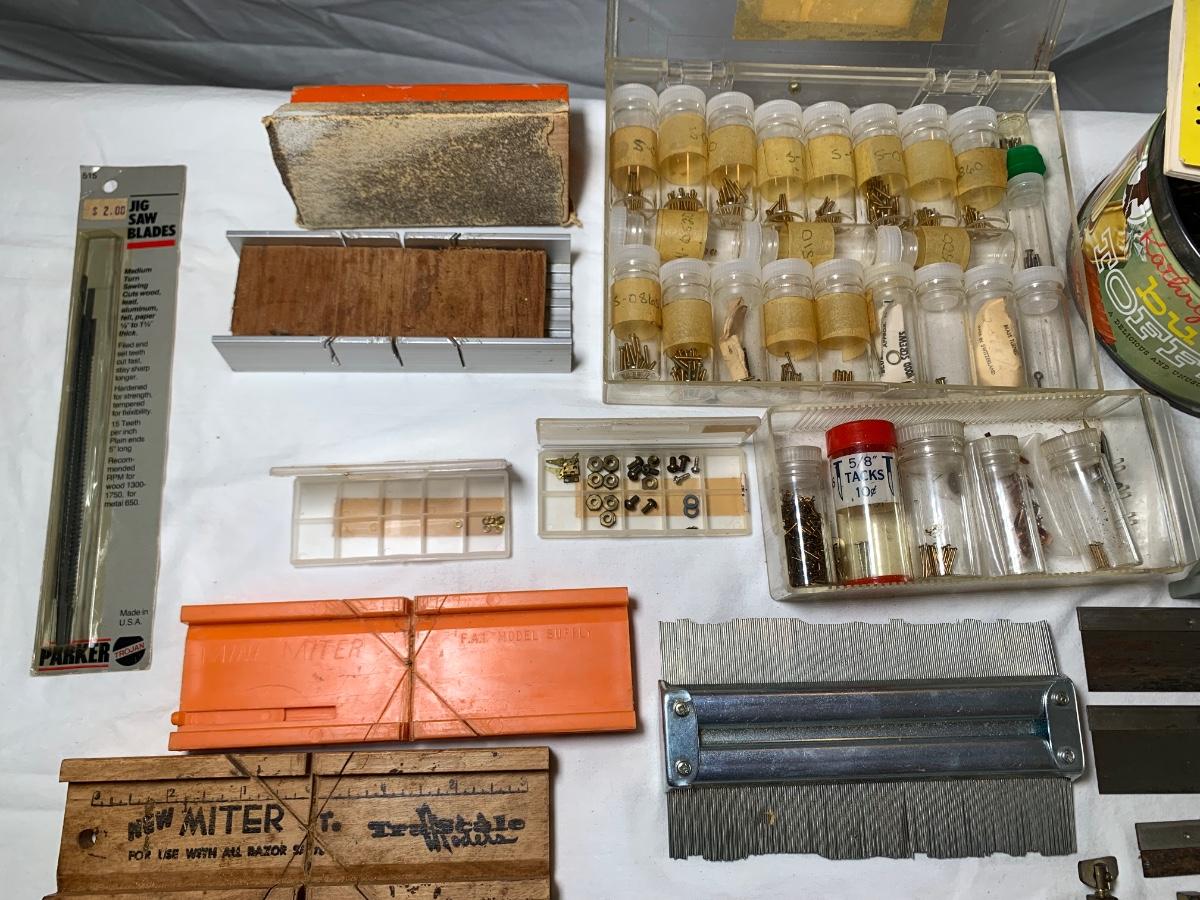 Lot includes an assortment of woodworking tools and supplies, including a collection of tiny brass screws and nails