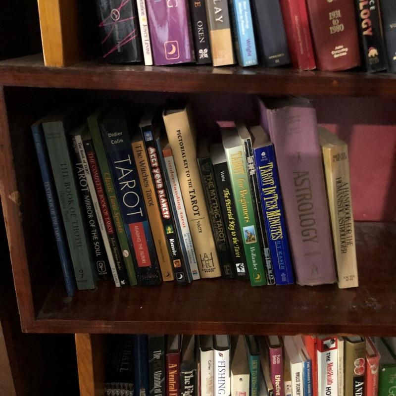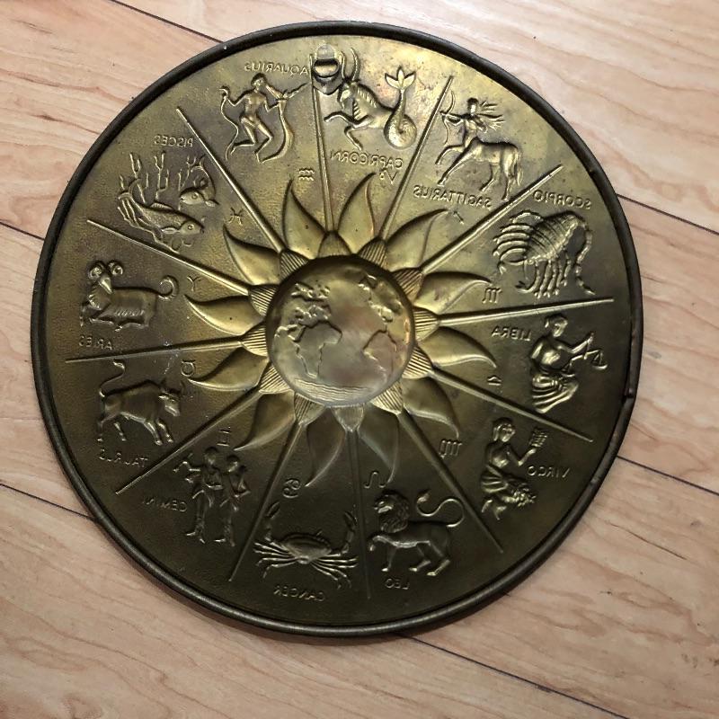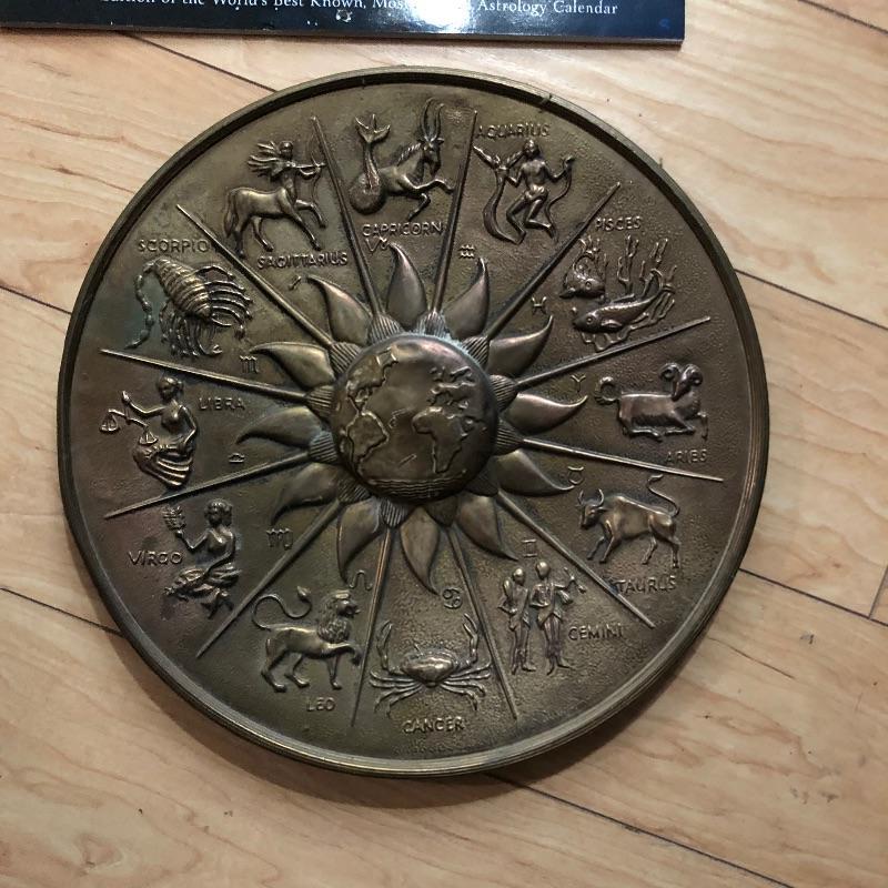 Every book you can think of on “New Wave” thinking, Astrology, Tarot and spiritual self help may very well be here! See images for all the titles included in this great lot that also includes a tin hanging piece with all the signs of the Zodiac. Tin piece measures approximately 12 in. in diameter.
