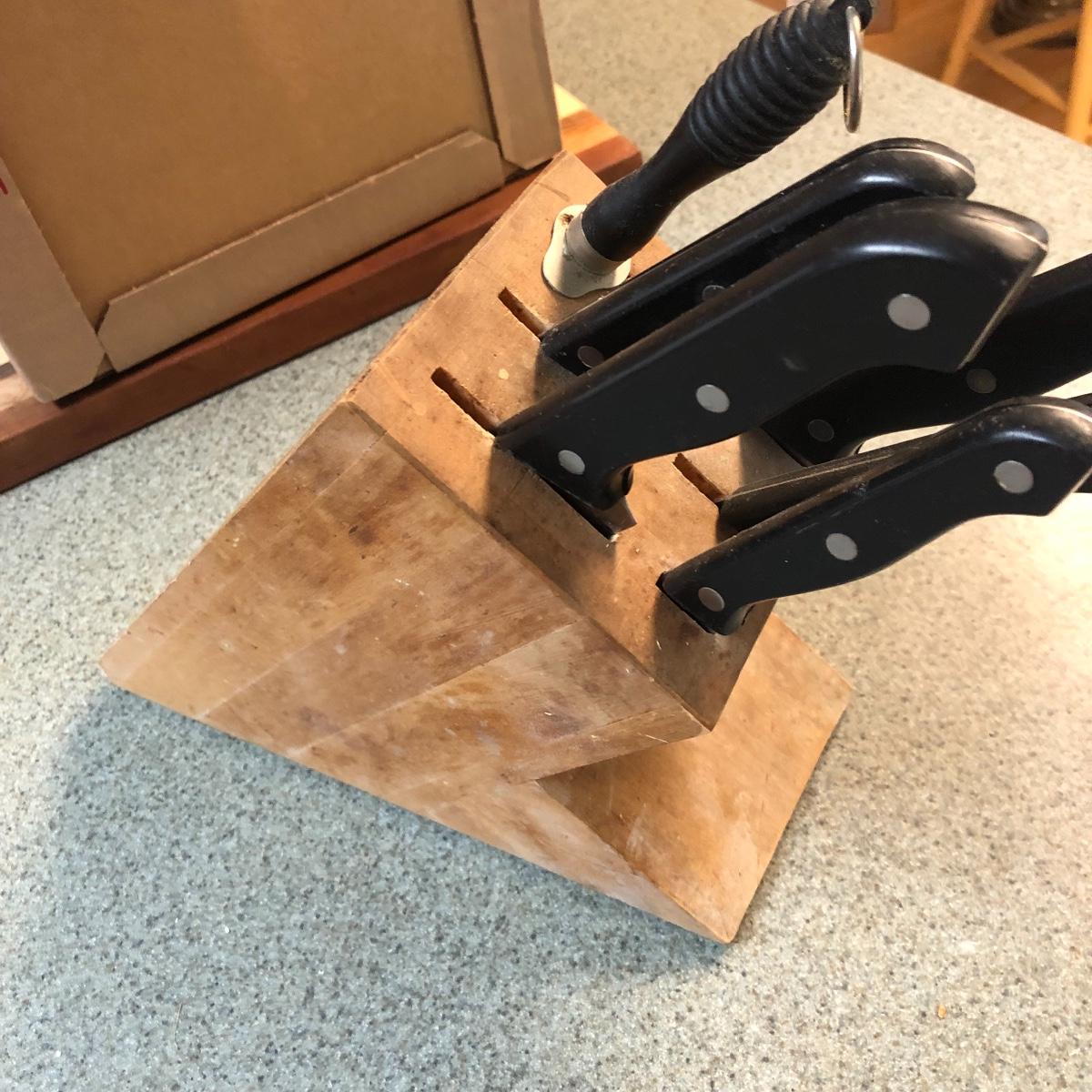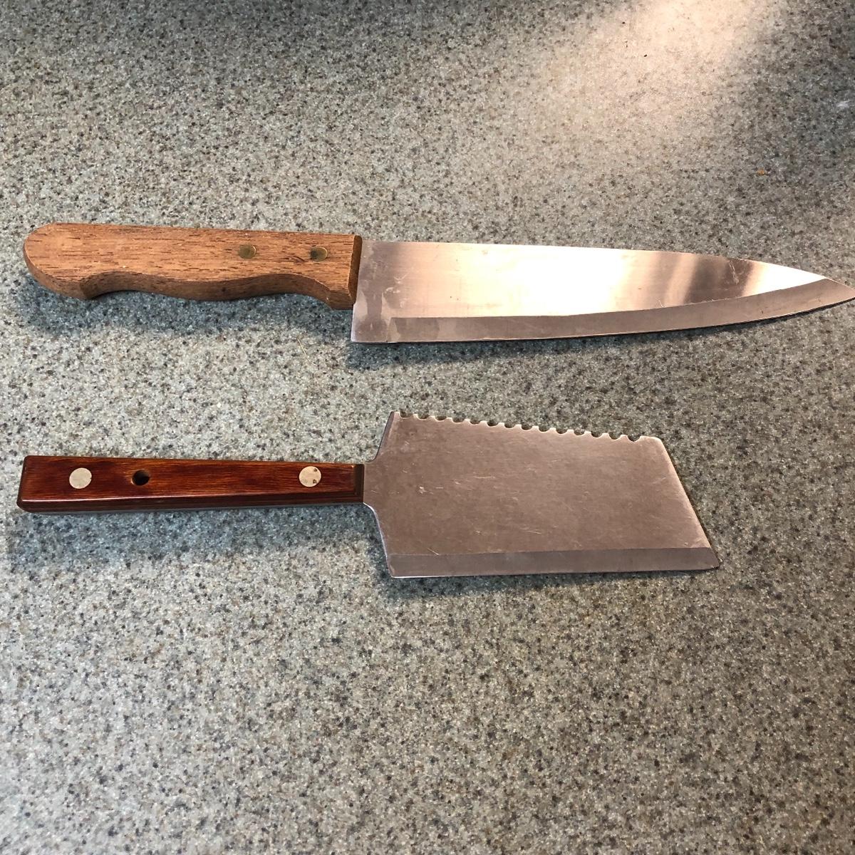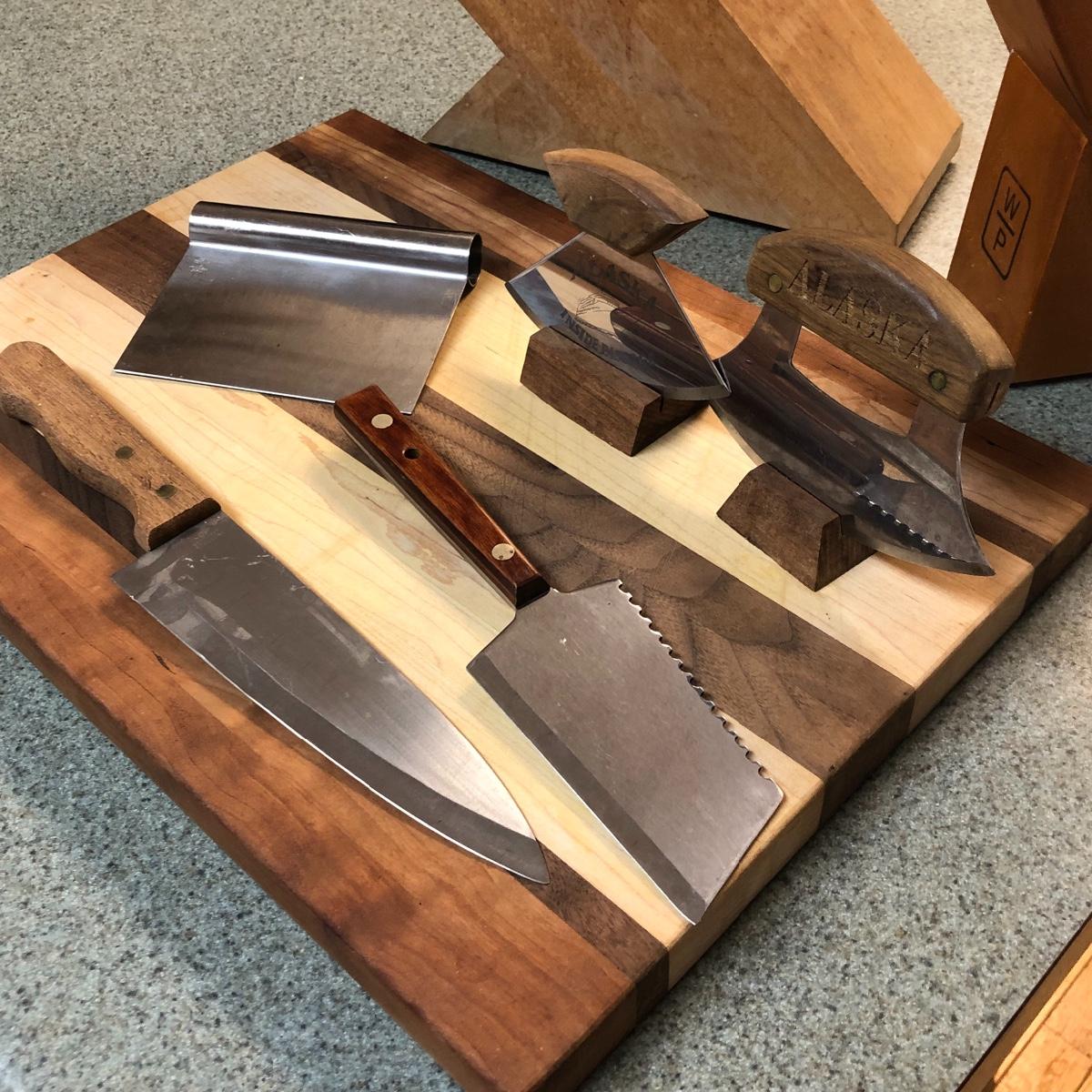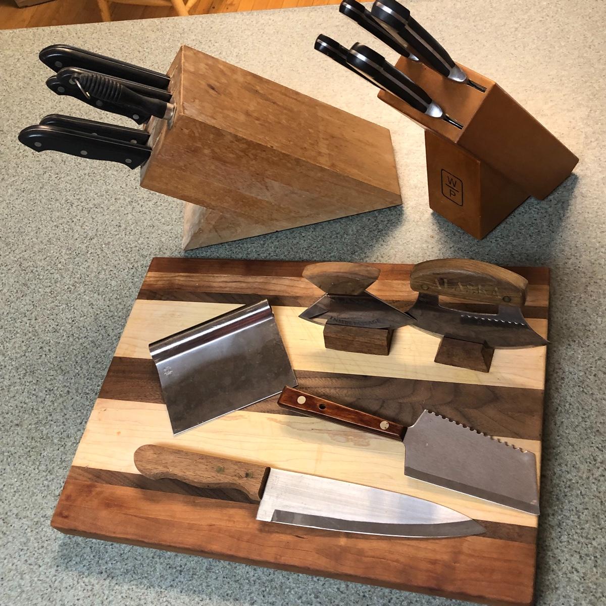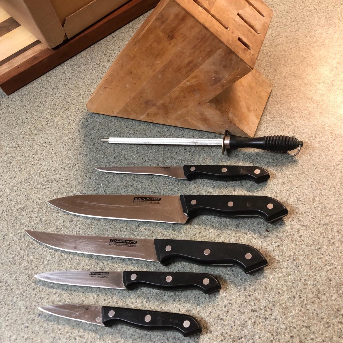 Display this handsome cutting block while adding to your chopping capabilities. This lot includes a beautifully made chopping block, three chopping tools, a knife and Robeson chopper and two knife blocks with knives. The chopping block measures 18” x 13”. Please note the stain on one side of the block; it may come off with a good cleaning. One knife block is filled with knives - all marked with “WP.” The other block is filled with “Koch Messer” and “Schinken Messer” knives. Local pick up only.