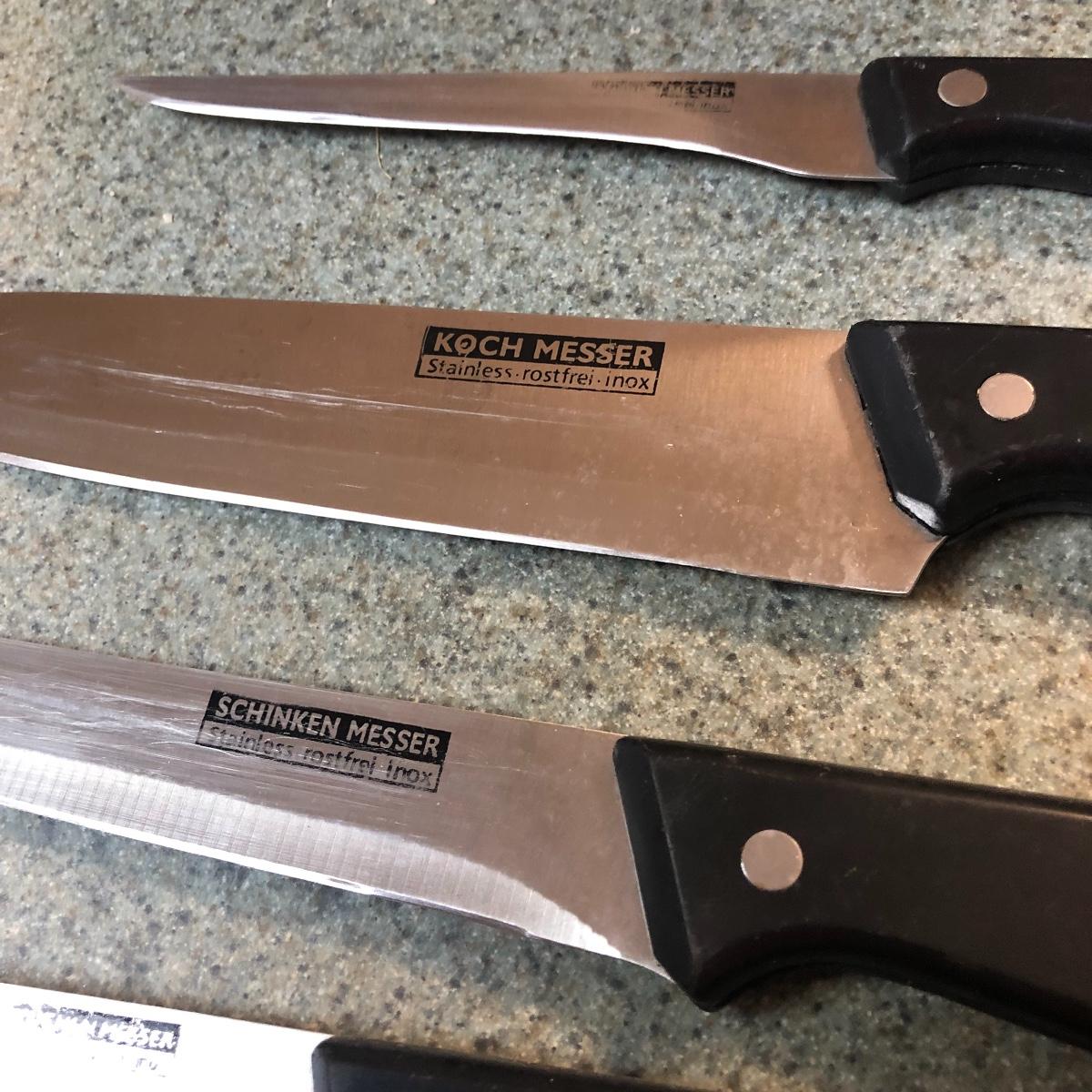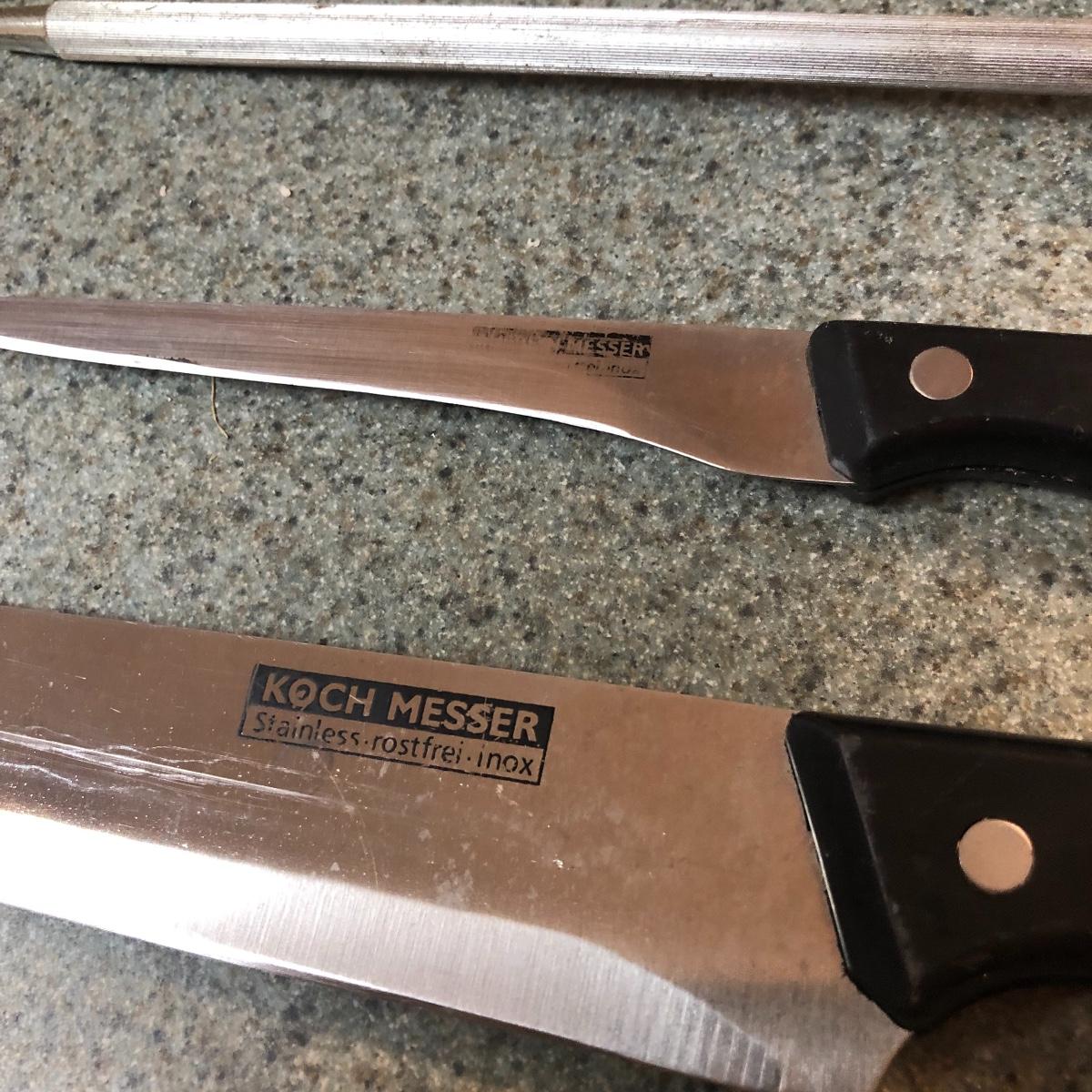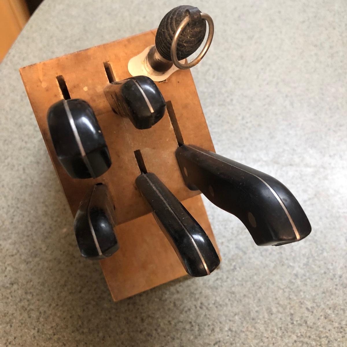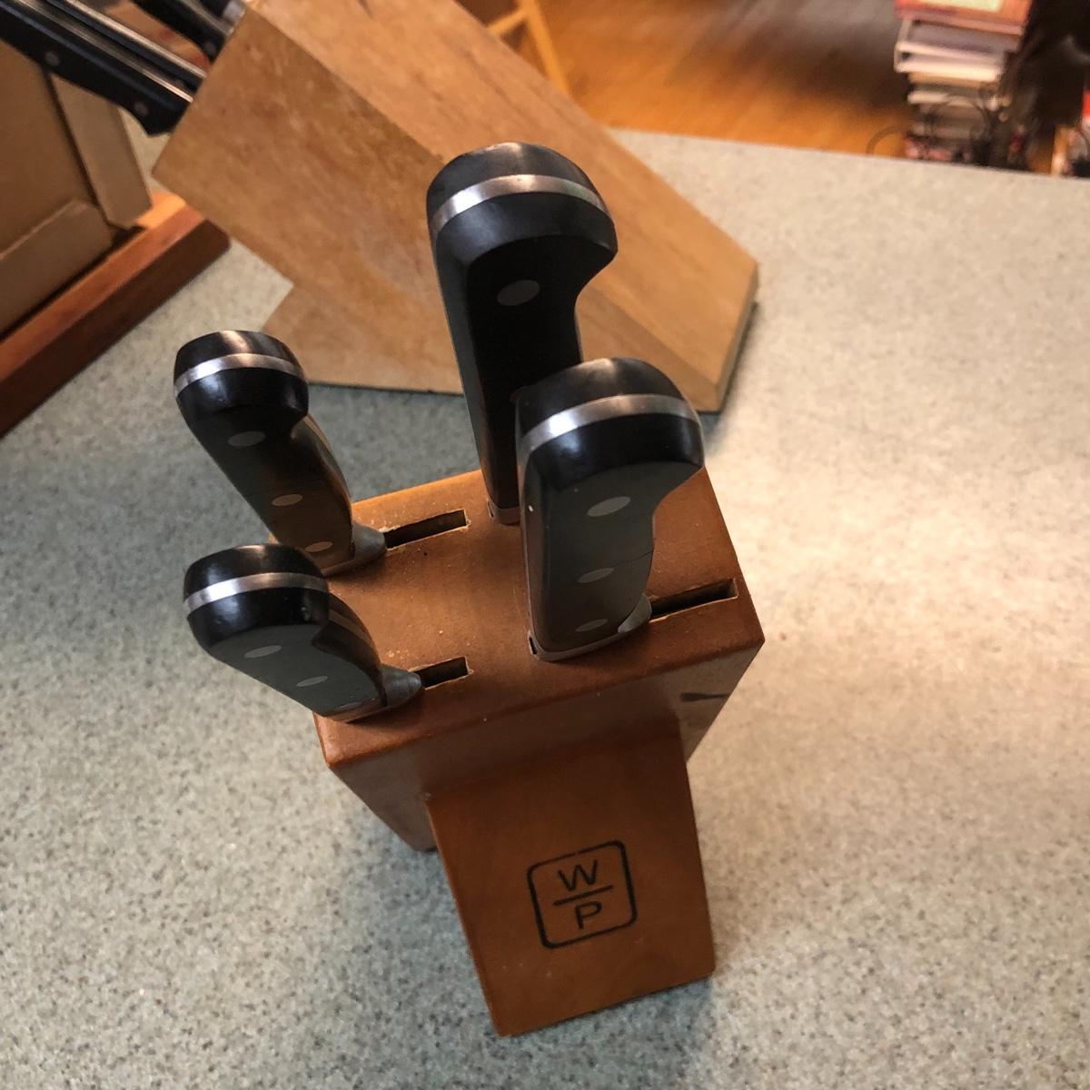 Display this handsome cutting block while adding to your chopping capabilities. This lot includes a beautifully made chopping block, three chopping tools, a knife and Robeson chopper and two knife blocks with knives. The chopping block measures 18” x 13”. Please note the stain on one side of the block; it may come off with a good cleaning. One knife block is filled with knives - all marked with “WP.” The other block is filled with “Koch Messer” and “Schinken Messer” knives. Local pick up only.