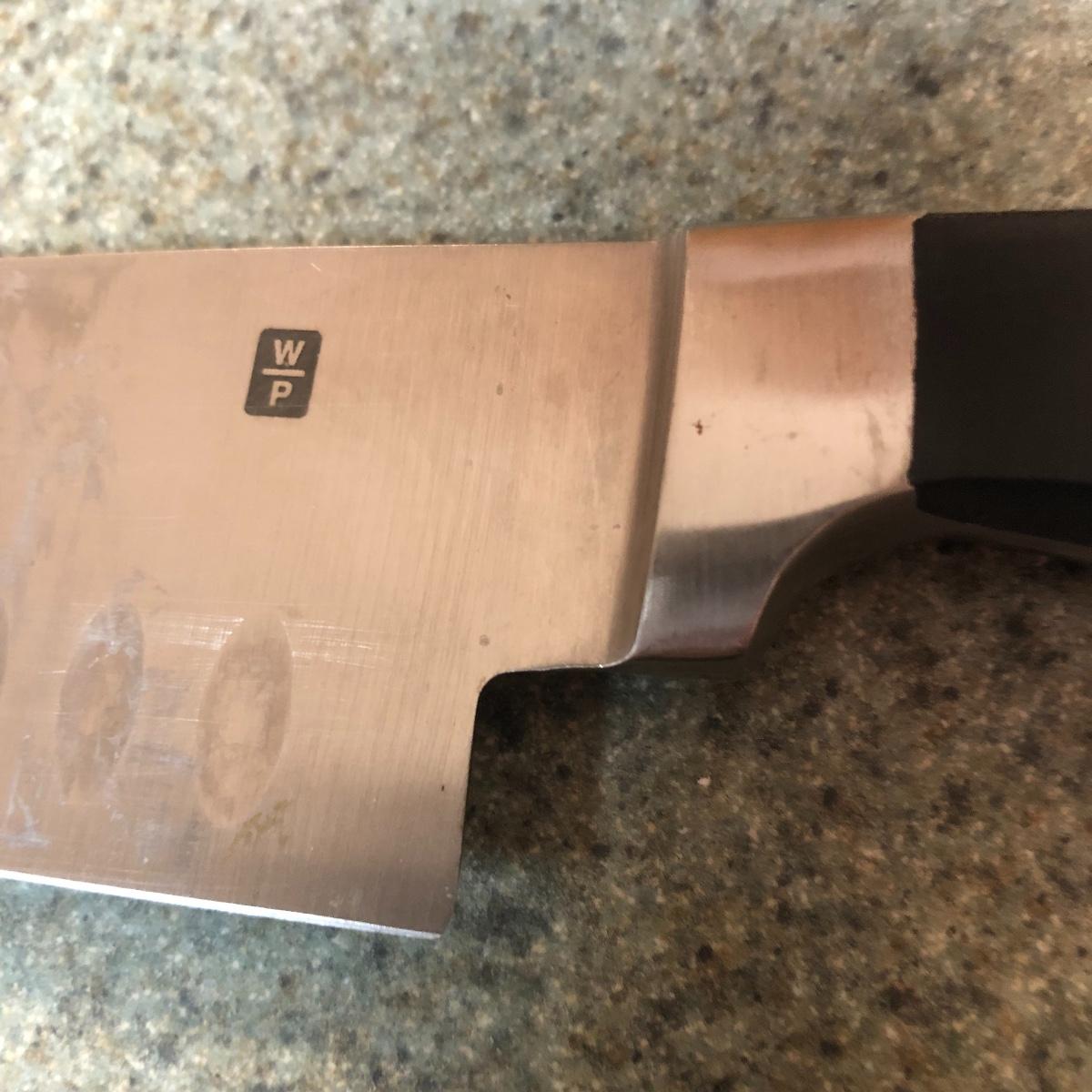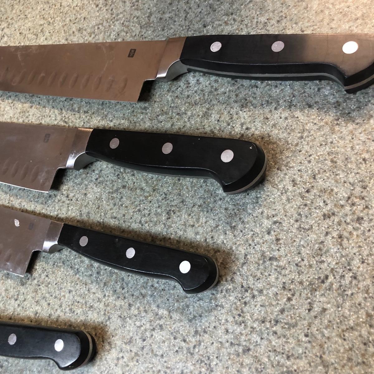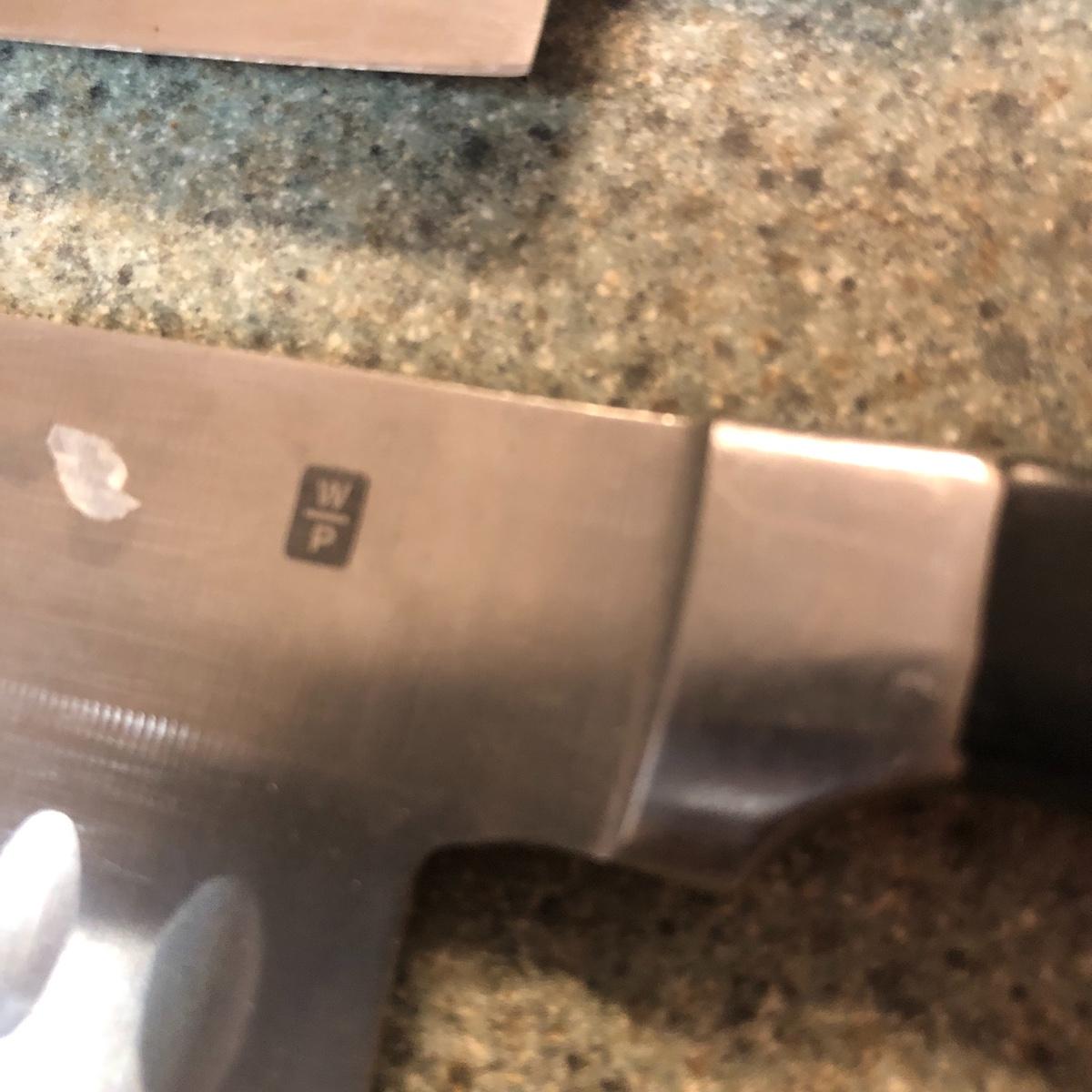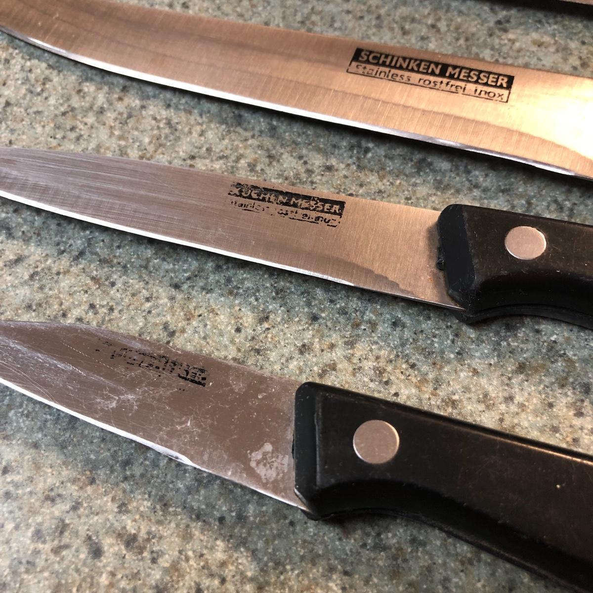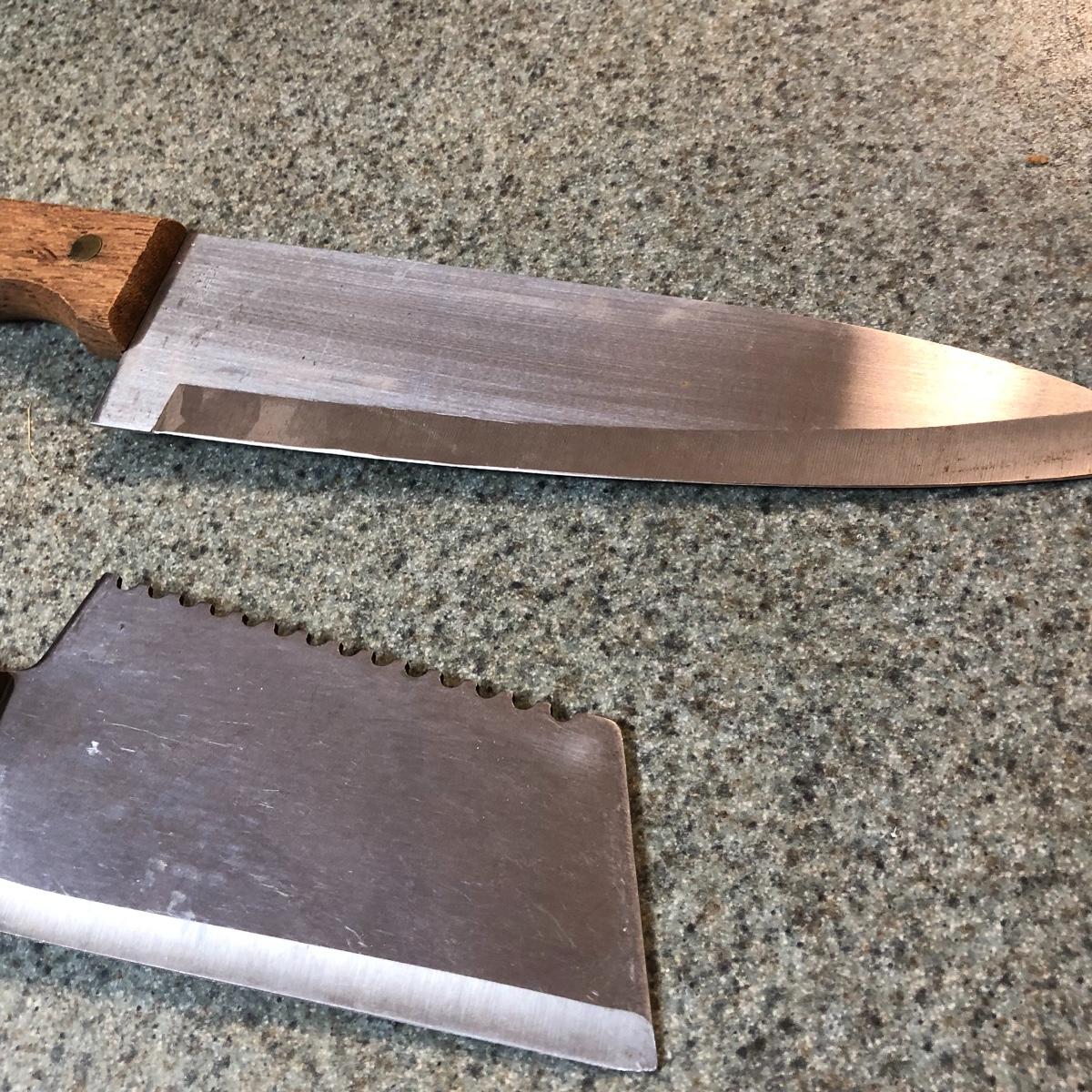Display this handsome cutting block while adding to your chopping capabilities. This lot includes a beautifully made chopping block, three chopping tools, a knife and Robeson chopper and two knife blocks with knives. The chopping block measures 18” x 13”. Please note the stain on one side of the block; it may come off with a good cleaning. One knife block is filled with knives - all marked with “WP.” The other block is filled with “Koch Messer” and “Schinken Messer” knives. Local pick up only.