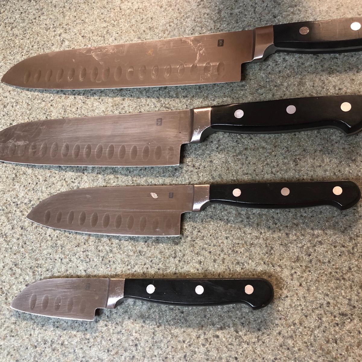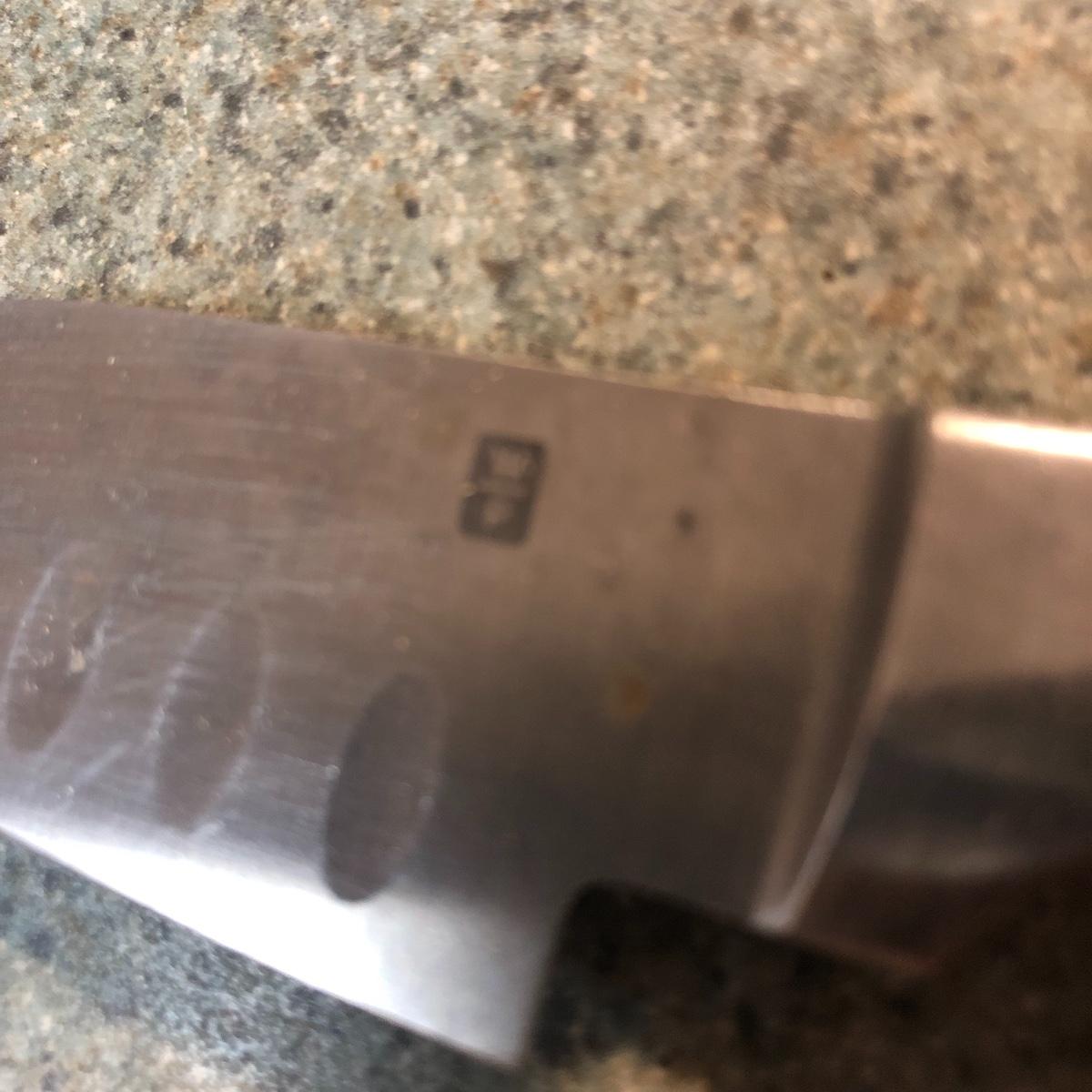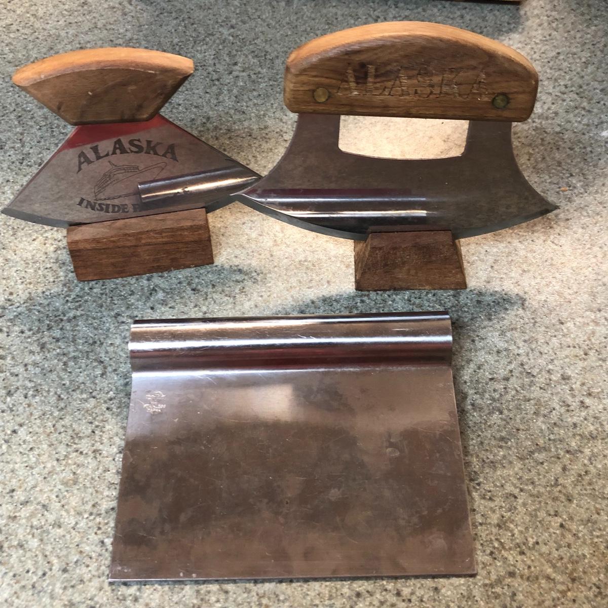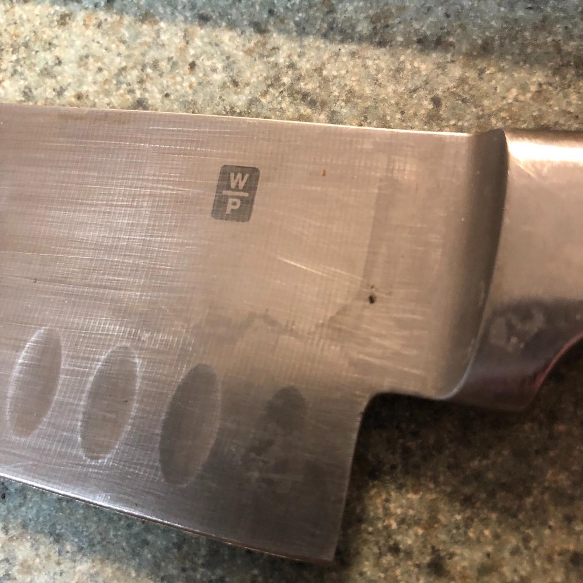 Display this handsome cutting block while adding to your chopping capabilities. This lot includes a beautifully made chopping block, three chopping tools, a knife and Robeson chopper and two knife blocks with knives. The chopping block measures 18” x 13”. Please note the stain on one side of the block; it may come off with a good cleaning. One knife block is filled with knives - all marked with “WP.” The other block is filled with “Koch Messer” and “Schinken Messer” knives. Local pick up only.