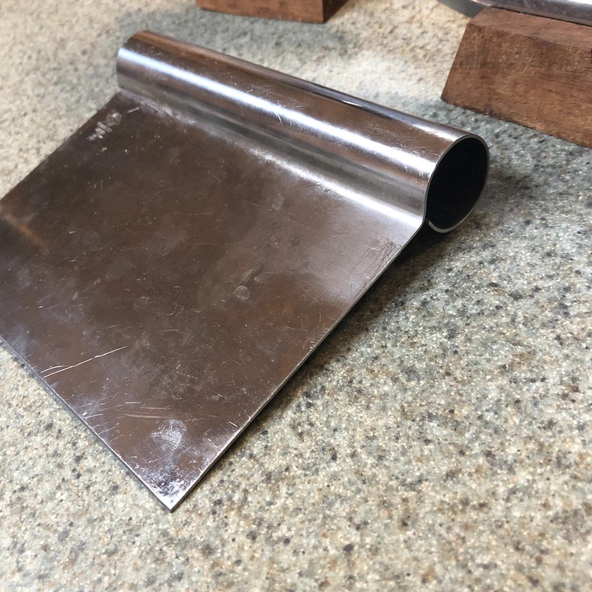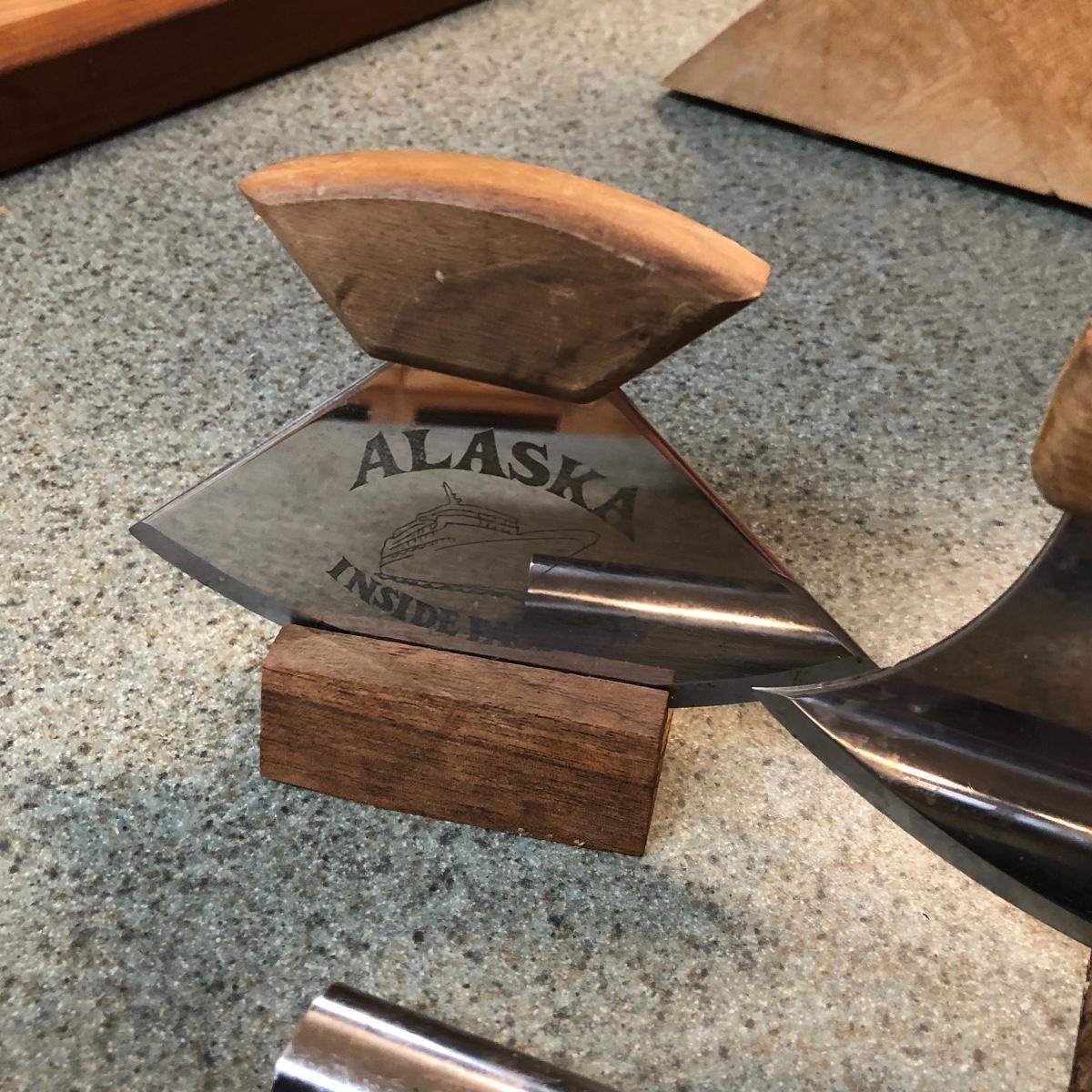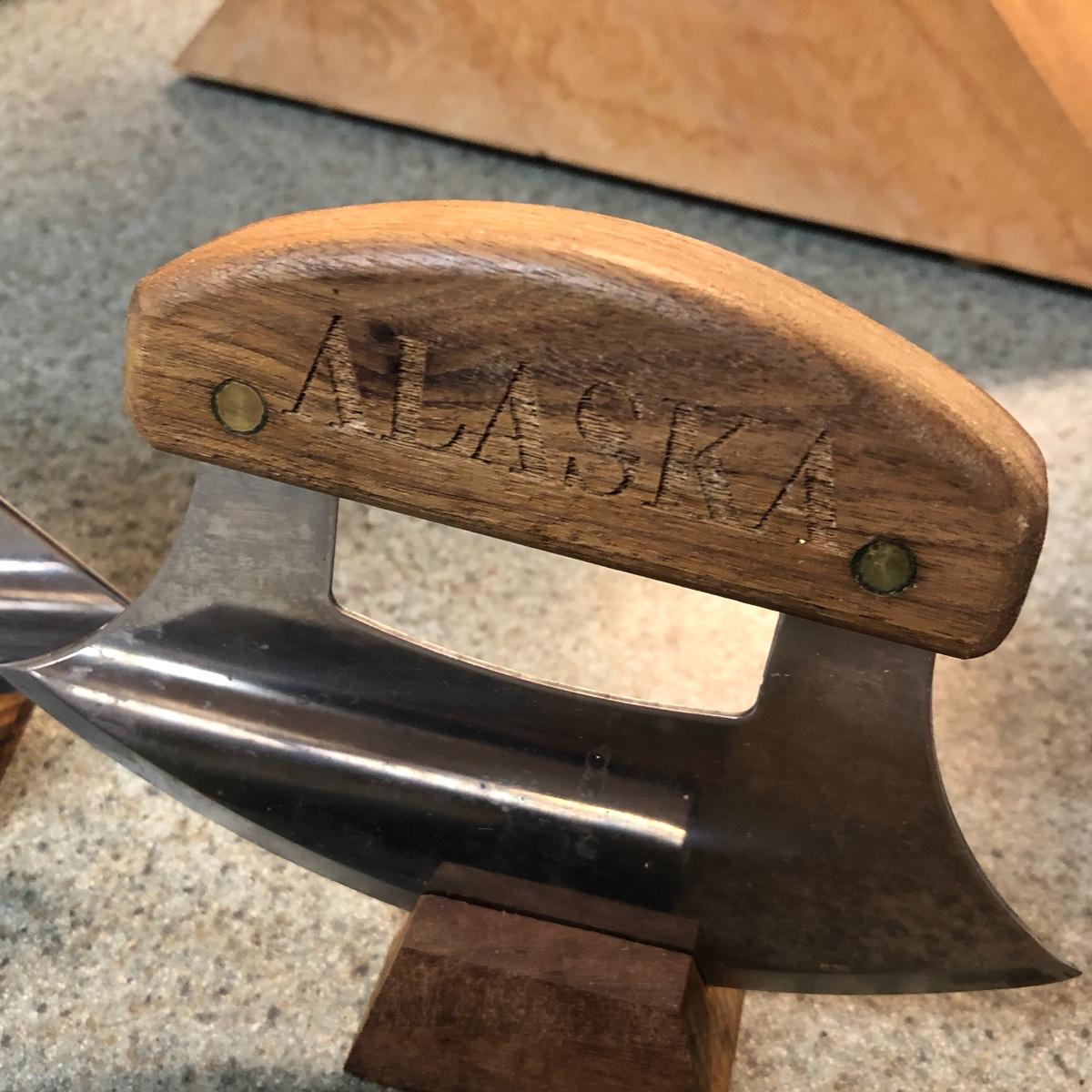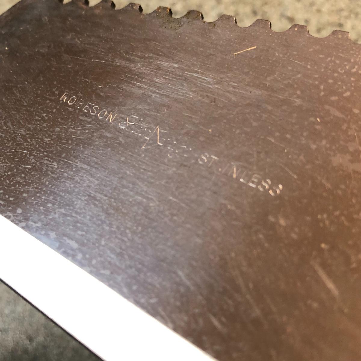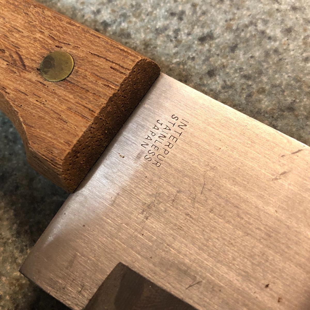 Display this handsome cutting block while adding to your chopping capabilities. This lot includes a beautifully made chopping block, three chopping tools, a knife and Robeson chopper and two knife blocks with knives. The chopping block measures 18” x 13”. Please note the stain on one side of the block; it may come off with a good cleaning. One knife block is filled with knives - all marked with “WP.” The other block is filled with “Koch Messer” and “Schinken Messer” knives. Local pick up only.