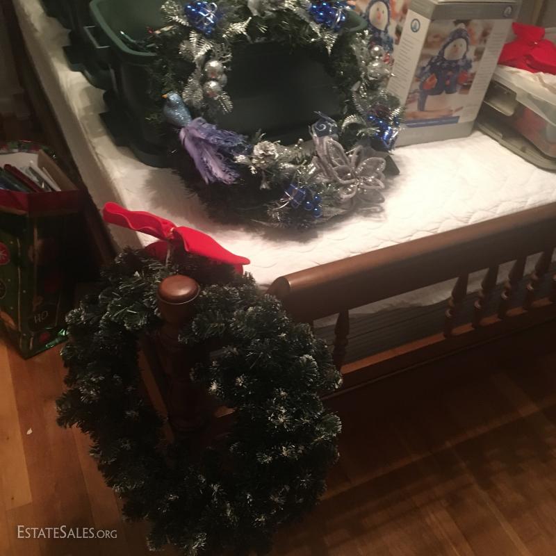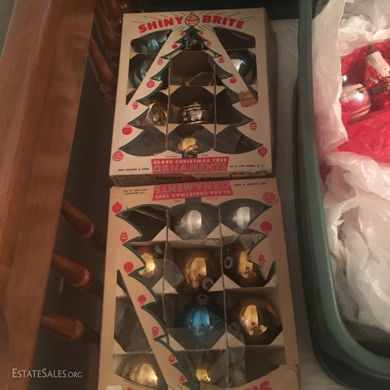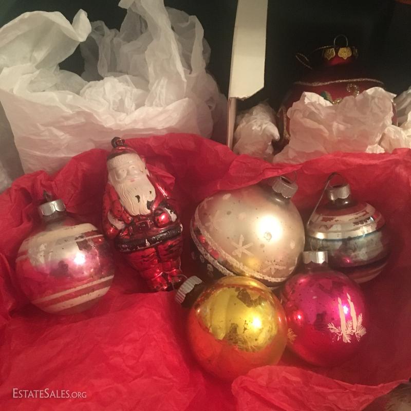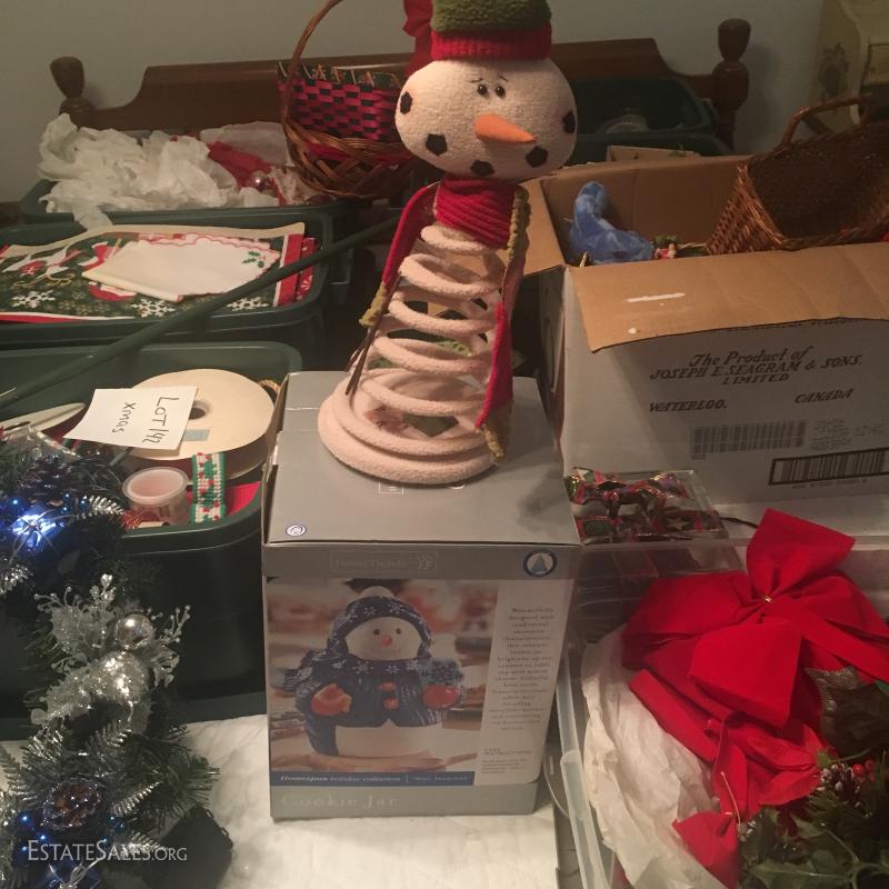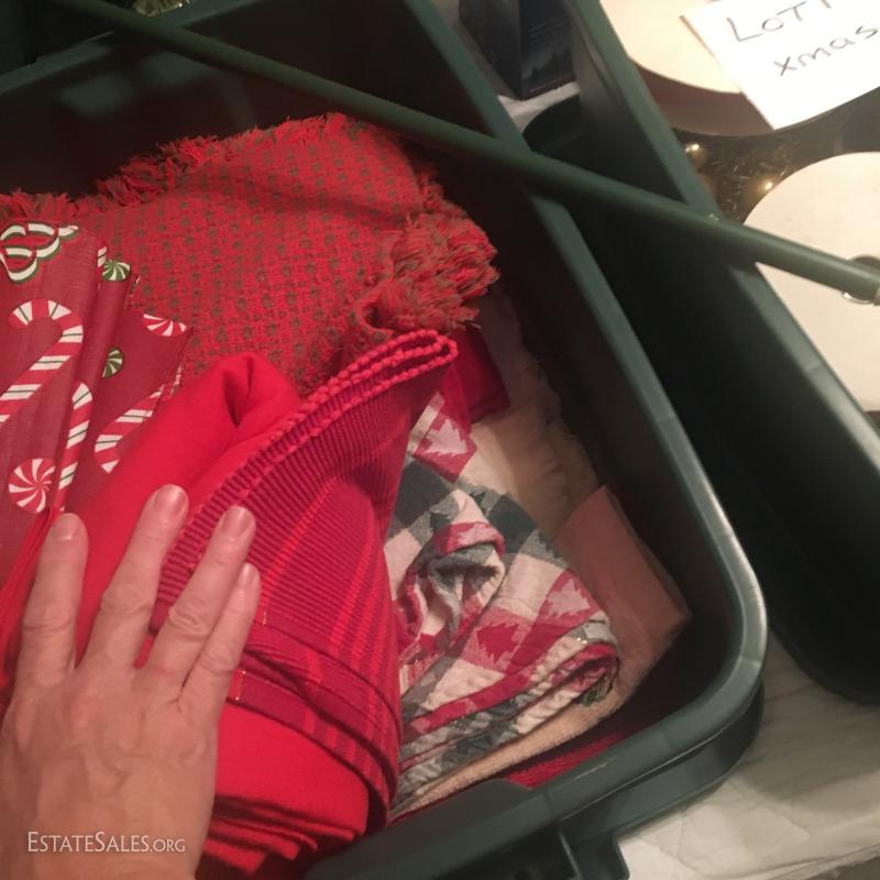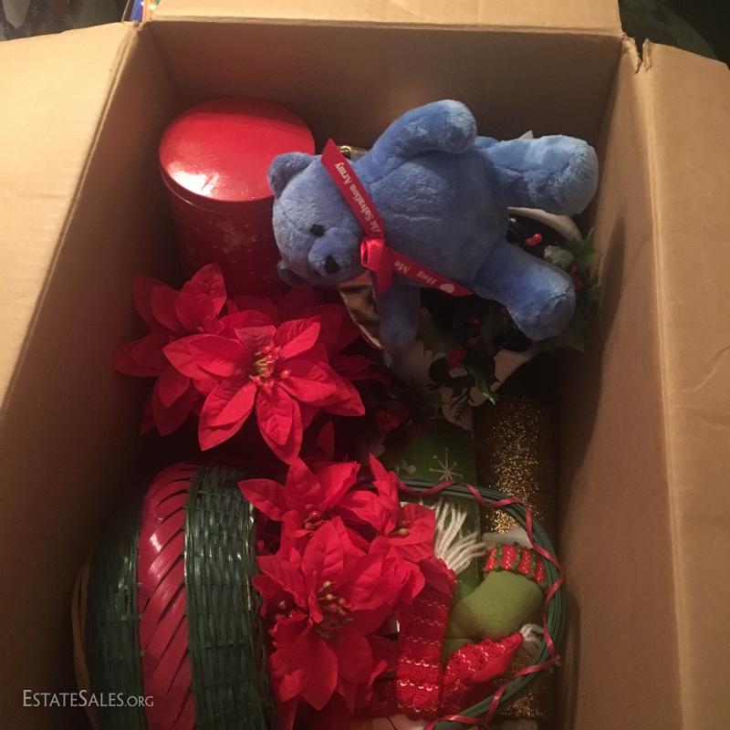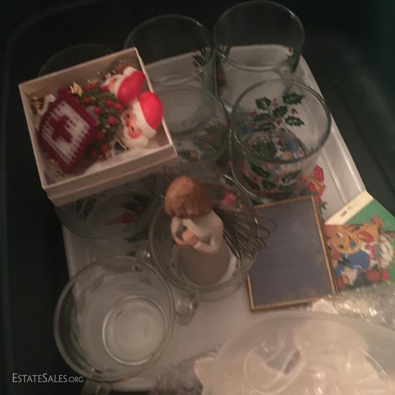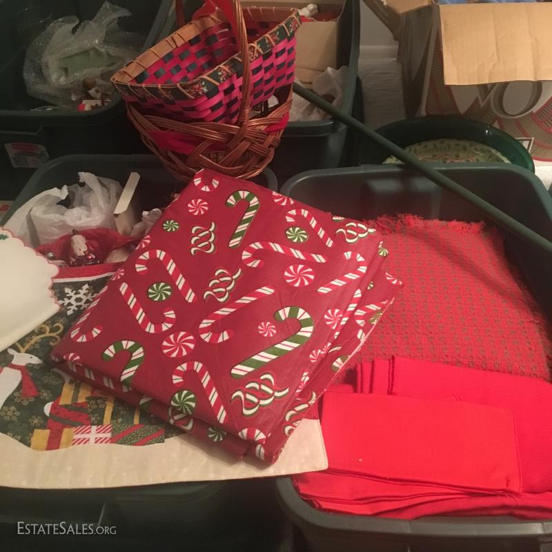 Decorations include lights, vintage ornaments, tins, serving pieces, wrapping paper, tree stand and waterer. Linens, glassware, baskets, figurines and more. This lot is available for local pick up in Asheville, NC only.