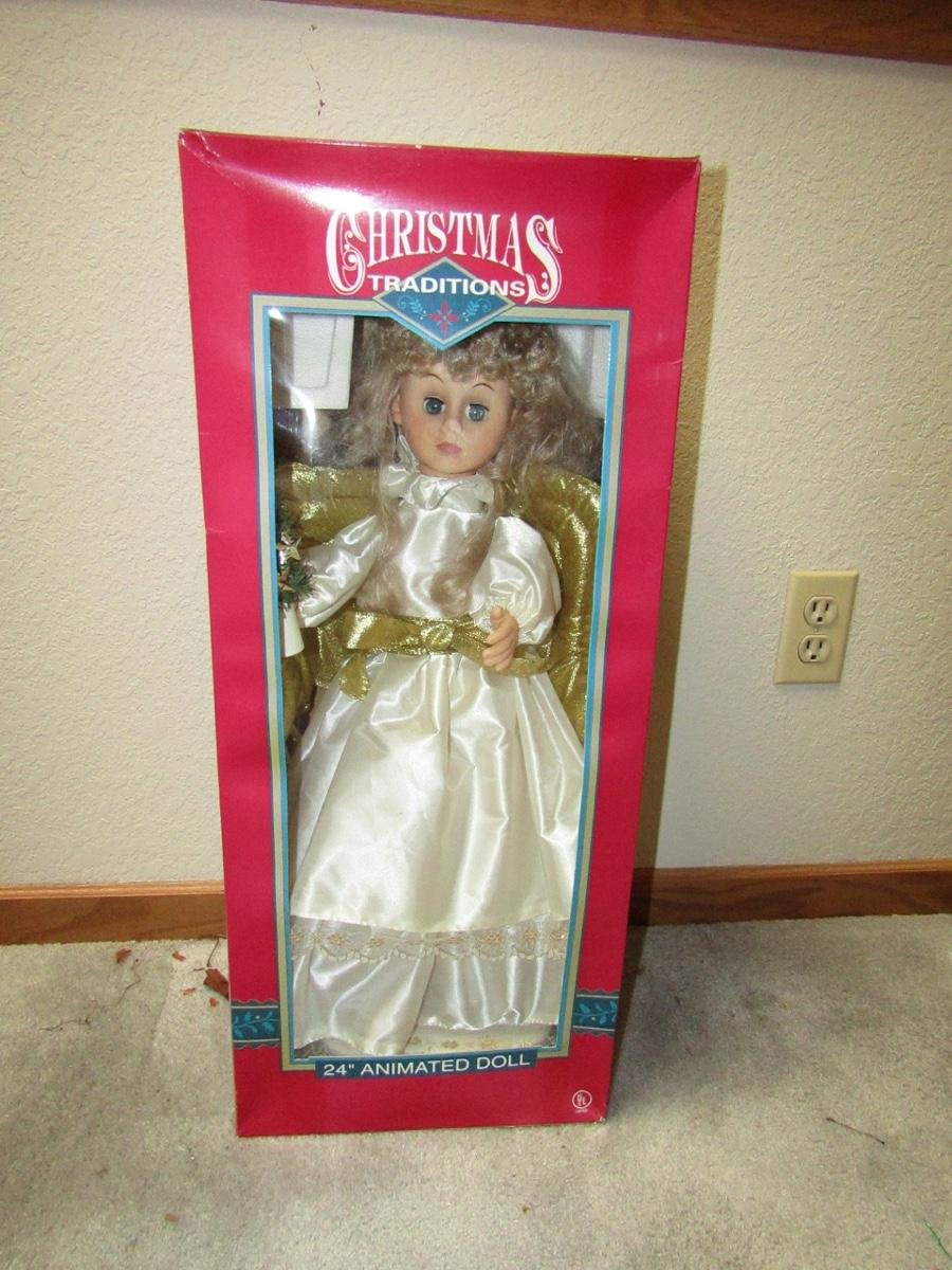 CHRISTMAS TRADITIONS 24” ANIMATED ANGEL IN ORIGINAL BOX. HEAD & ARM MOVEMENT WITH LIGHTS. ANGEL WITH GOLD WINGS AND LONG WHITE DRESS.