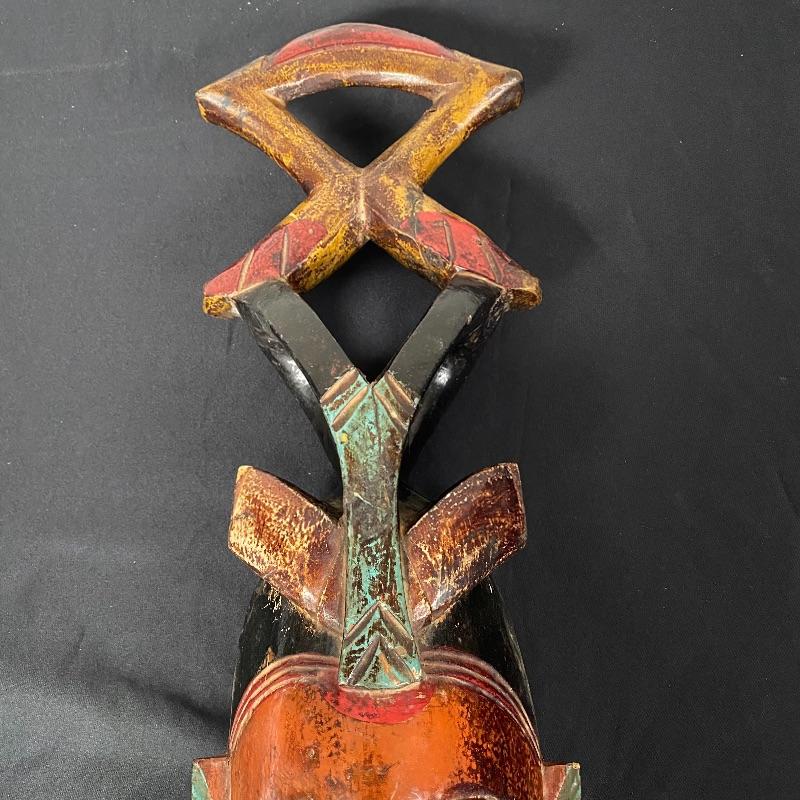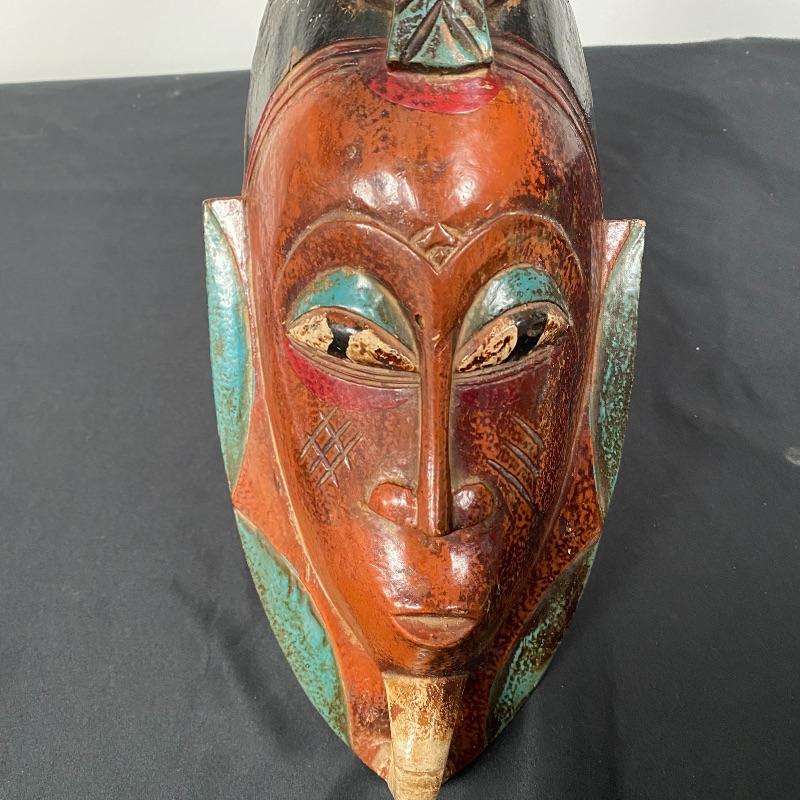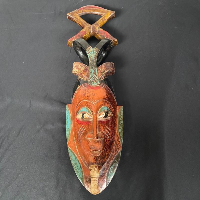 This lot includes one African mask that measures 23in x 6.5in. The mask is wood, colorful, and has a glossy finish. Shipping available.