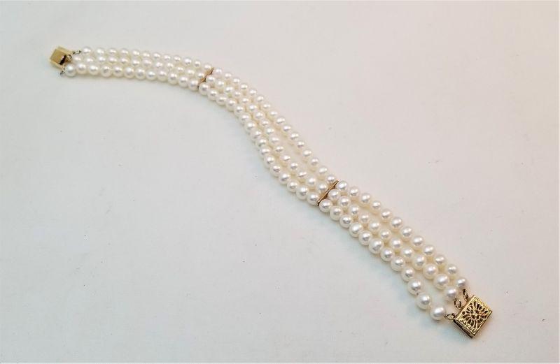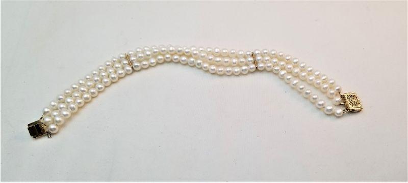 A classic! Lovely 3-strand cultured pearl bracelet - 7.5" long - 14kt gold clasp. Excellent condition.