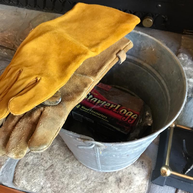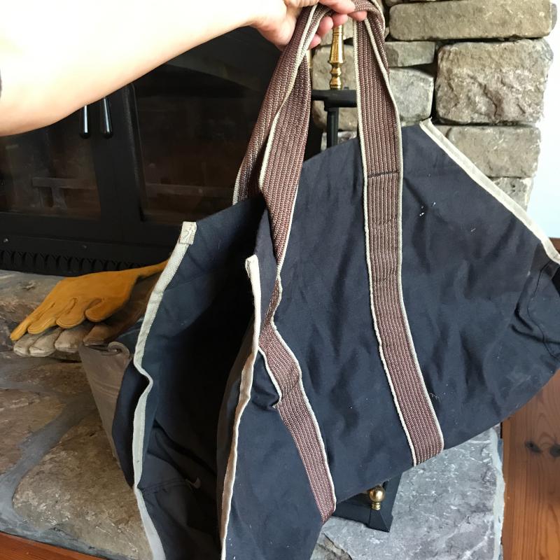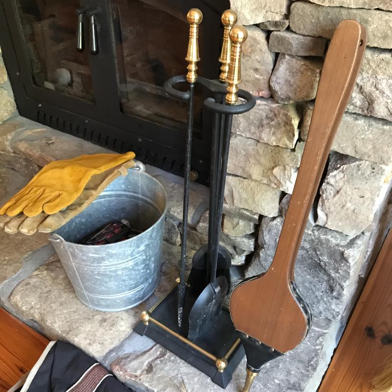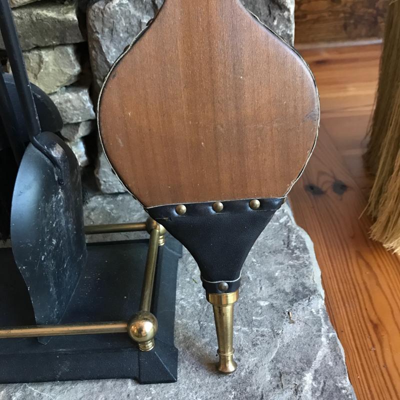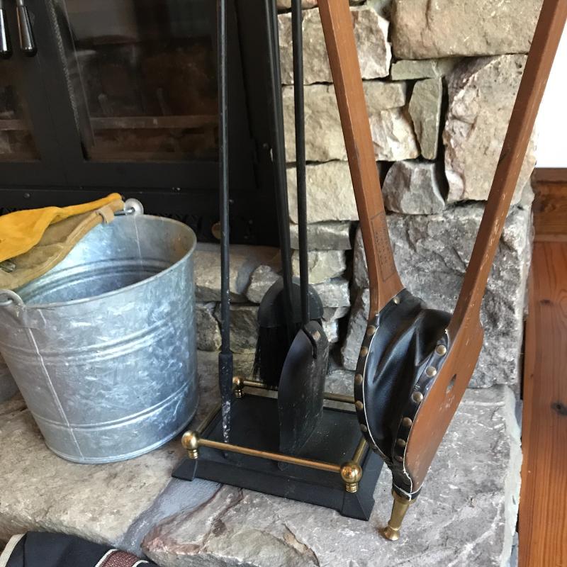Fireplace tool set, Bellow by Seymour Mfg Co,, Canvas bag for wood, leather gloves and galvanized bucket. No shipping. Local pick up only in Asheville