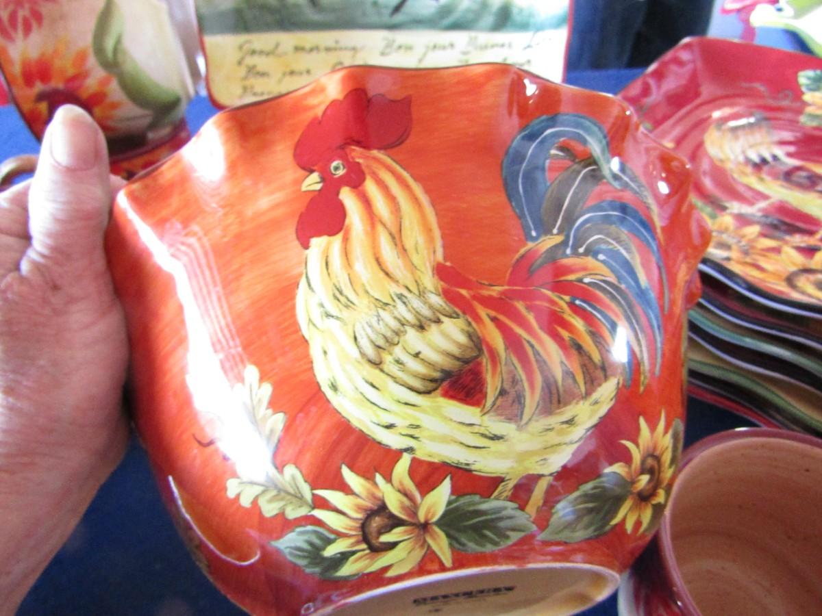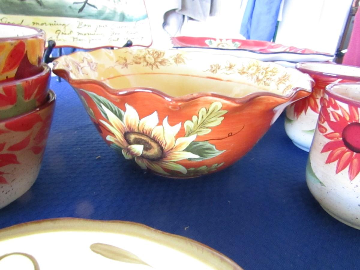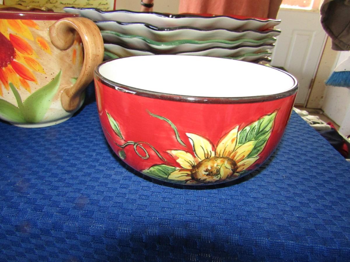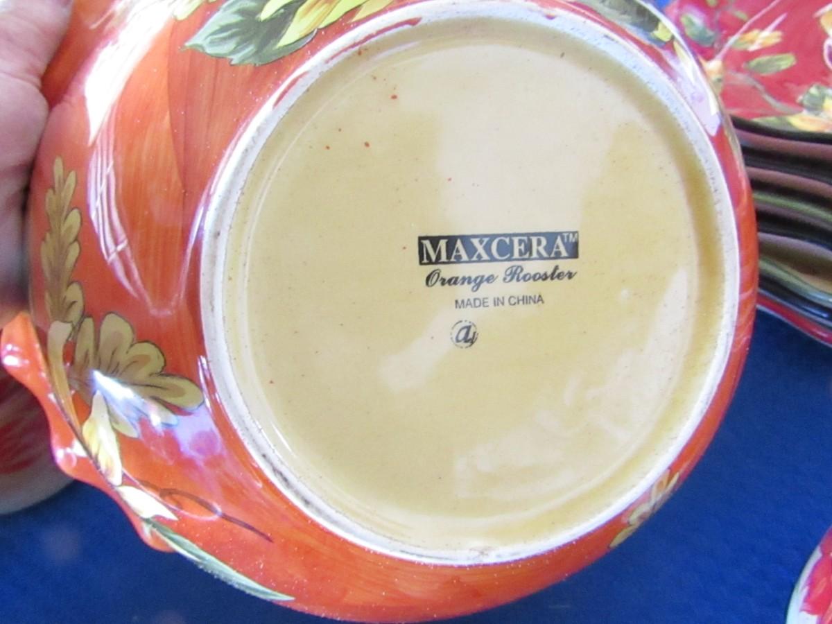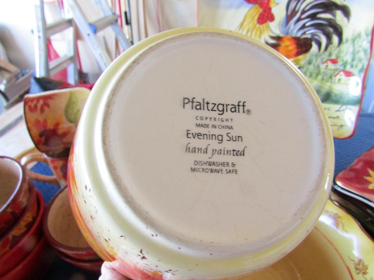 2 TYPES OF DISHES THAT GO WELL TOGETHER. SOME ARE BY PFALTZGRAFF "EVENING SUN" WHICH IS HAND-PAINTED AND DISHWASHER AND MICROWAVE SAFE. ALSO PIECES FROM MAXCERA "ORANGE ROOSTER". & "VILLAGE ROOSTER SUNFLOWER". THERE ARE SOME TINY CHIPS MAINLY ALONG THE RIMS OF THE BOWLS