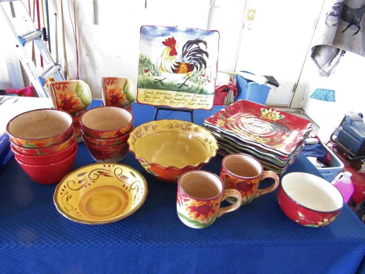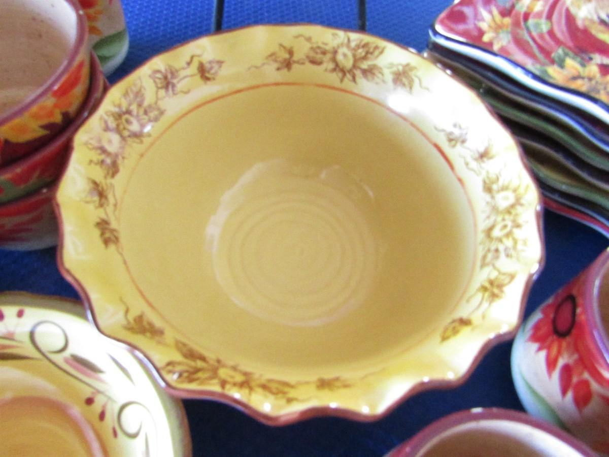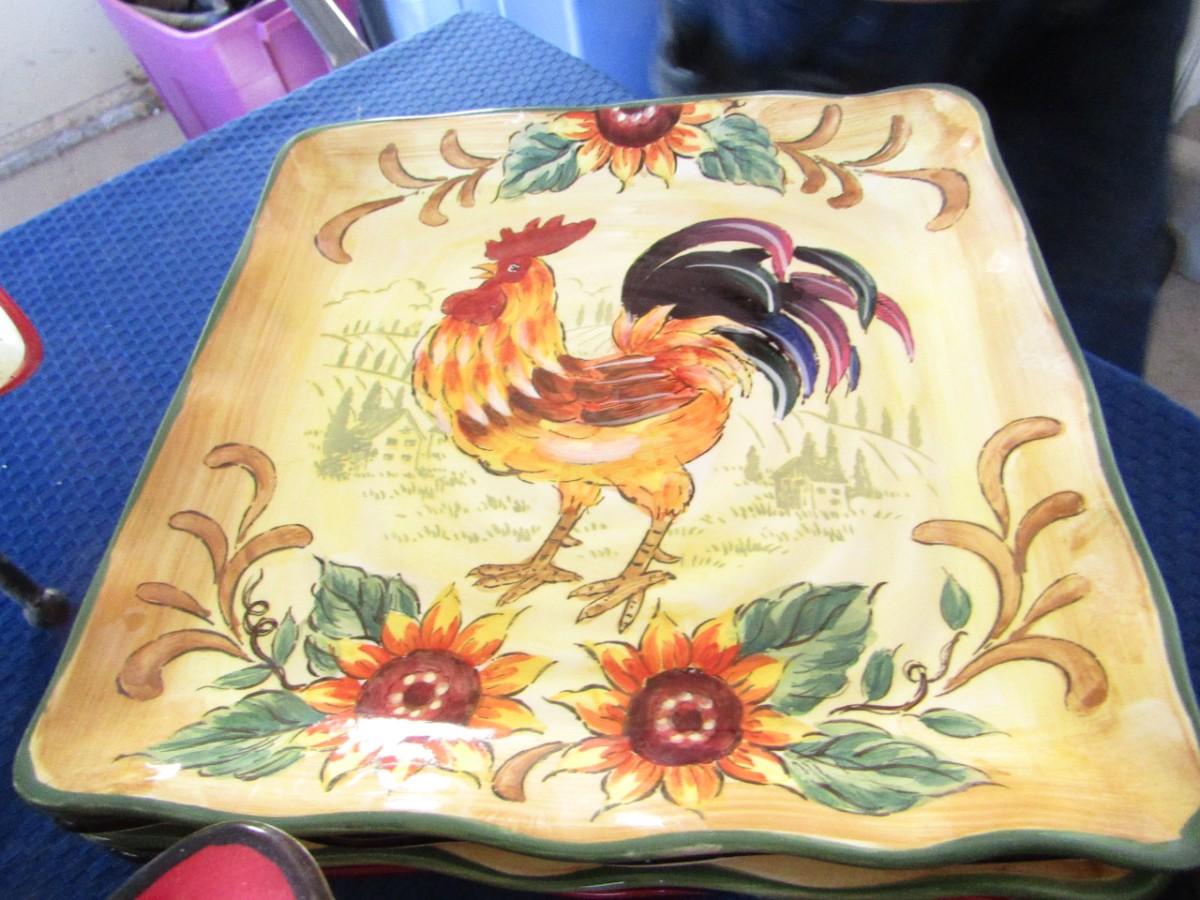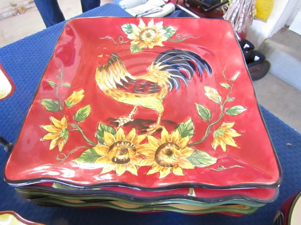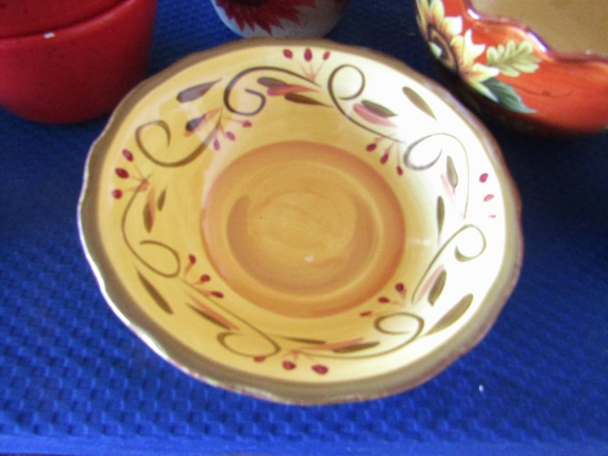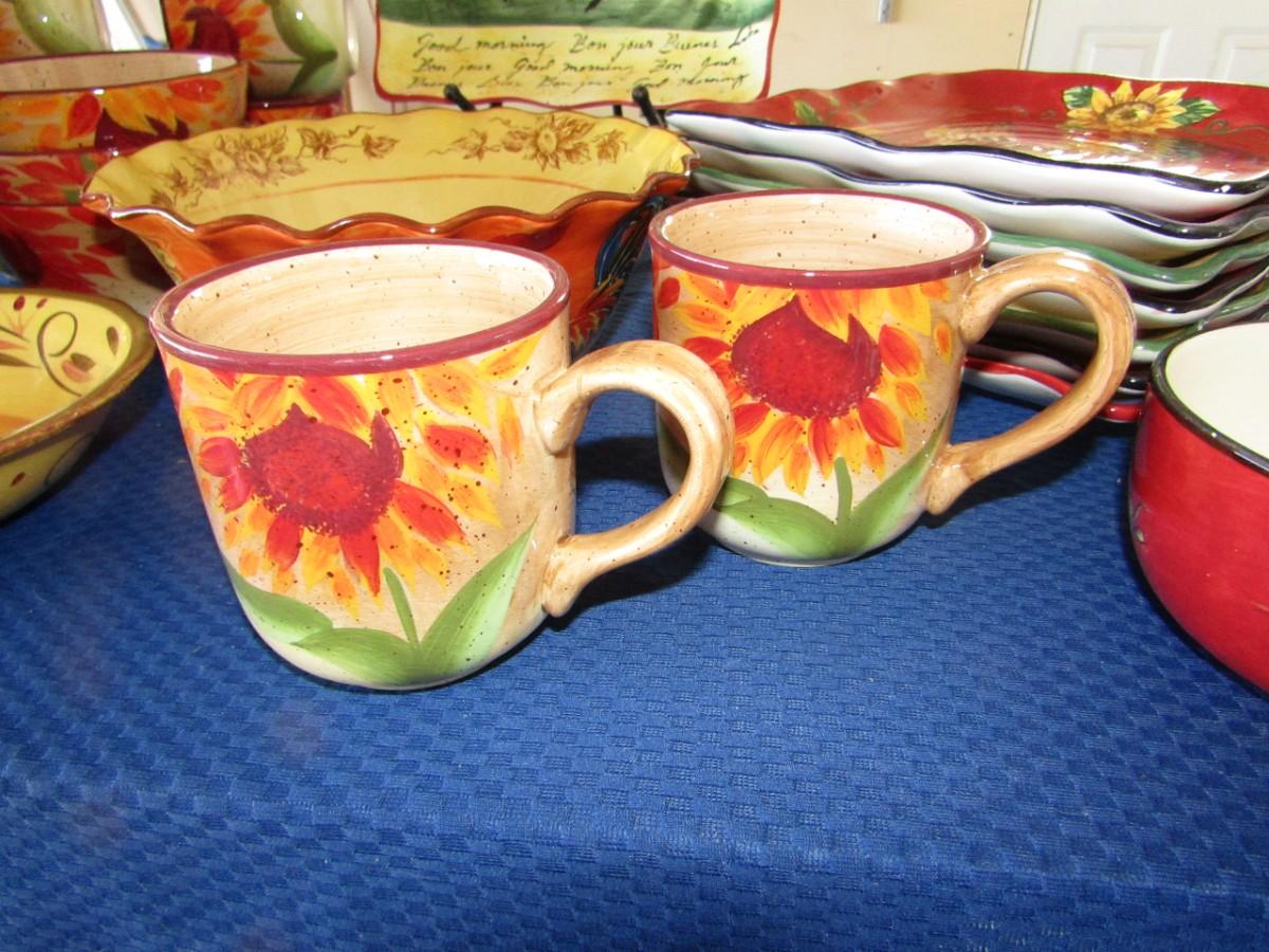 2 TYPES OF DISHES THAT GO WELL TOGETHER. SOME ARE BY PFALTZGRAFF "EVENING SUN" WHICH IS HAND-PAINTED AND DISHWASHER AND MICROWAVE SAFE. ALSO PIECES FROM MAXCERA "ORANGE ROOSTER". & "VILLAGE ROOSTER SUNFLOWER". THERE ARE SOME TINY CHIPS MAINLY ALONG THE RIMS OF THE BOWLS
