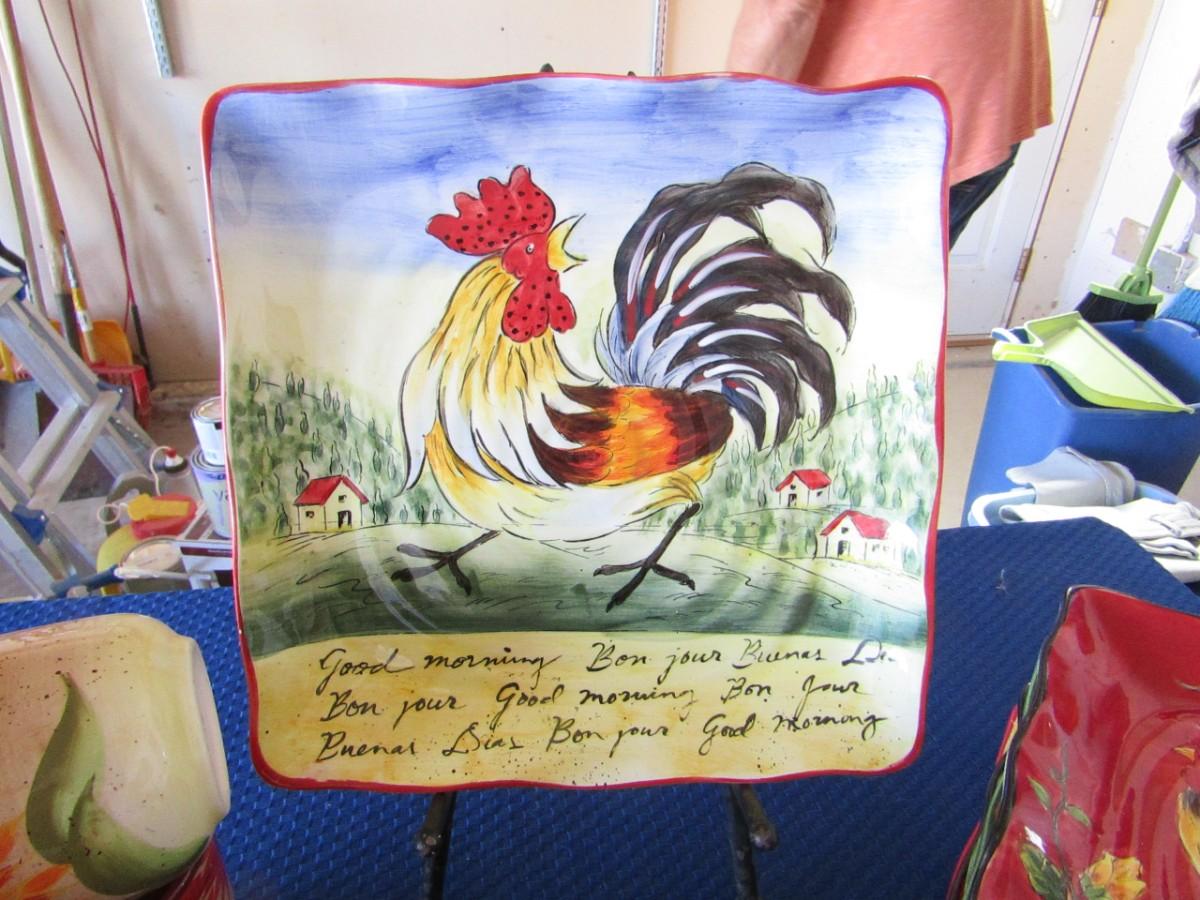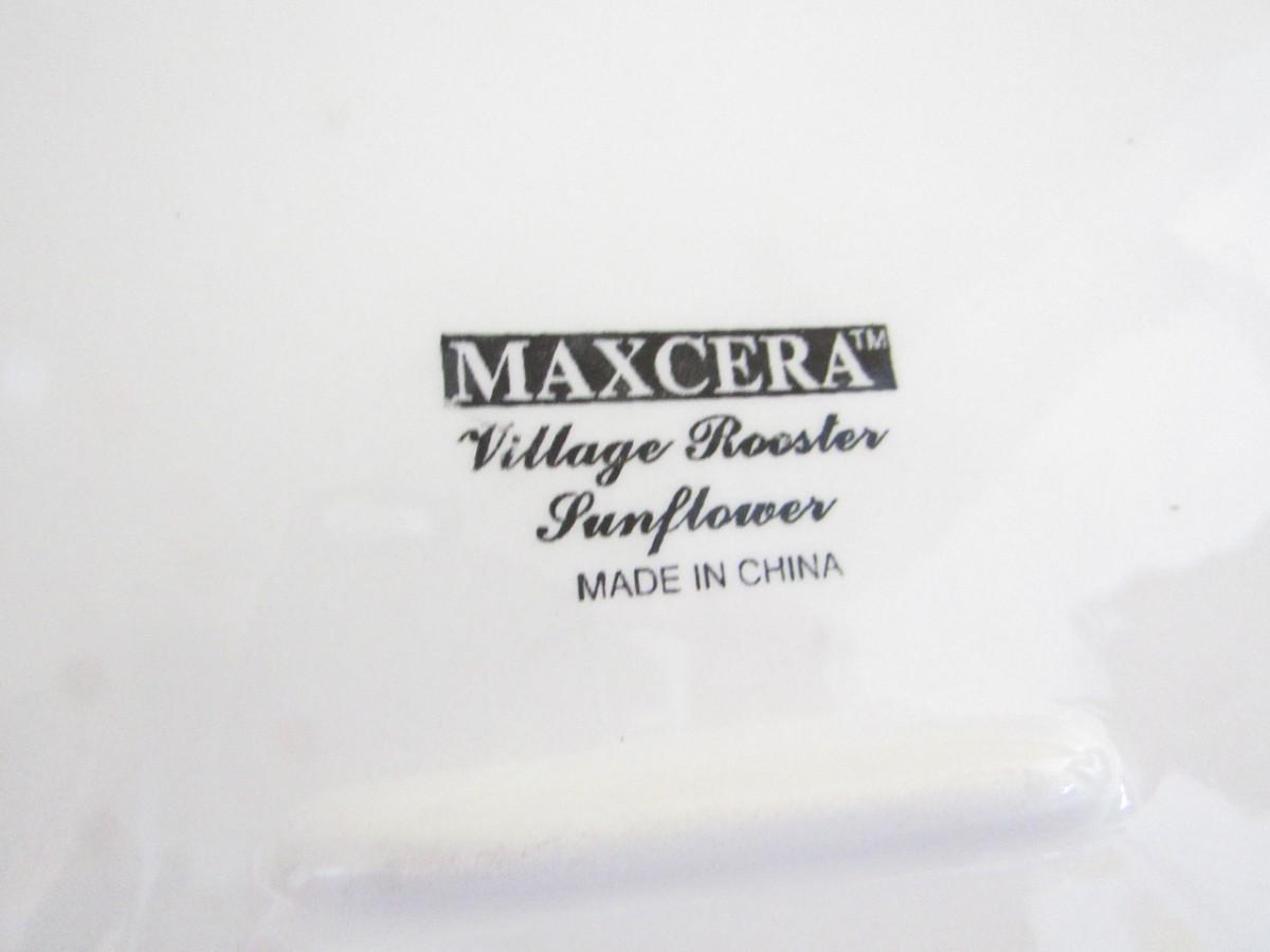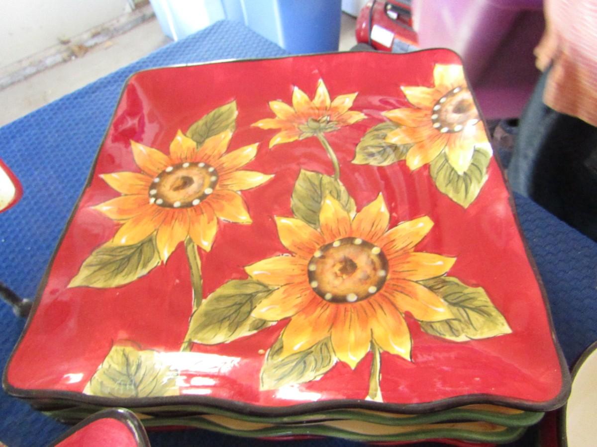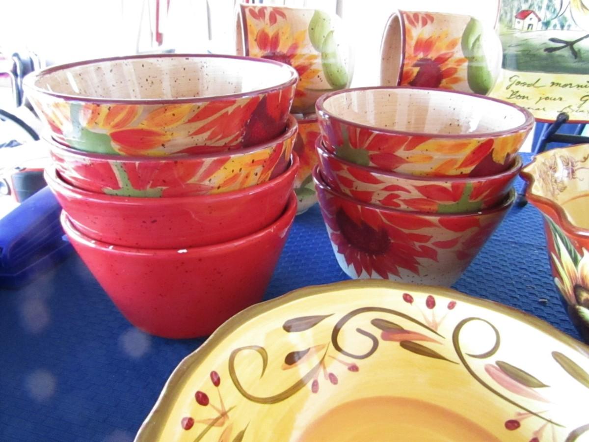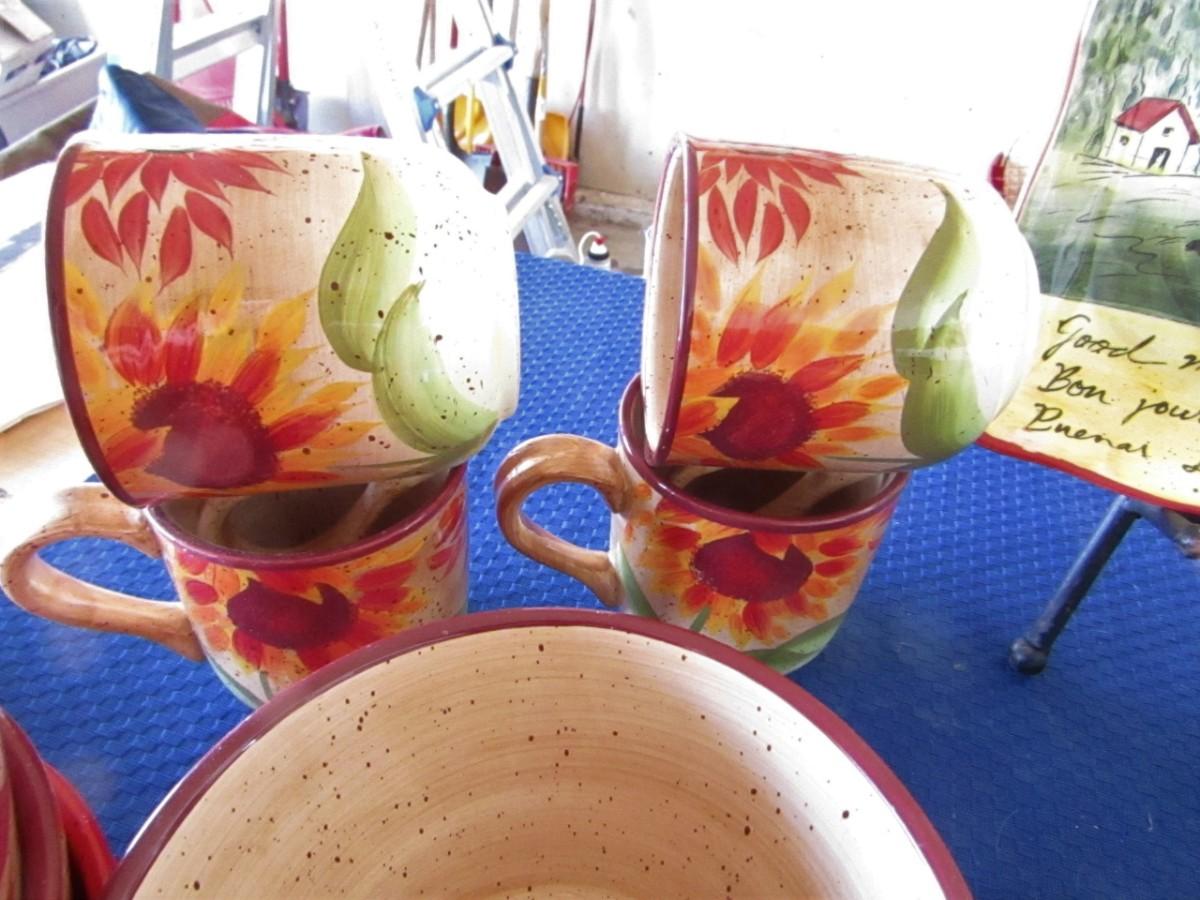 2 TYPES OF DISHES THAT GO WELL TOGETHER. SOME ARE BY PFALTZGRAFF "EVENING SUN" WHICH IS HAND-PAINTED AND DISHWASHER AND MICROWAVE SAFE. ALSO PIECES FROM MAXCERA "ORANGE ROOSTER". & "VILLAGE ROOSTER SUNFLOWER". THERE ARE SOME TINY CHIPS MAINLY ALONG THE RIMS OF THE BOWLS