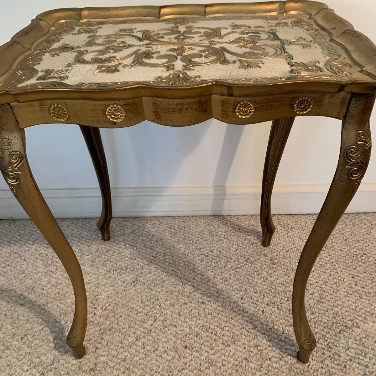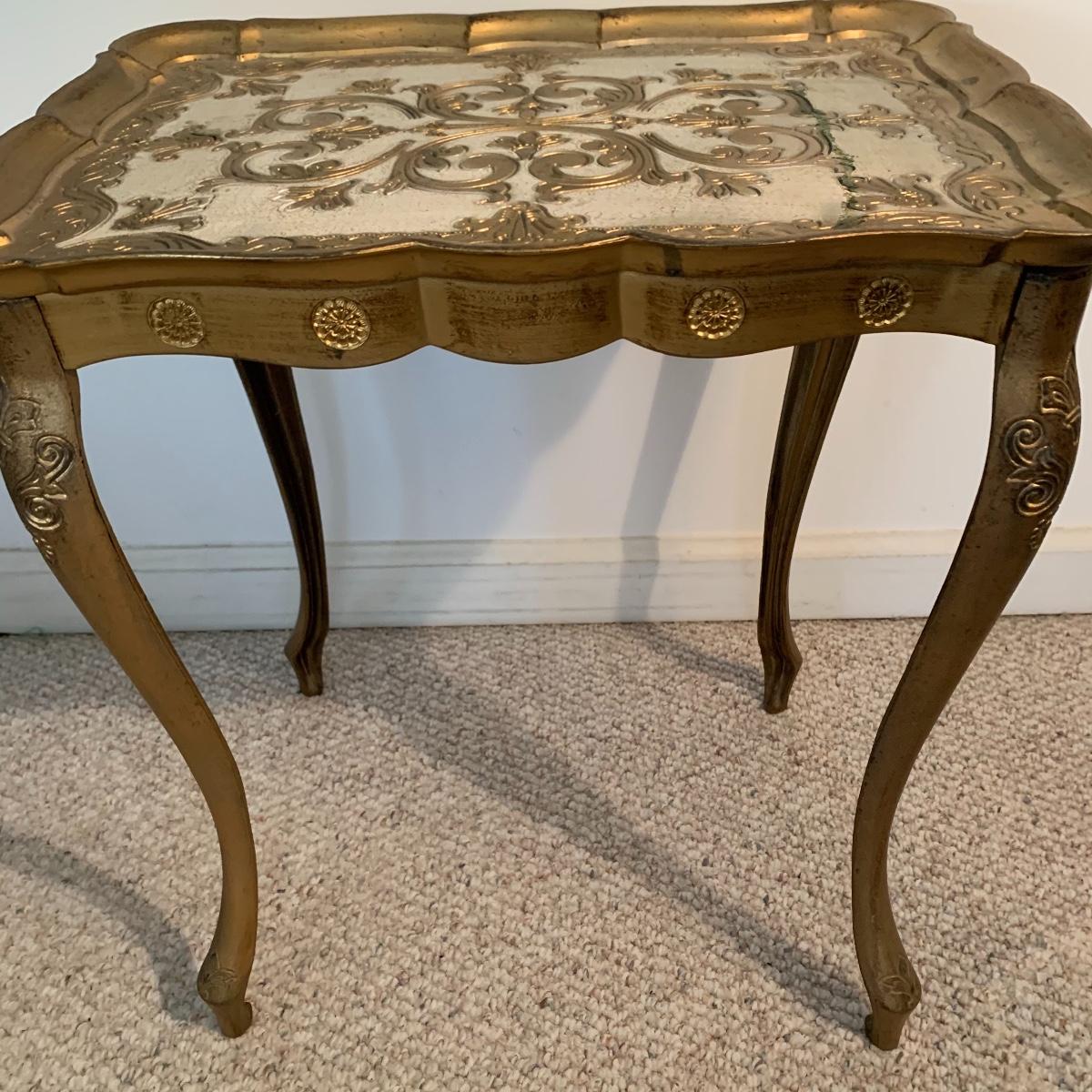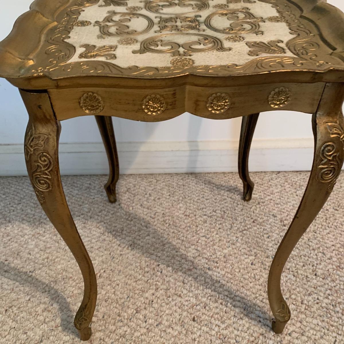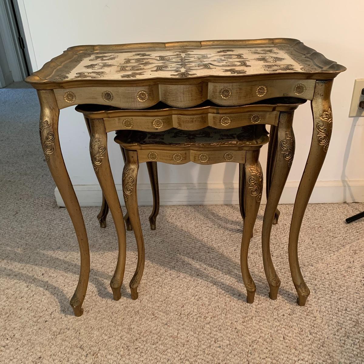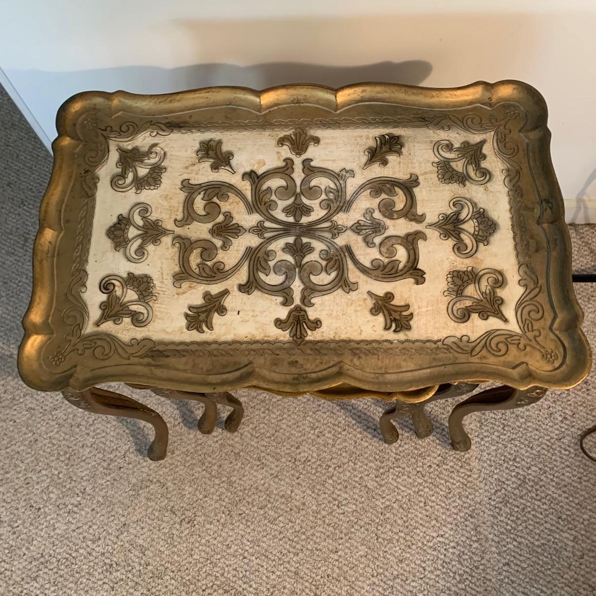 Decorate indoors or outdoors with these adorable Italian nesting tables. All three feature detailed engraved trim and are stamped “Made In Florence Italy”. The tallest of these three is 22” tall X 22” wide X 14” deep. The second measures 19” tall X 17” wide X 13” deep. The last is 17” tall X 12” X 12” deep. All three are made of plastic, meaning they will last a long time!. Local pickup only.