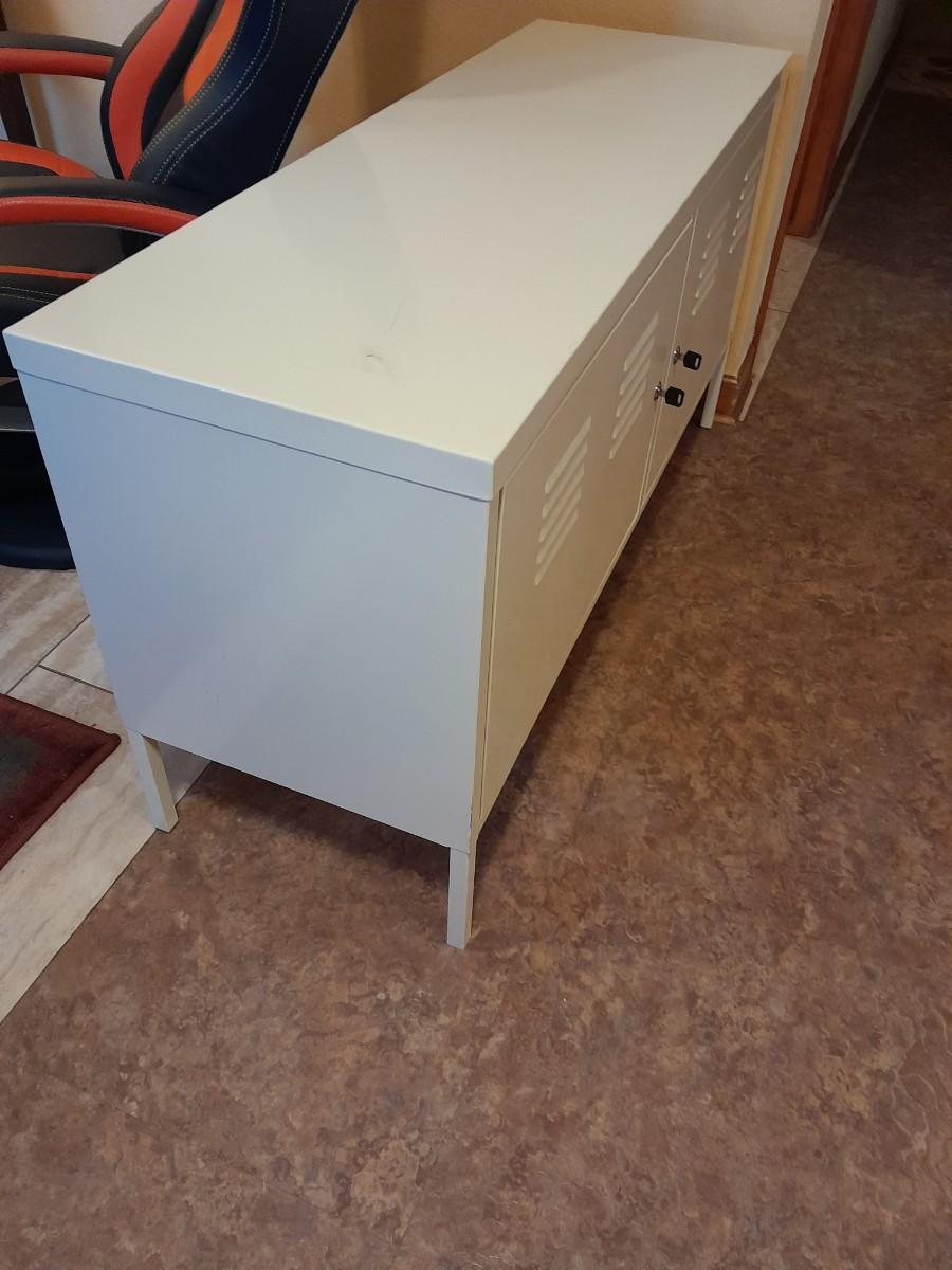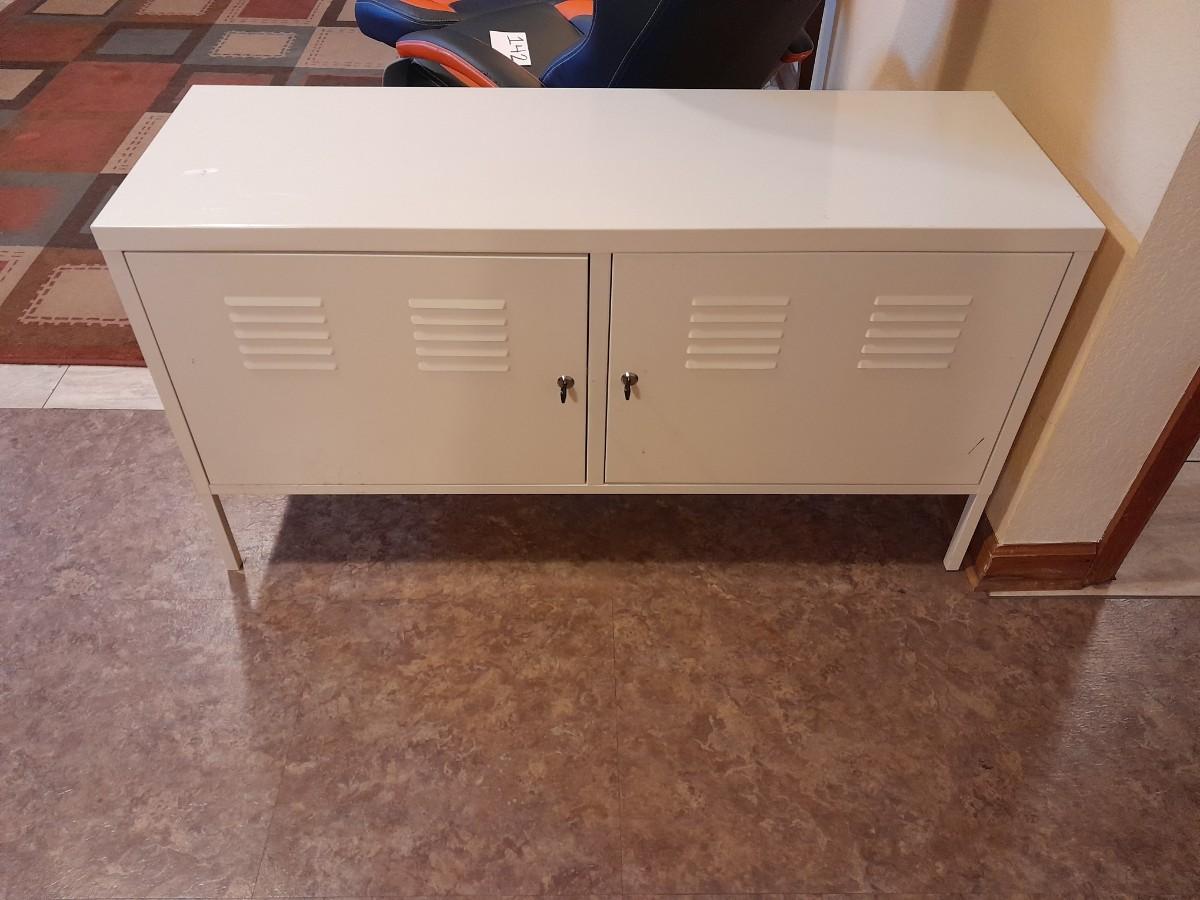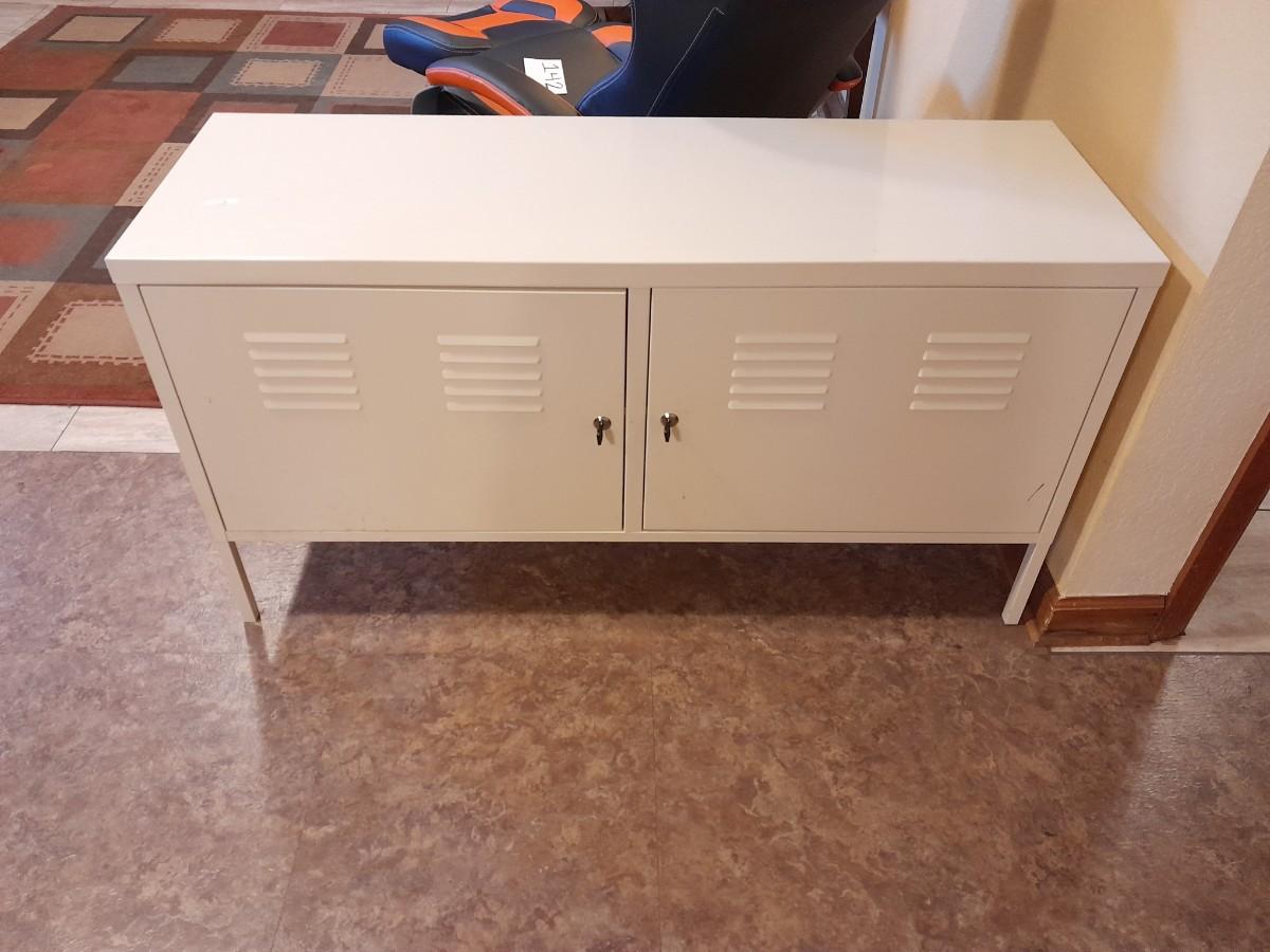 LOCKING METAL TWO DOOR STORAGE CABINET / FOOT LOCKER AND TWO KETS, WITH SHELVES INSIDE 47" X 16" X 23". COMES WITH A BLACK CHAIR