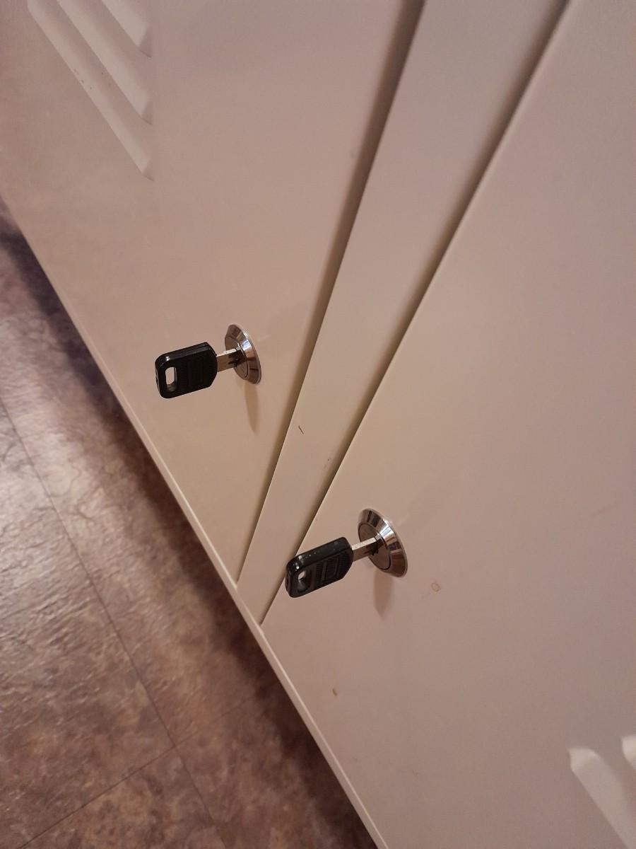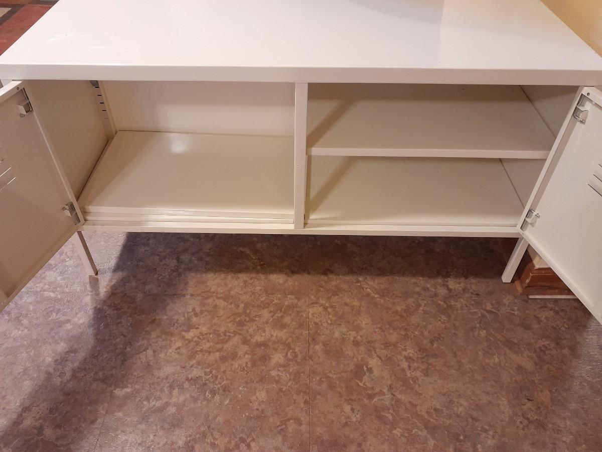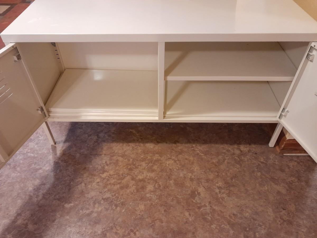 LOCKING METAL TWO DOOR STORAGE CABINET / FOOT LOCKER AND TWO KETS, WITH SHELVES INSIDE 47" X 16" X 23". COMES WITH A BLACK CHAIR