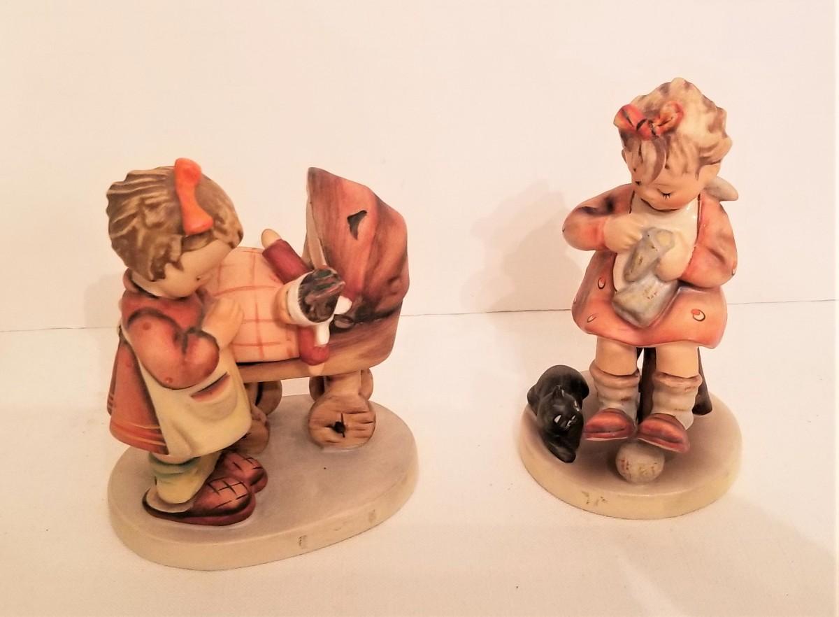 Two sweet vintage bisque Hummel figures - no boxes - good condition. "Doll Mother" and "Knitter" - each 4.5" tall.