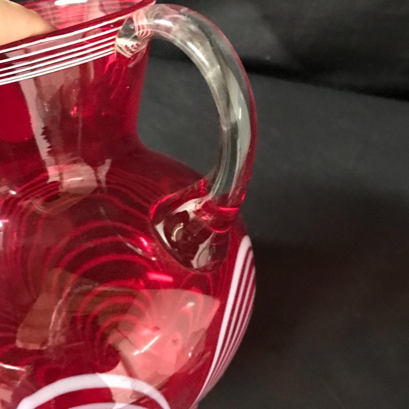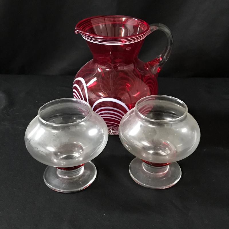 This lot includes a pretty red glass pitcher that appears to be handmade of blown glass. Two tea light candle holders also included. Pitcher is approx. 8” tall and candle holders are approx. 5” tall.