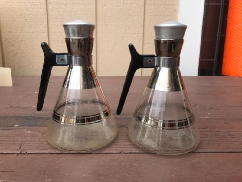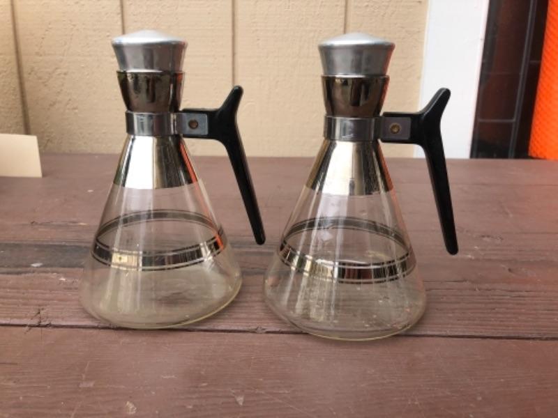 Lot 141: Set of 2 Pyrex Carafes: 2 Cups, Tin/Cork Stoppers, Black Handles, Gold Stripe, 1950-60’s