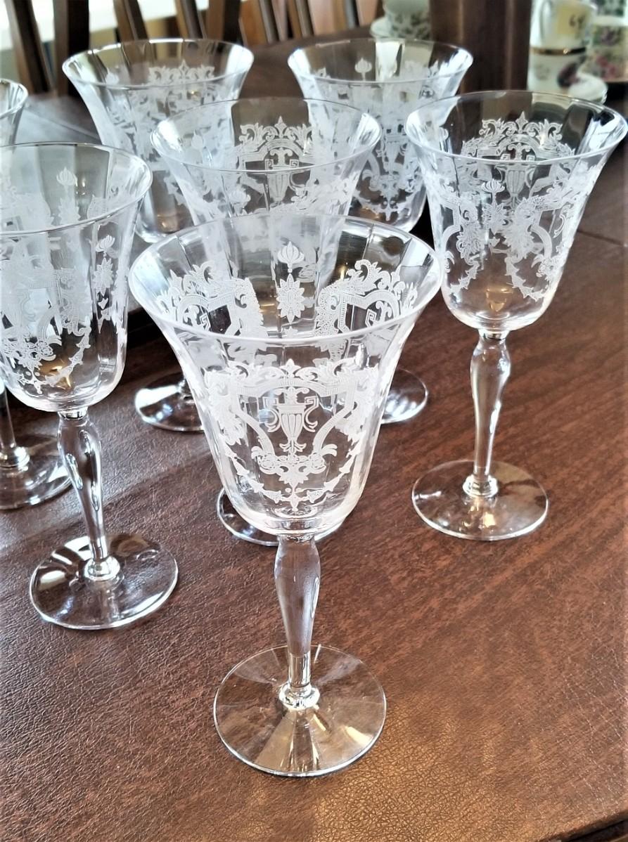 These glasses match the other two lots that were earlier in the sale - these stand 7.75" tall - lovely vintage acid-etched wine glasses - all in great condition.
