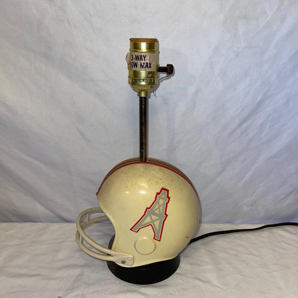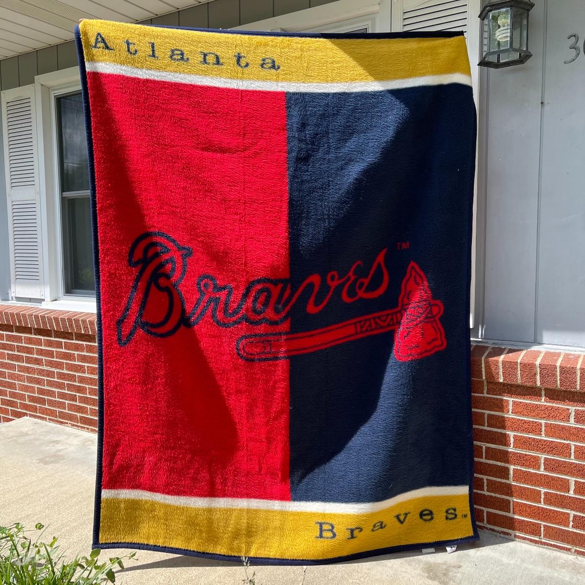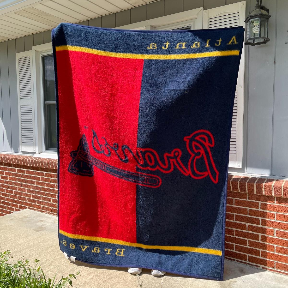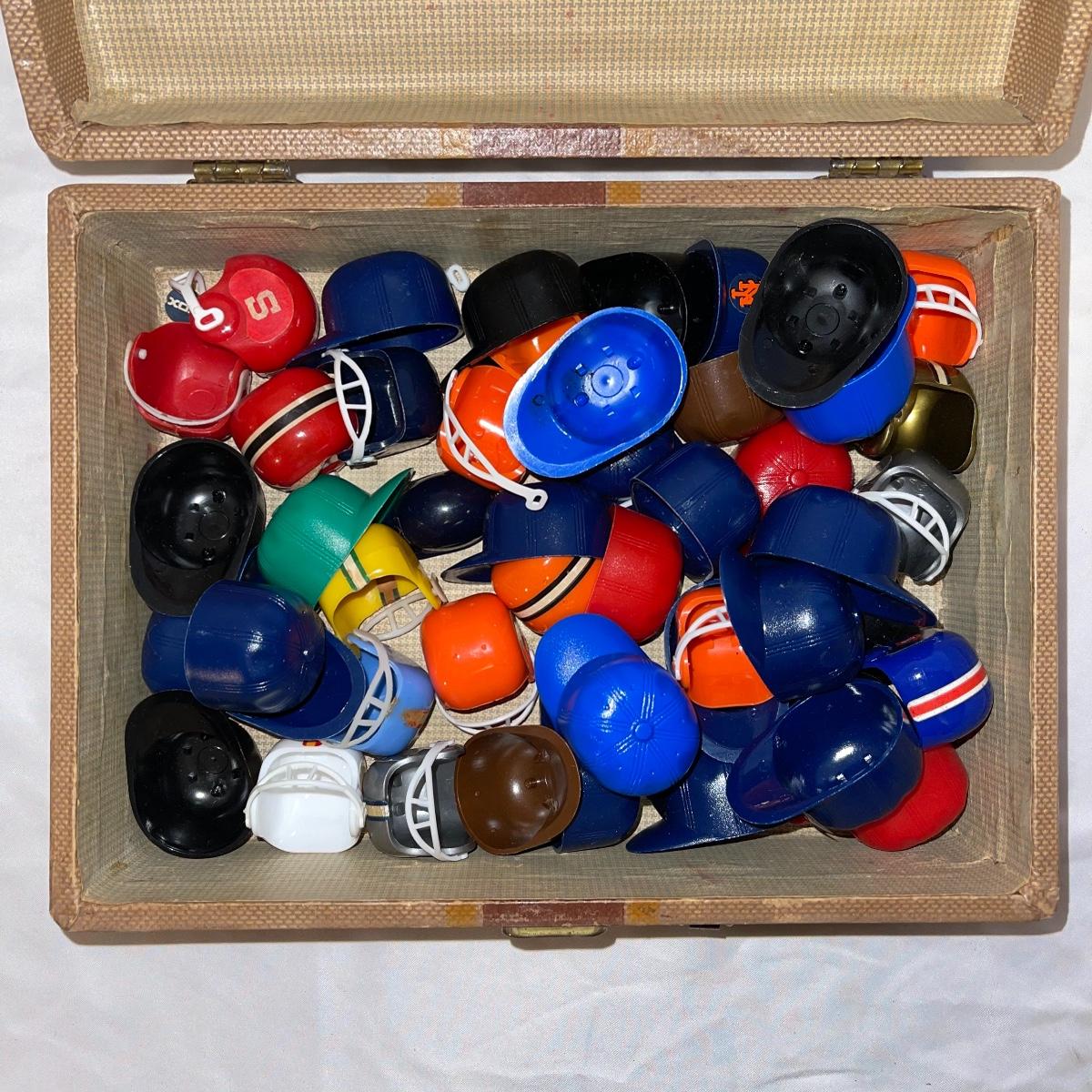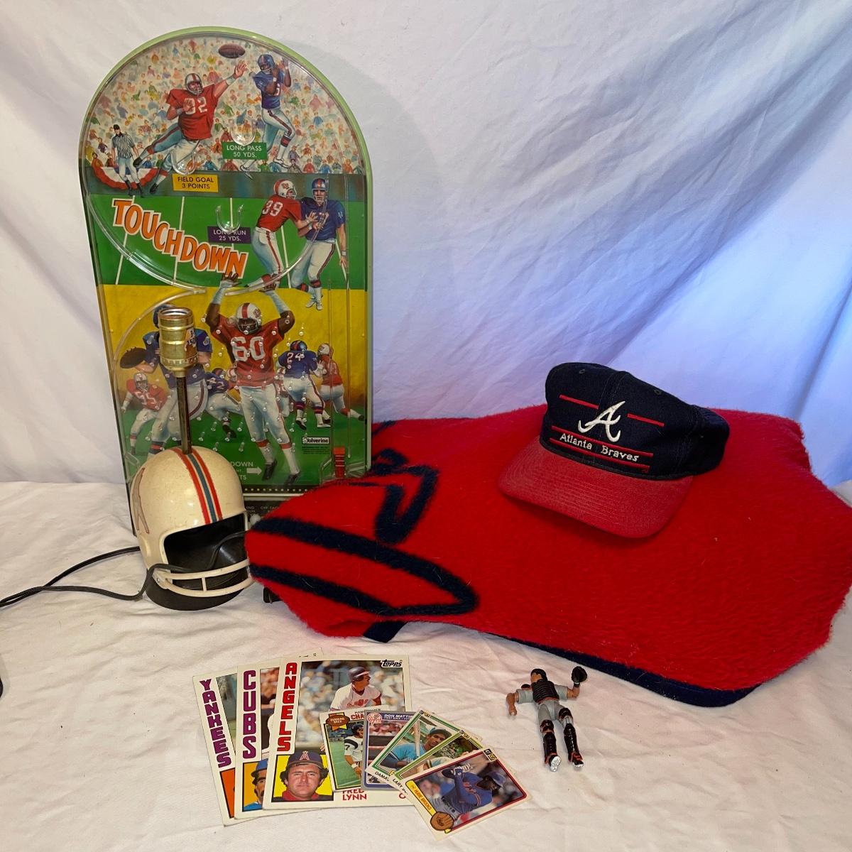 Sports memorabilia includes an Atlanta Braves blanket and hat, a box of mini helmets, baseball cards, a helmet lamp, and a football themed pinball style game.