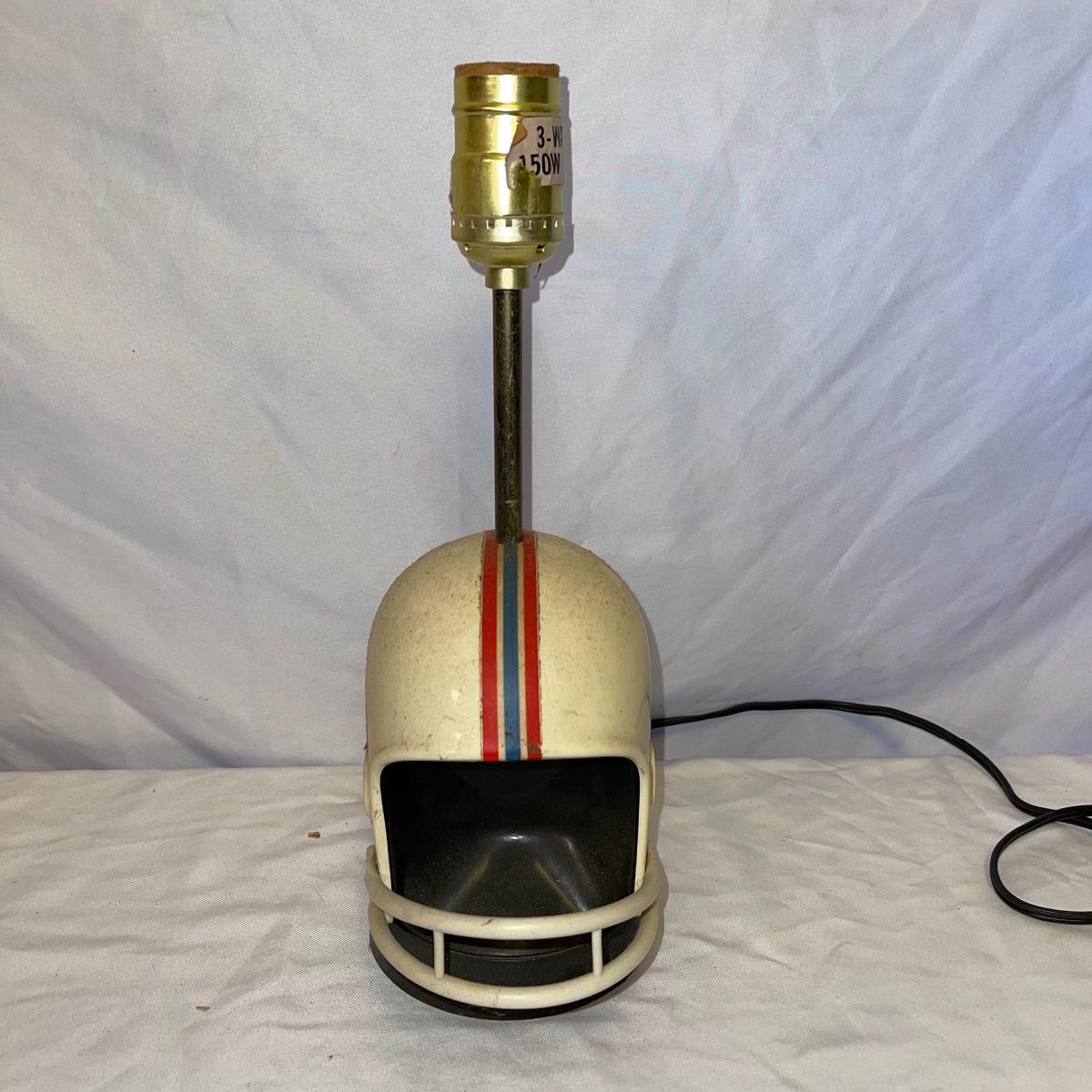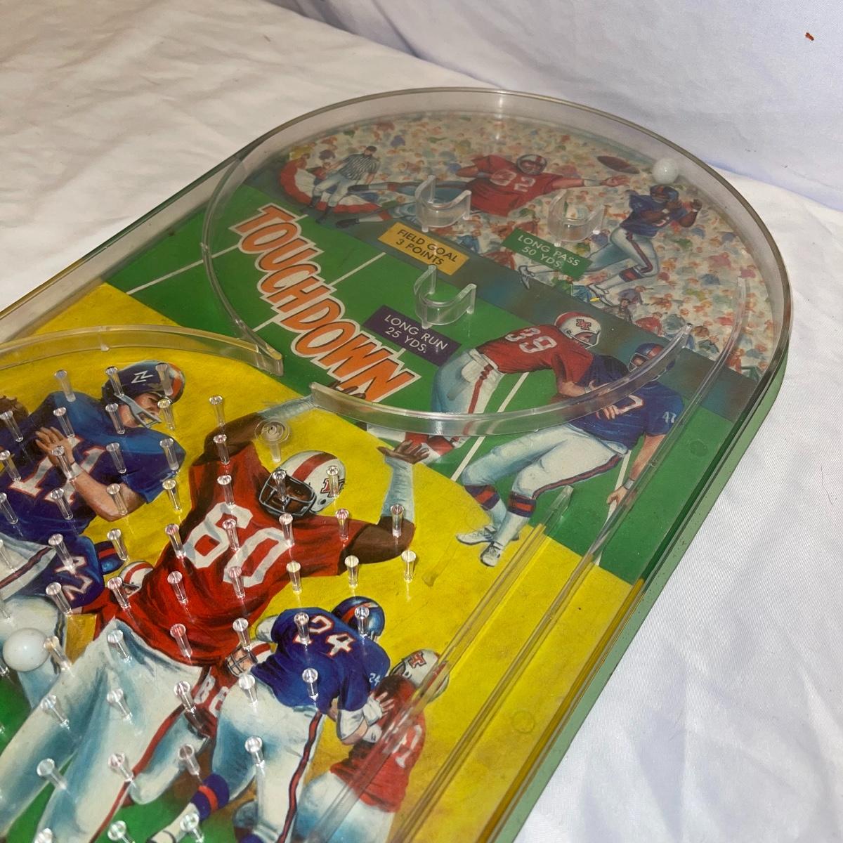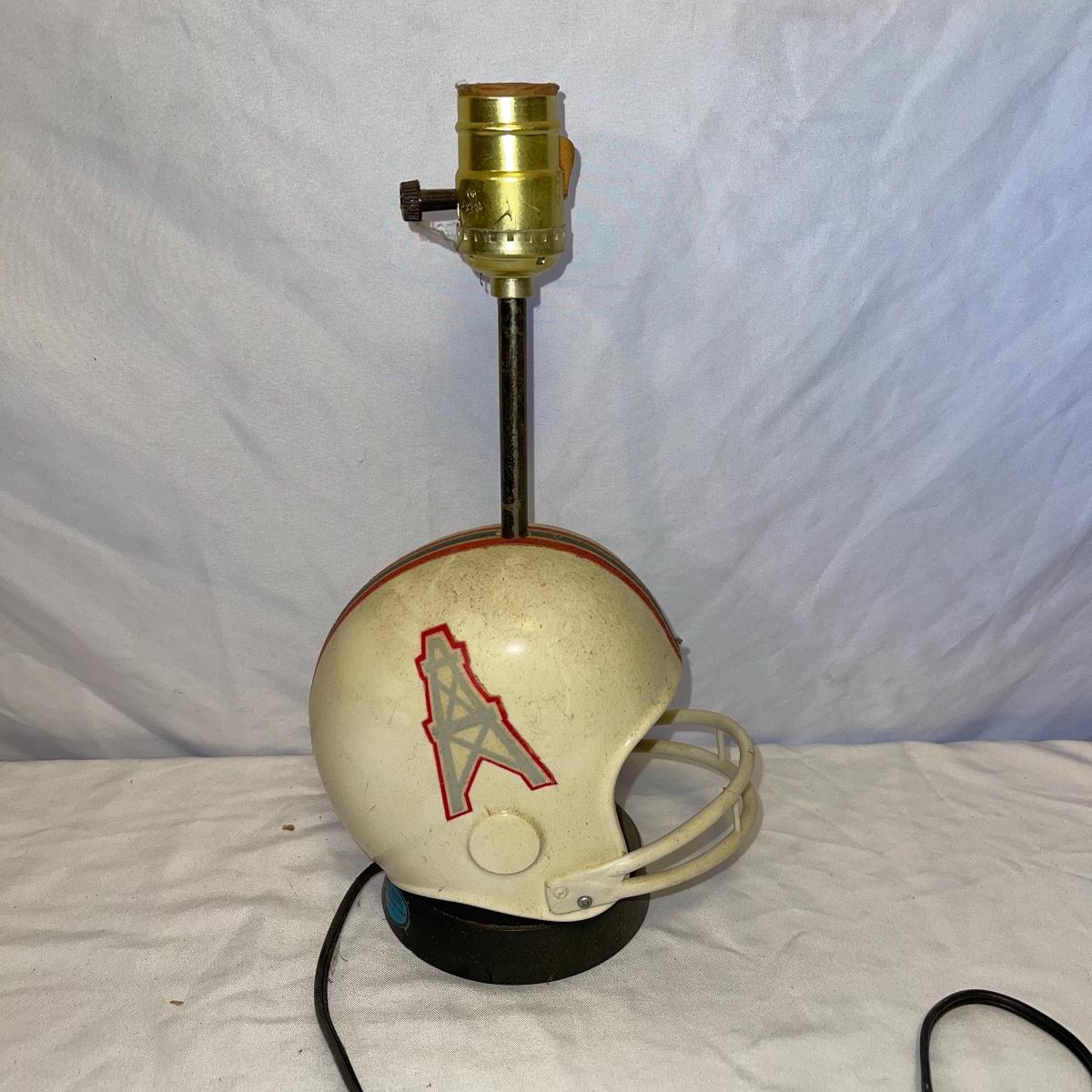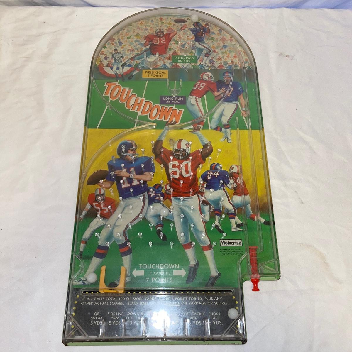 Sports memorabilia includes an Atlanta Braves blanket and hat, a box of mini helmets, baseball cards, a helmet lamp, and a football themed pinball style game.
