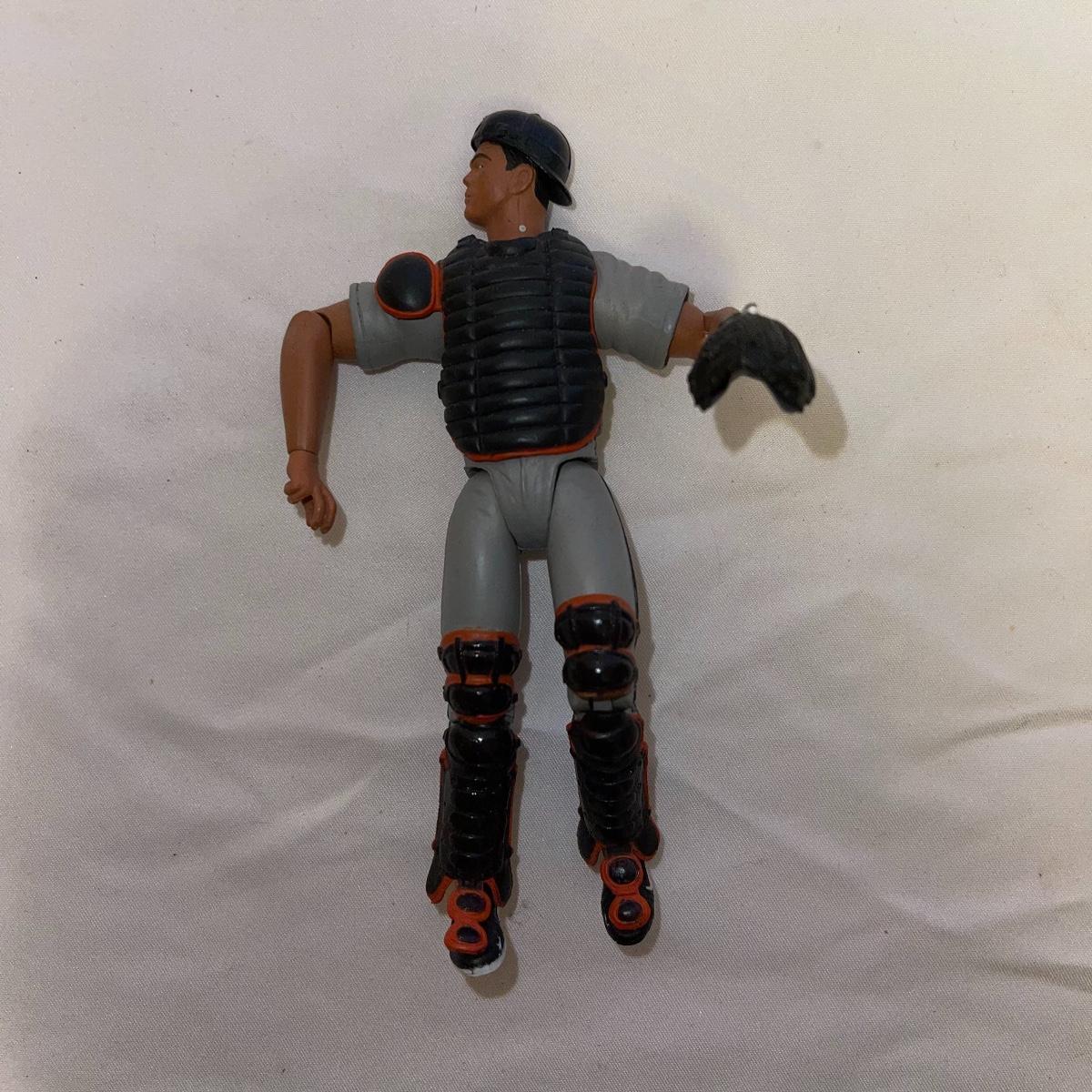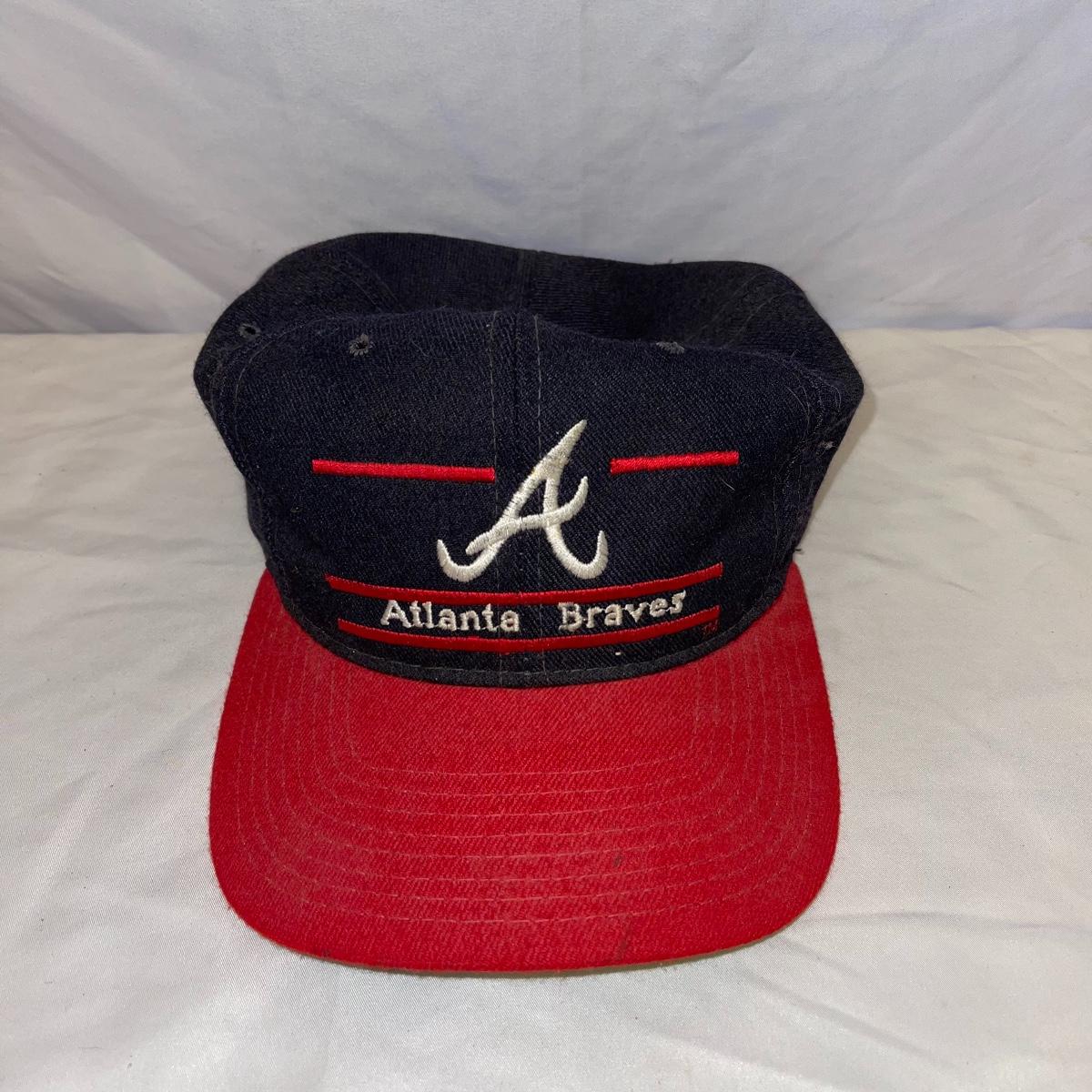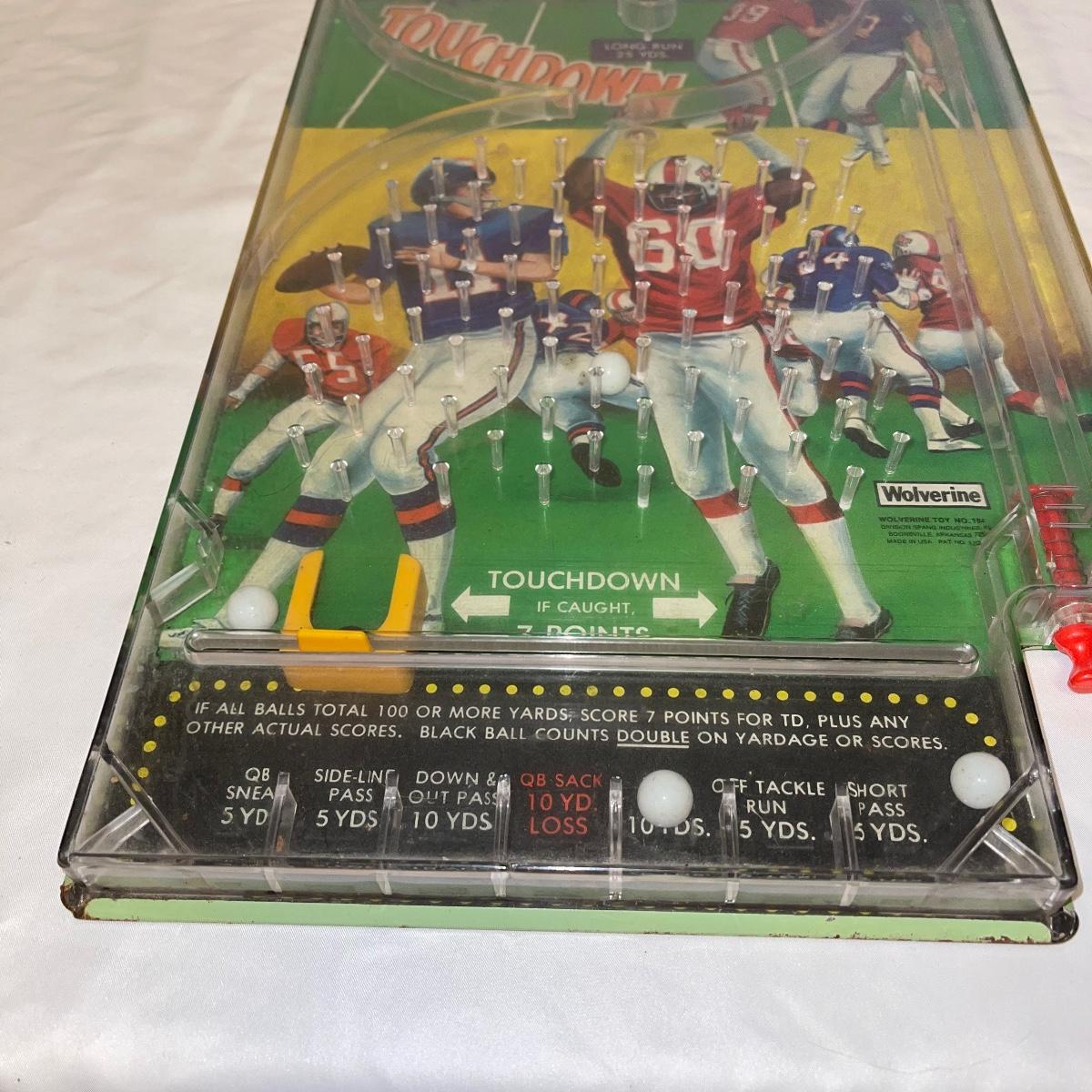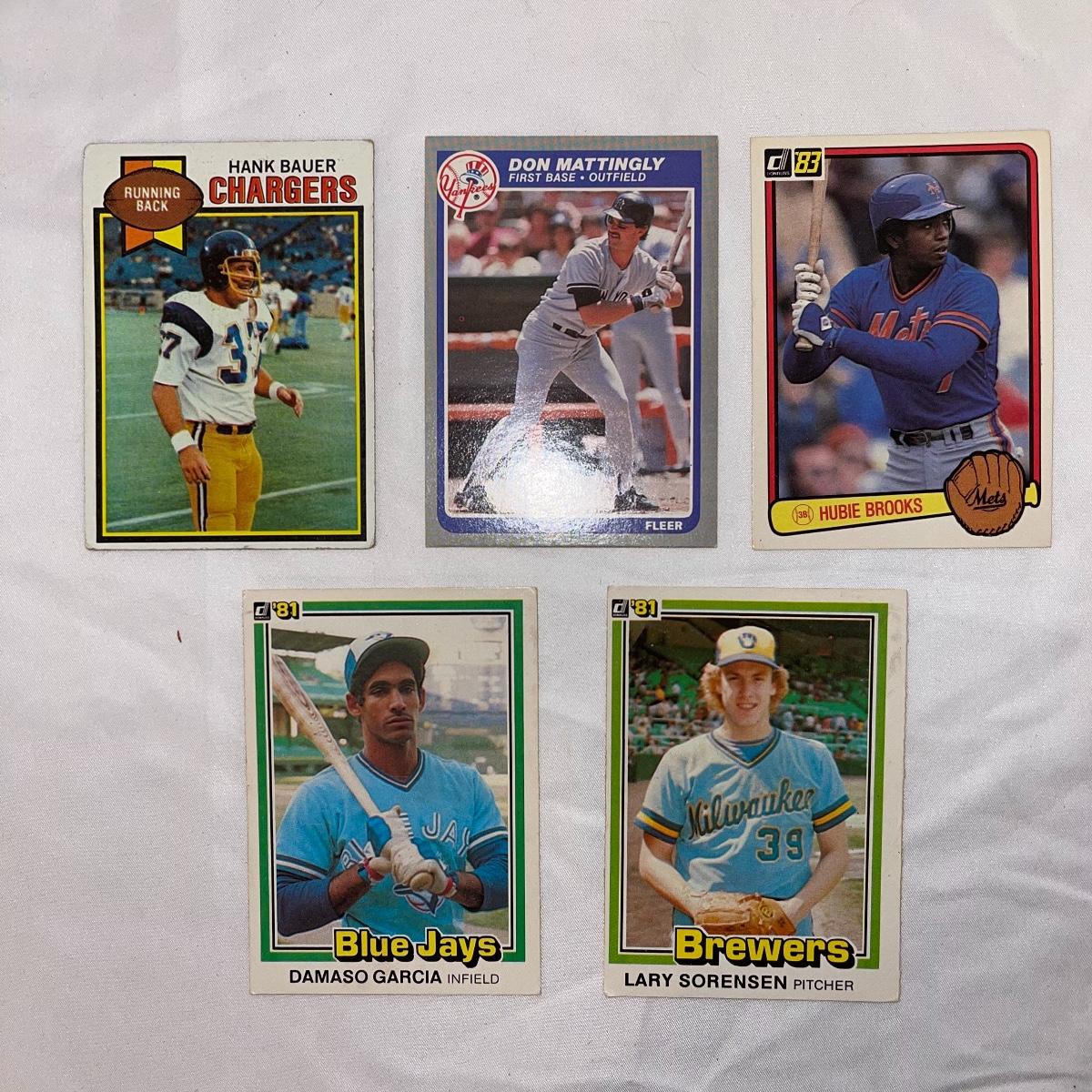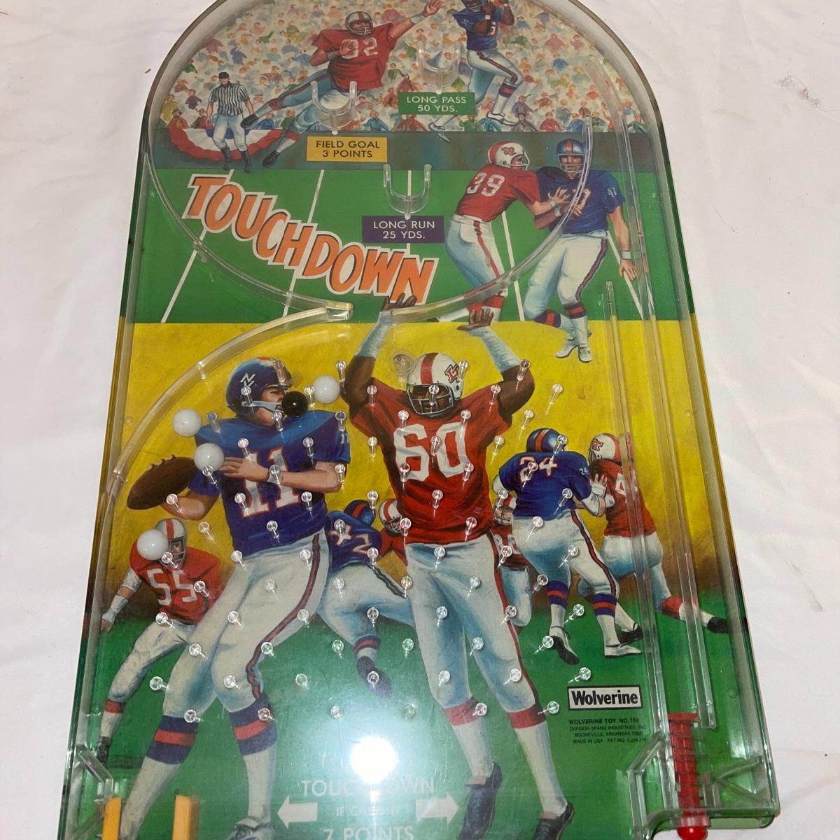 Sports memorabilia includes an Atlanta Braves blanket and hat, a box of mini helmets, baseball cards, a helmet lamp, and a football themed pinball style game.