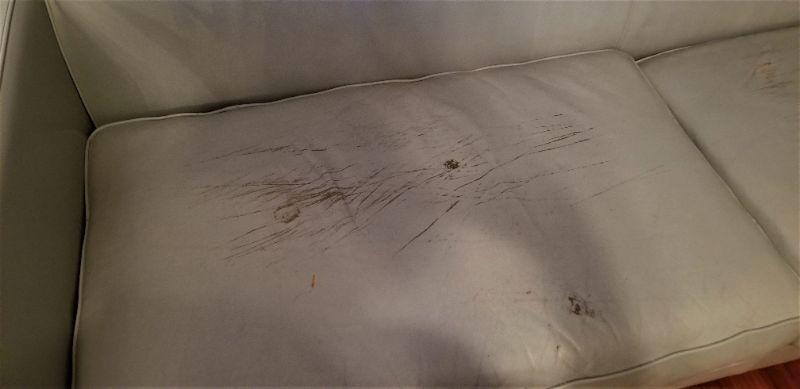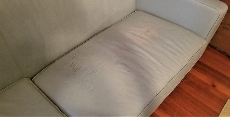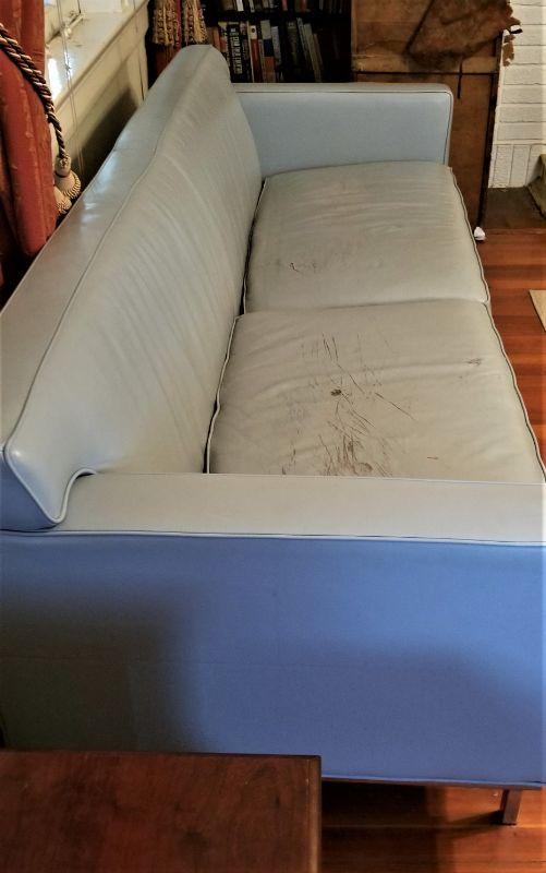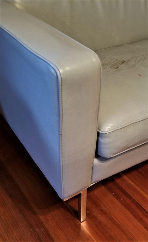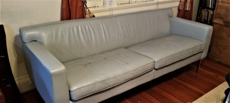 Too bad the dog got the seat cushions in this contemporary teal leather sofa - the rest is actually in pretty good condition. If you are up for a project, the seat covers actually zip off of the seat cushions and they could be redone. 81.5" long, 31" deep, 30" tall. Chrome legs.