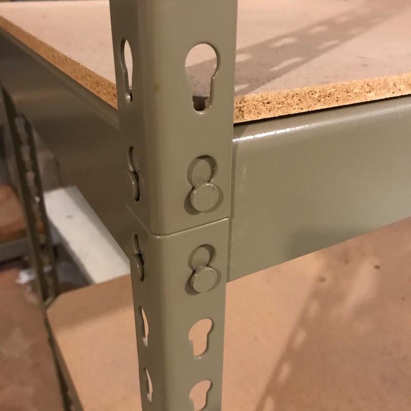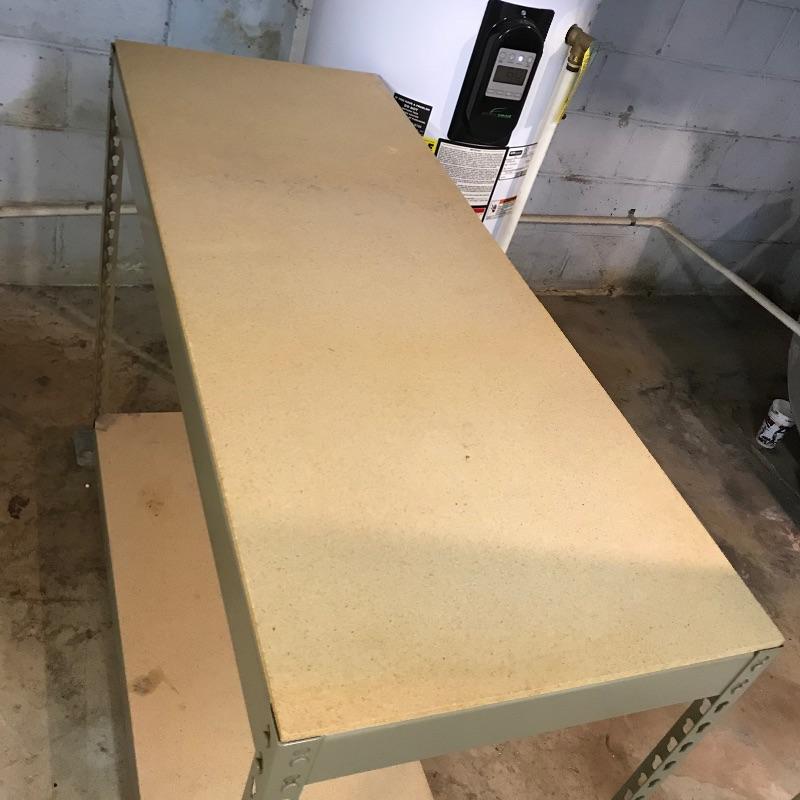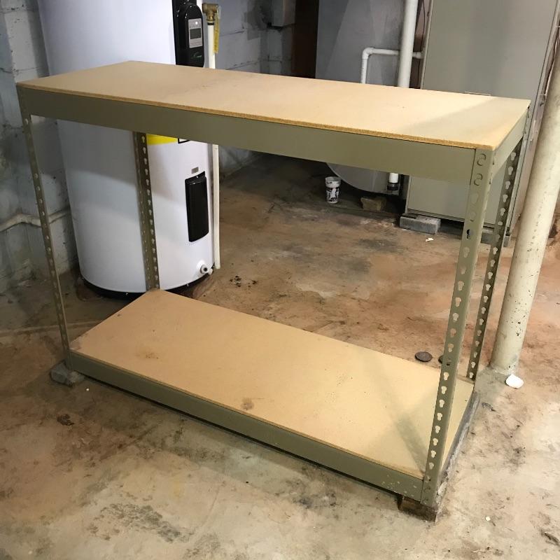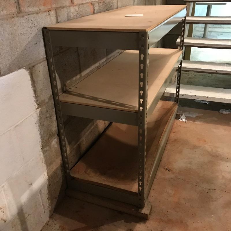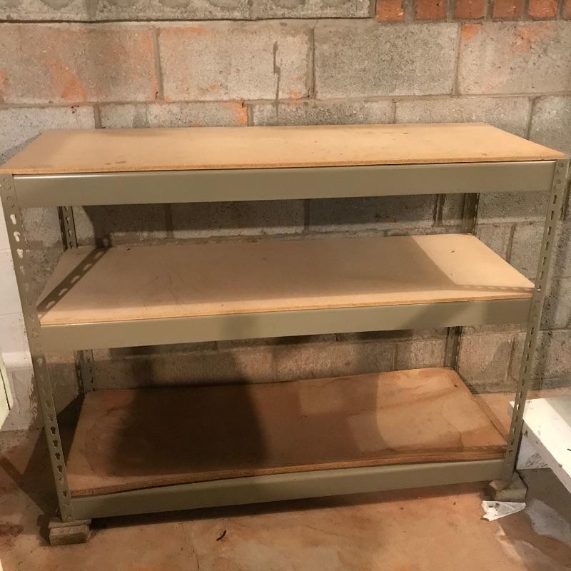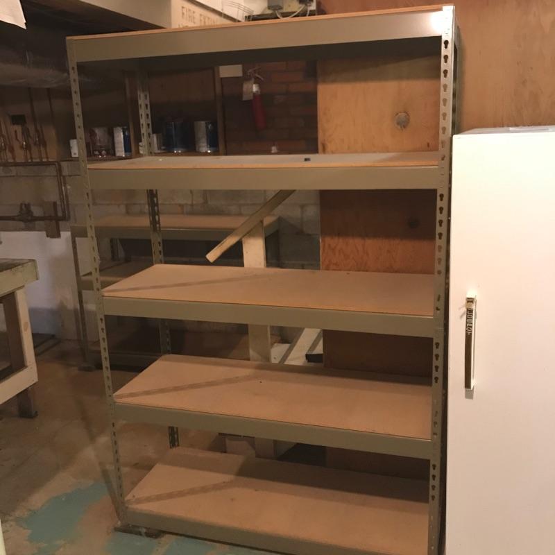 Three tan metal utility shelf units with pressed wood shelves. One unit has five shelves including the top, it measures 48” x 18.5” x 73”. The next two are the same size at 48” x 18.5” x 36” one with two shelves and one with three. It appears all units are interchangeable. One unit has a very bowed bottom shelf and would need to be replaced. All others appear in great shape. Local pick up only. Shelves will need to be taken up on flight of stairs with a corner before the top few steps. Bring help to load.