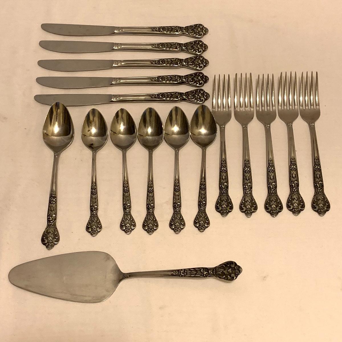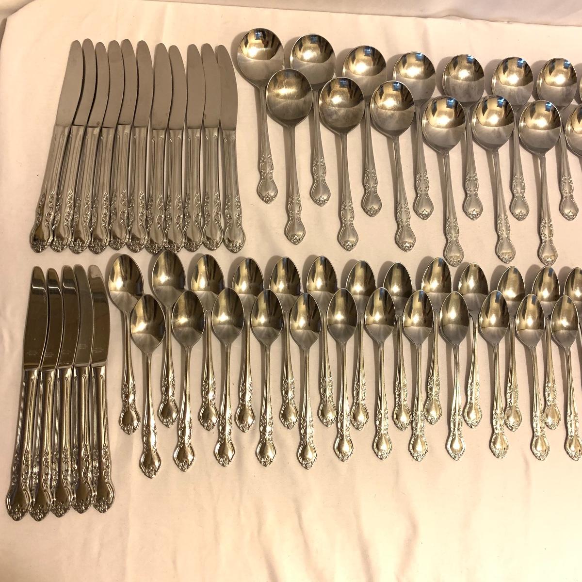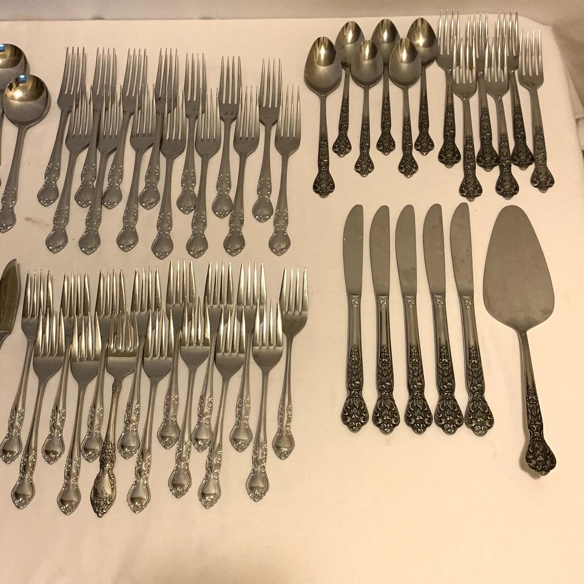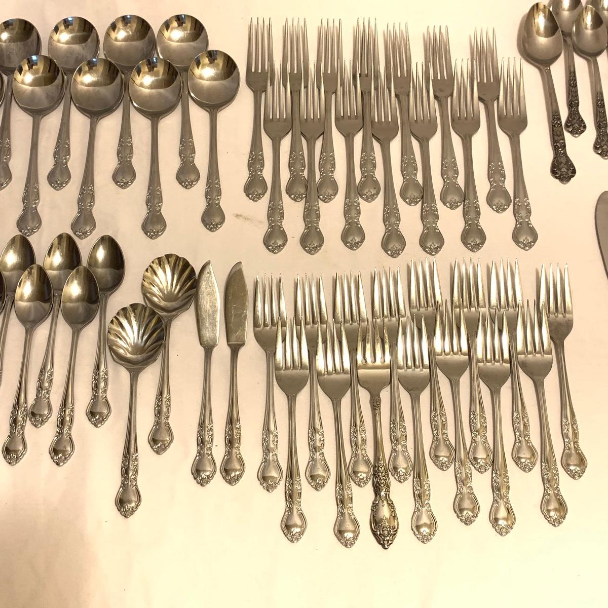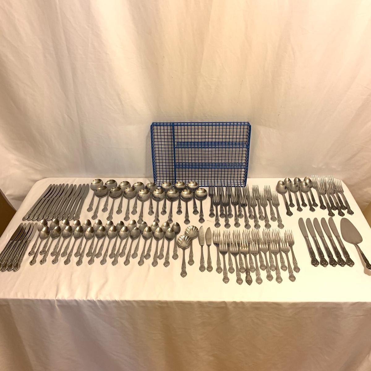 This lot includes two sets of flatware and a blue silverware tray. The flatware is all stainless steel. The smaller set is Versailles by MSI Japan. It comes with six forks, five spoons and one big spoon, five knives, and a pie serving utensil. The larger set is Nasco Elizabethan II from Japan. It comes with 16 knives, 25 spoons, 16 soup spoons, 14 salad forks, 14 dinner forks, two butter knives, and two scalloped spoons. All flatware is in gently used condition. Shipping available.