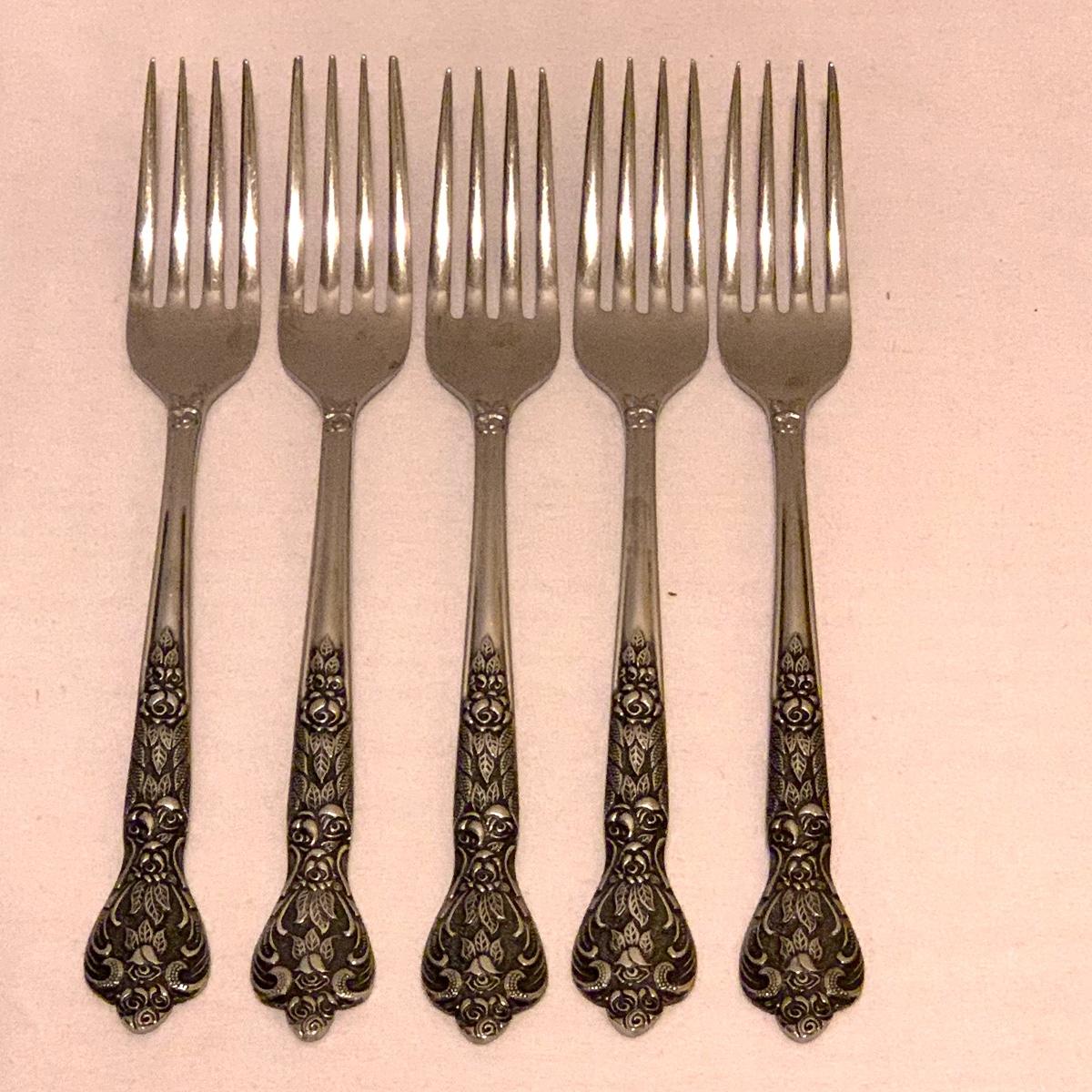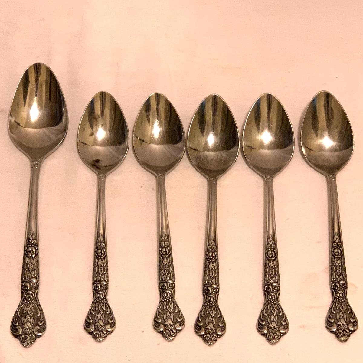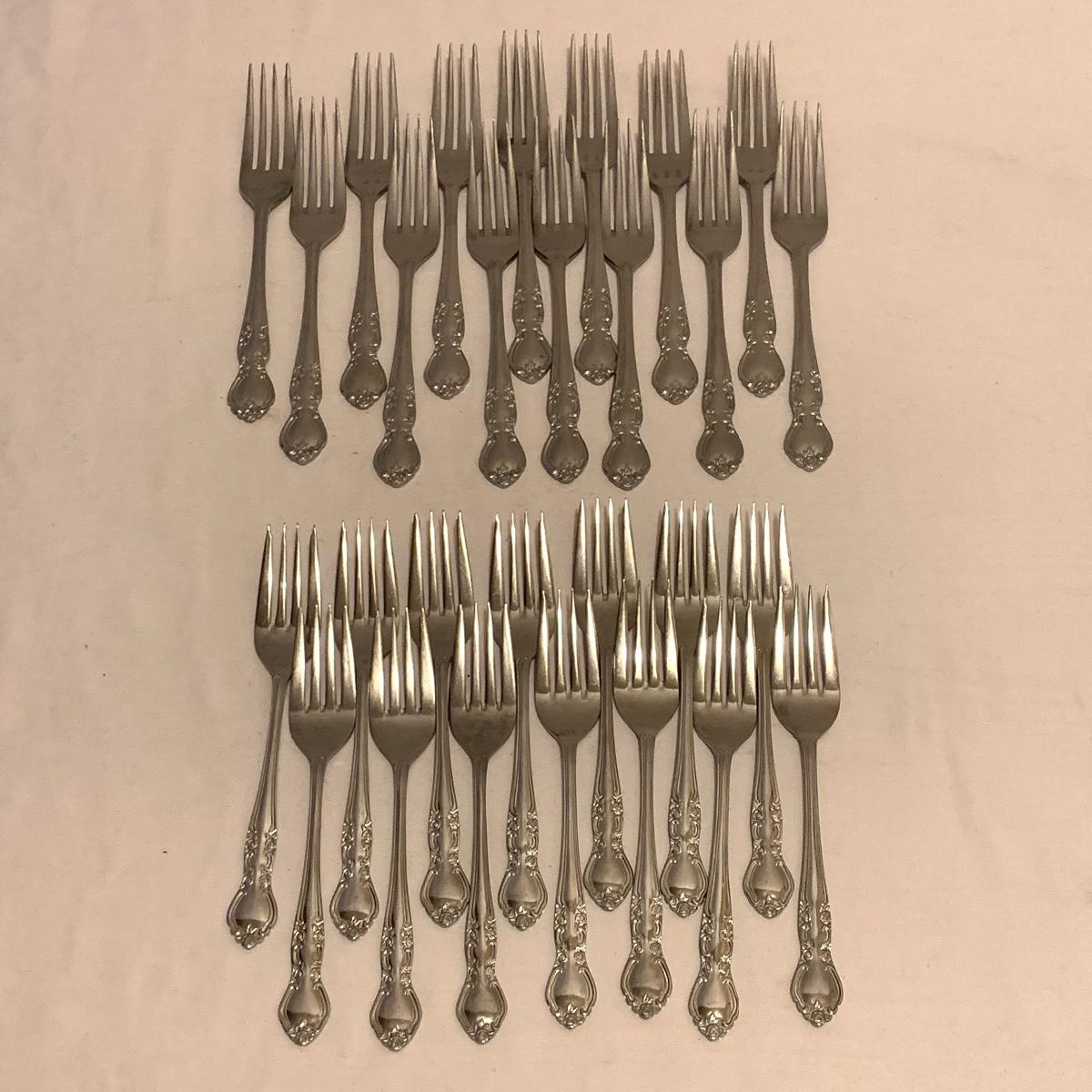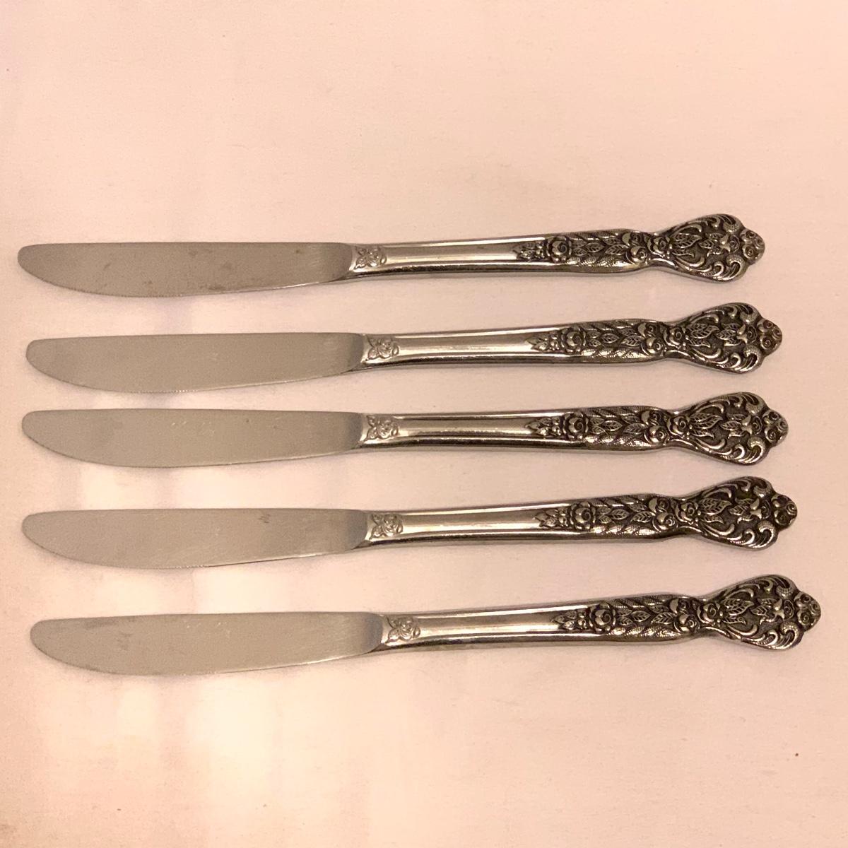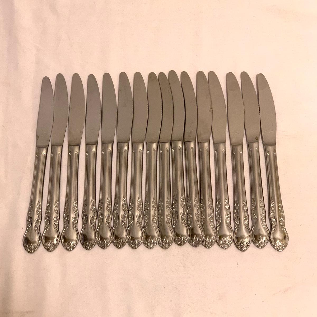 This lot includes two sets of flatware and a blue silverware tray. The flatware is all stainless steel. The smaller set is Versailles by MSI Japan. It comes with six forks, five spoons and one big spoon, five knives, and a pie serving utensil. The larger set is Nasco Elizabethan II from Japan. It comes with 16 knives, 25 spoons, 16 soup spoons, 14 salad forks, 14 dinner forks, two butter knives, and two scalloped spoons. All flatware is in gently used condition. Shipping available.