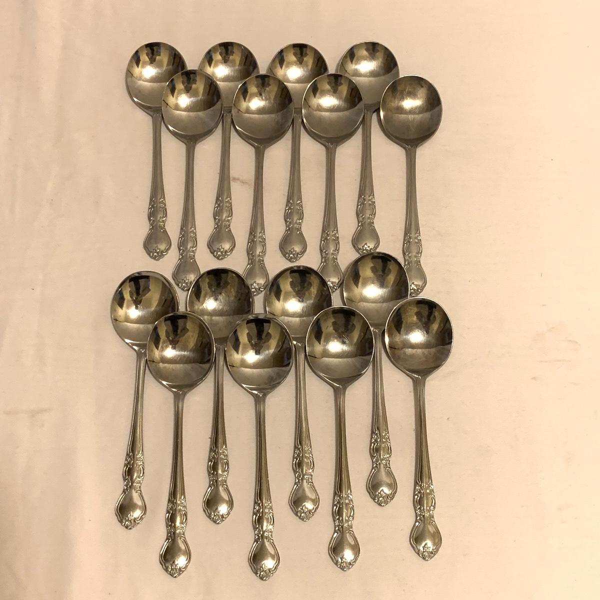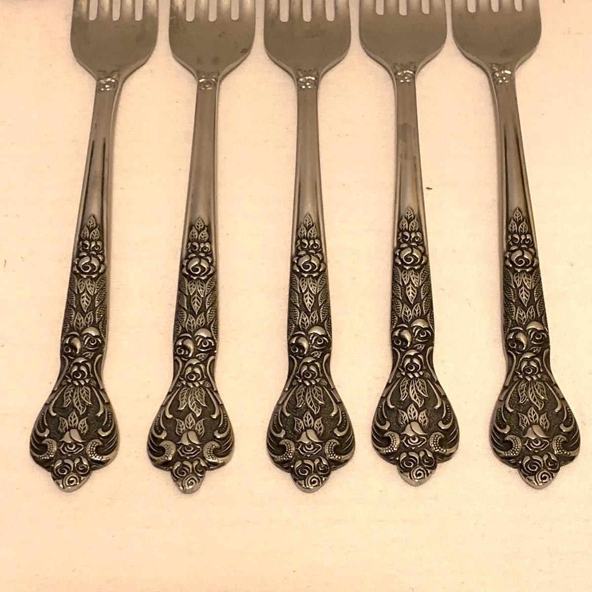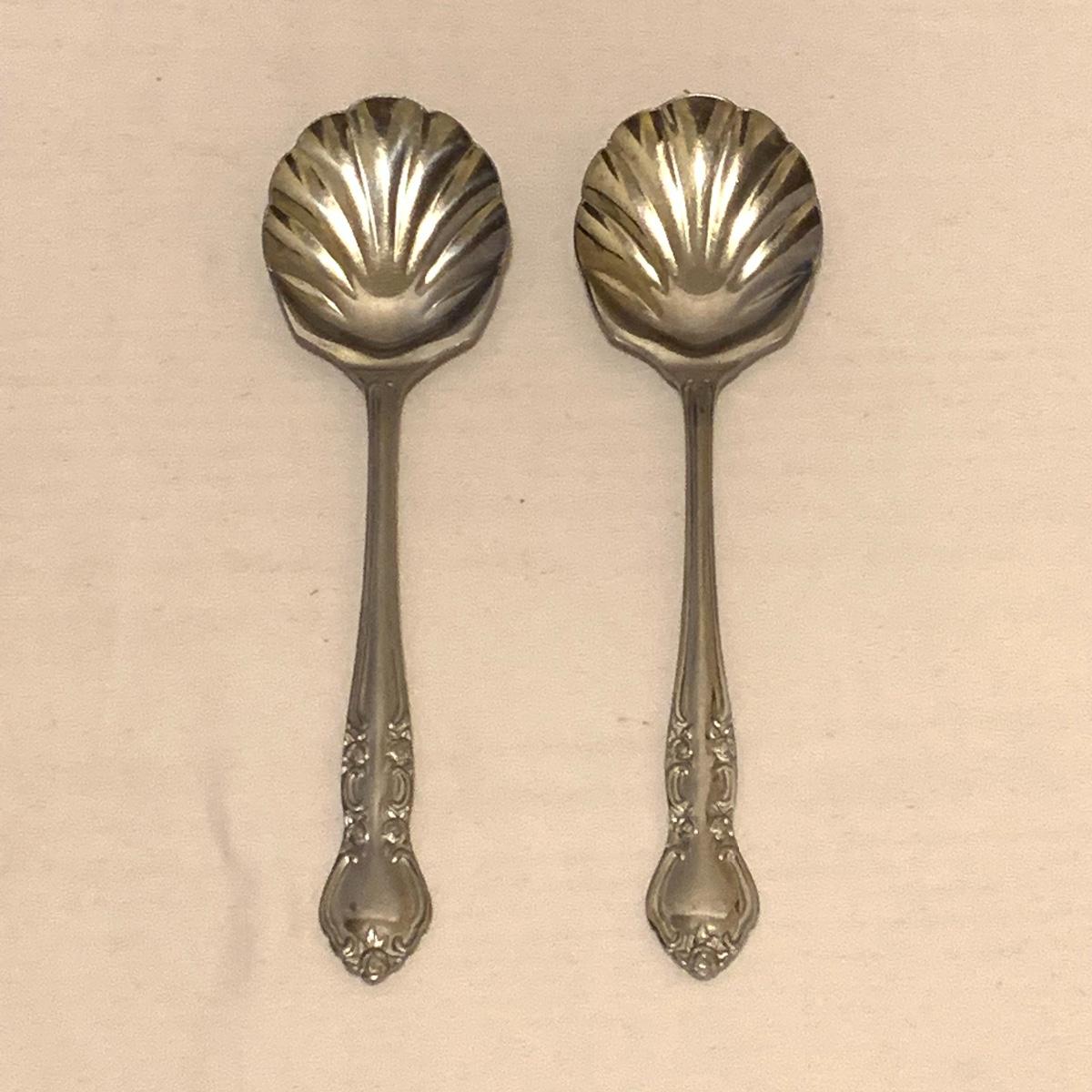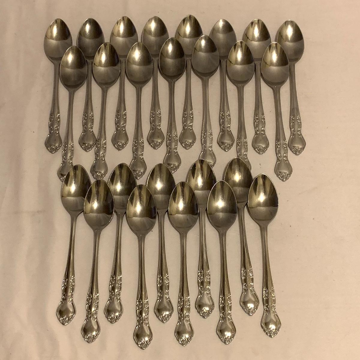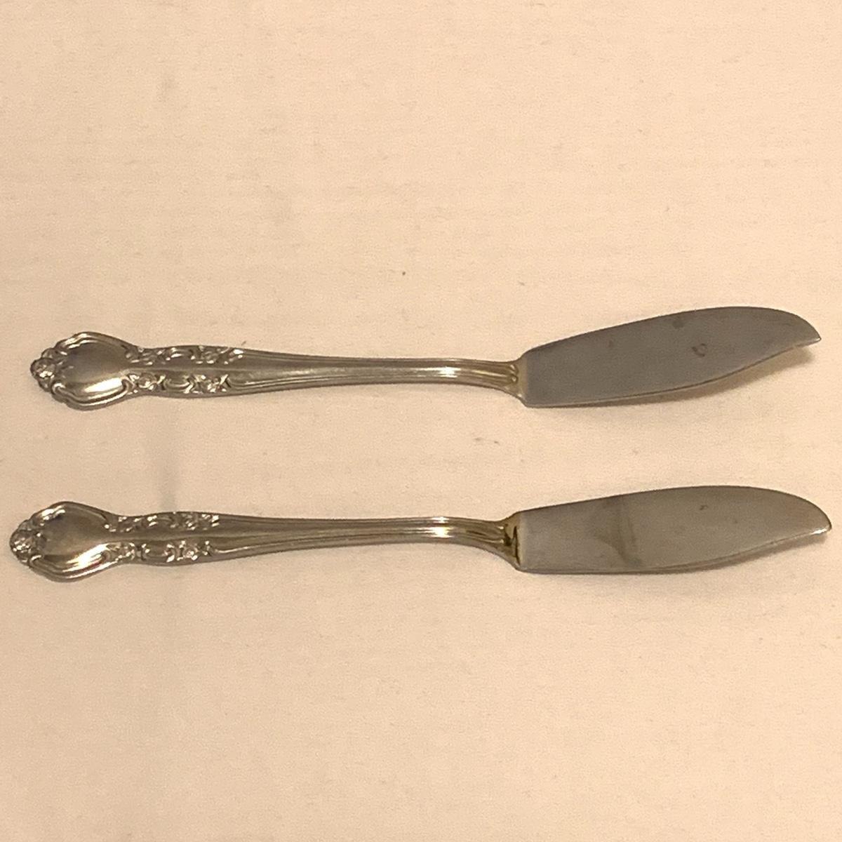 This lot includes two sets of flatware and a blue silverware tray. The flatware is all stainless steel. The smaller set is Versailles by MSI Japan. It comes with six forks, five spoons and one big spoon, five knives, and a pie serving utensil. The larger set is Nasco Elizabethan II from Japan. It comes with 16 knives, 25 spoons, 16 soup spoons, 14 salad forks, 14 dinner forks, two butter knives, and two scalloped spoons. All flatware is in gently used condition. Shipping available.